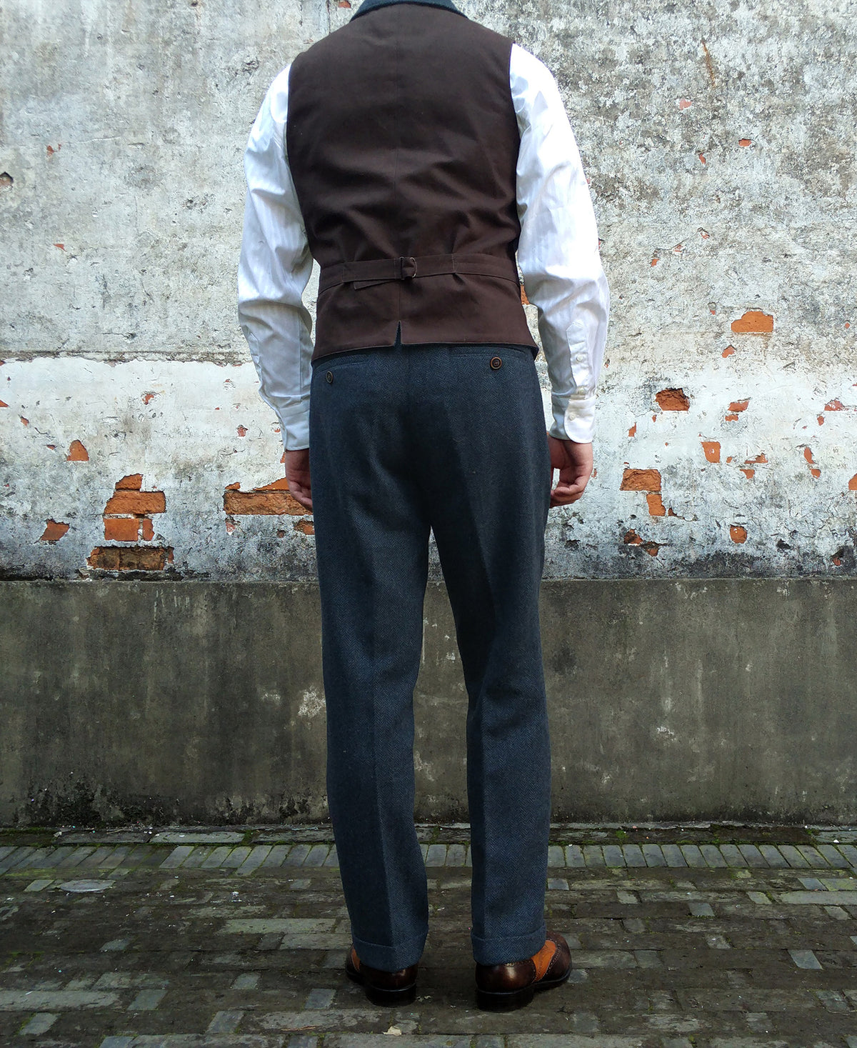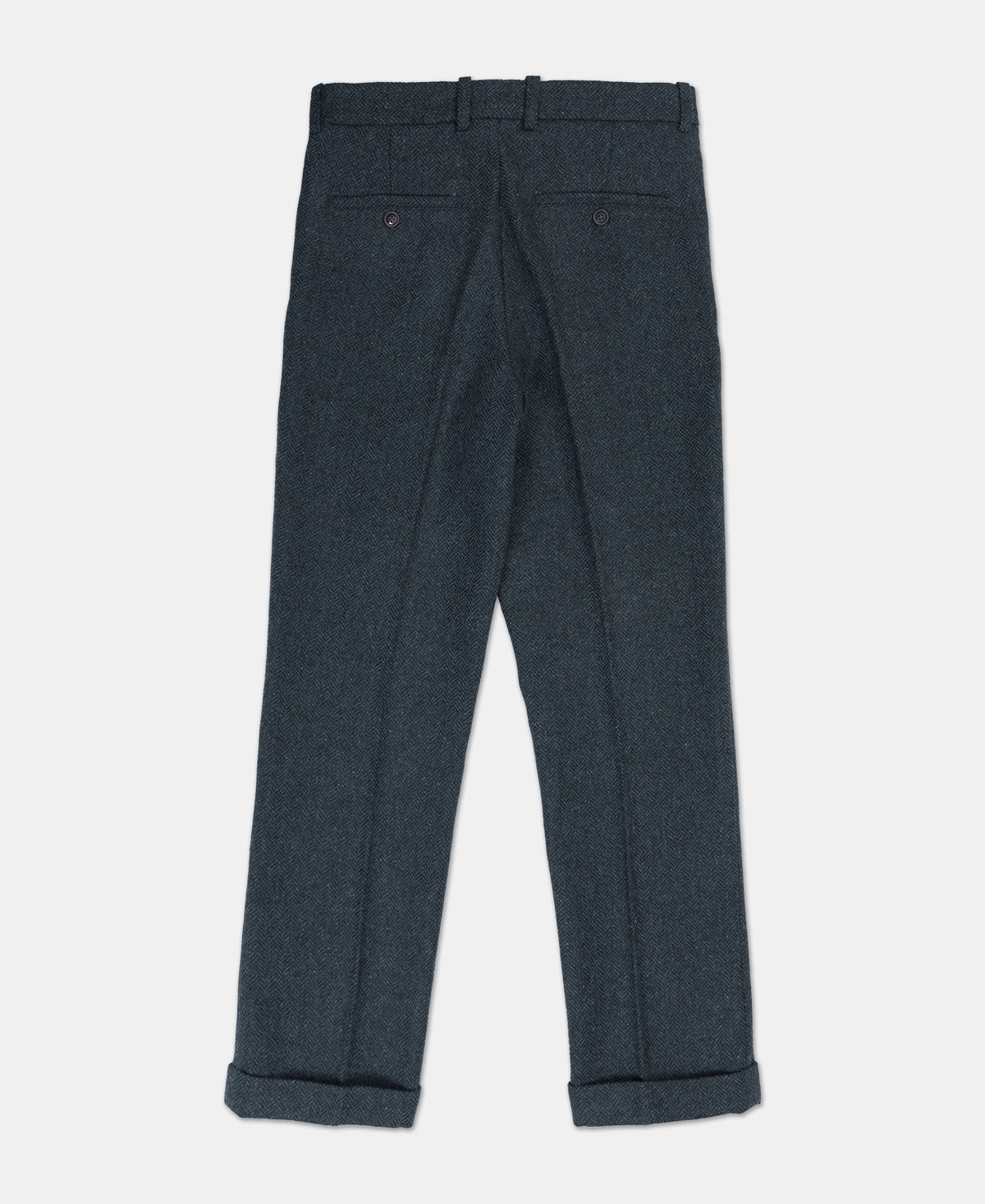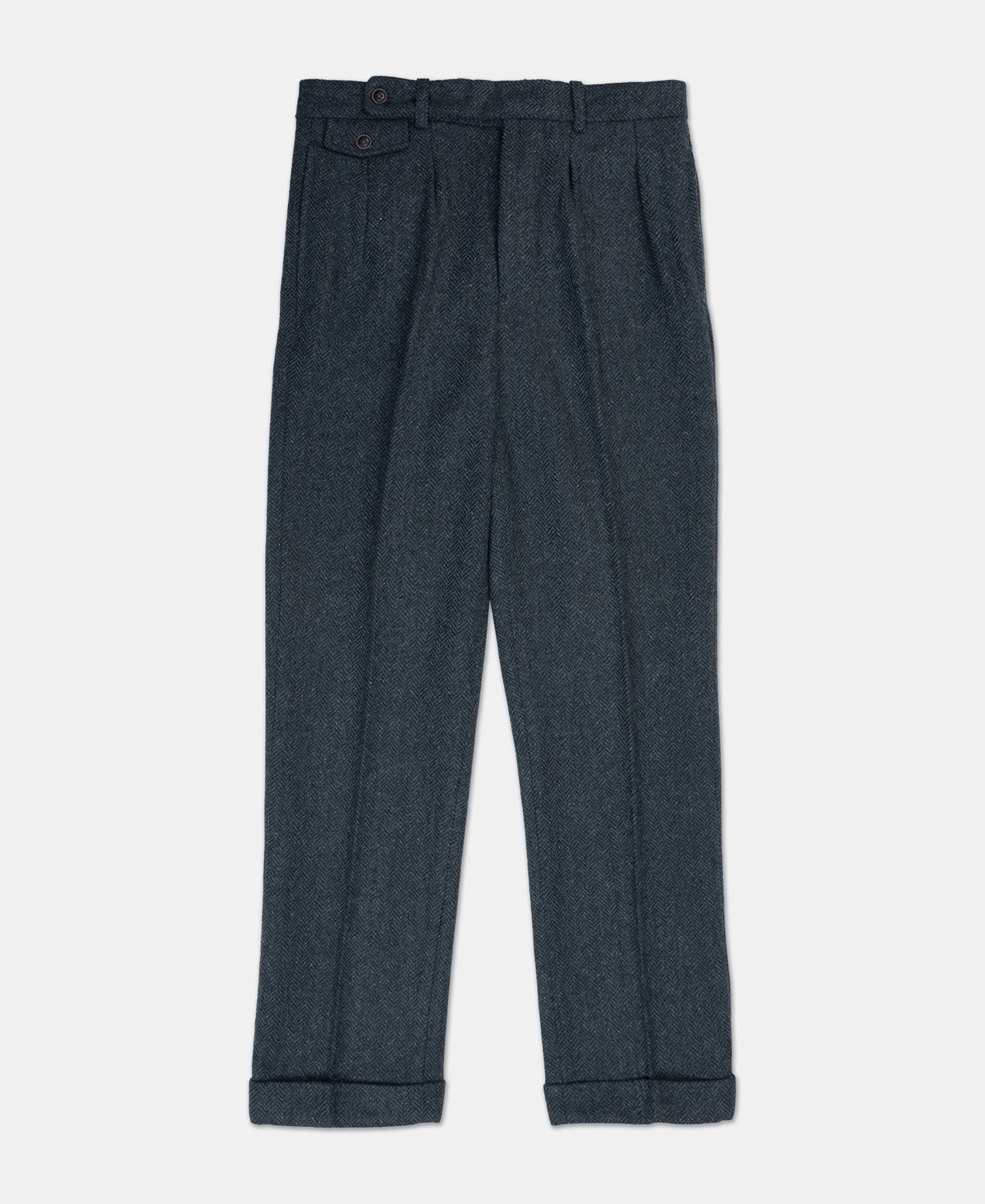 These trousers are inspired by 1930s American style. Made from 100% wool tweed with a Japan Bemberg lining, they feature a yarn-dyed cotton waistband and cotton herringbone twill pocket lining.