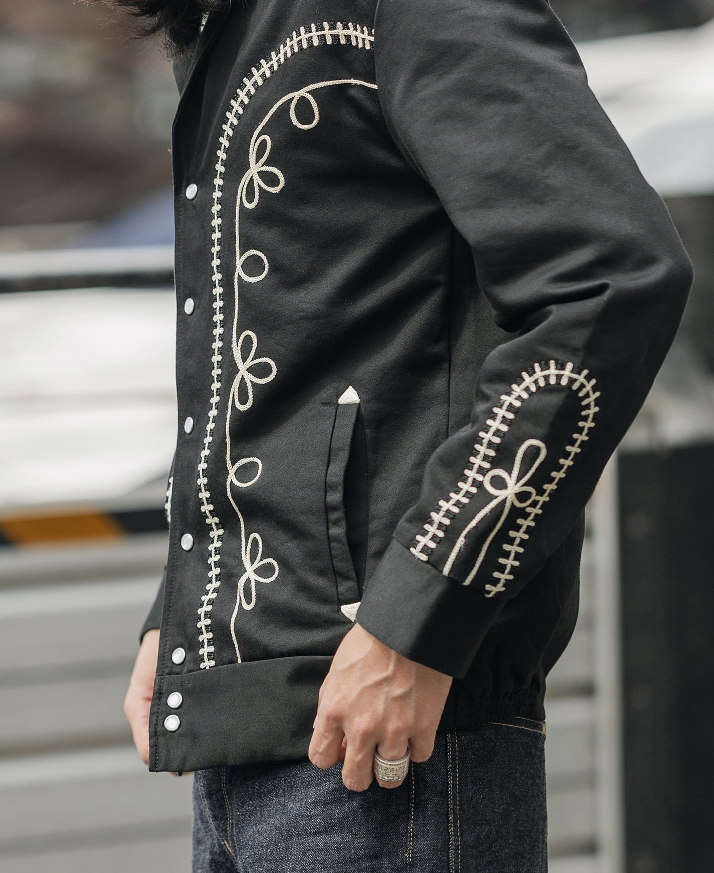 1950년대 볼레로 뮤지션 재킷에서 영감을 받아, 광택 있는 코튼 새틴 소재에 정교한 핸드 크랭크 자수 장식을 더했습니다. 살짝 역삼각형 핏, 부드럽게 떨어지는 숄더, 인조 진주 스냅 버튼, 그리고 실크처럼 부드러운 안감이 특징이며, 봄과 가을에 착용하기 좋습니다. 추가 수축을 방지하기 위해 가먼트 워싱 처리되었습니다.