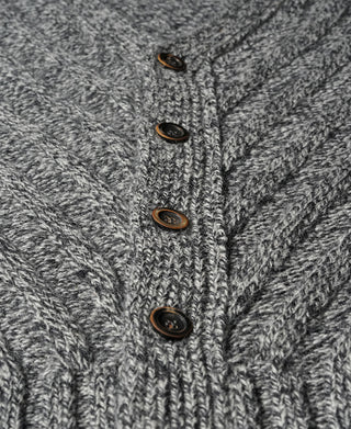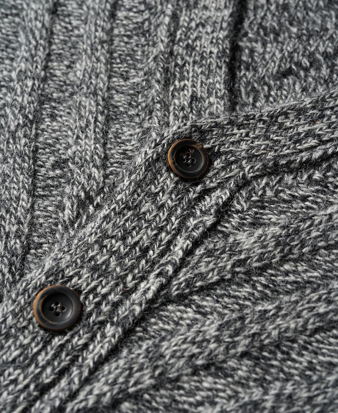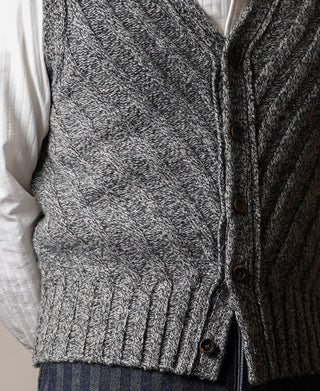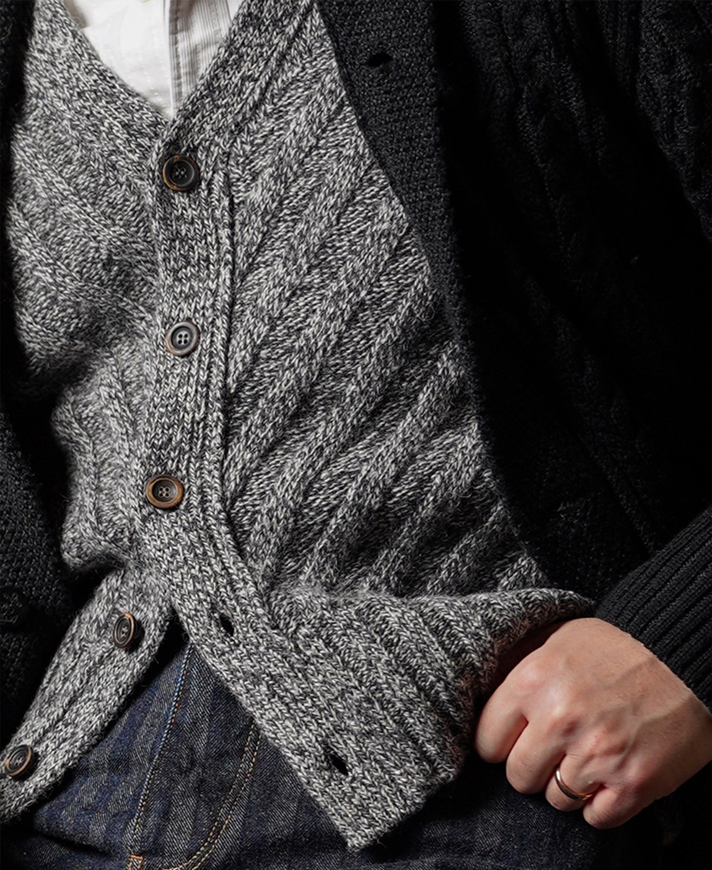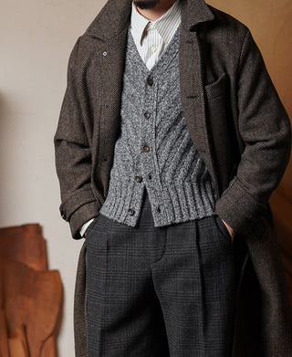 1950년대의 독특한 자카드 니트 베스트에서 영감을 받은 이 디자인은 빈티지 크롭 실루엣으로, 하이웨이스트 팬츠와 매우 잘 어울립니다. 얼룩덜룩한 회색 영국 셰틀랜드 울 혼방 소재로 제작되어 뛰어난 보온성과 향상된 볼륨감을 제공하며, 20세기 초 영국 니트웨어의 특징을 충실히 재현합니다.
