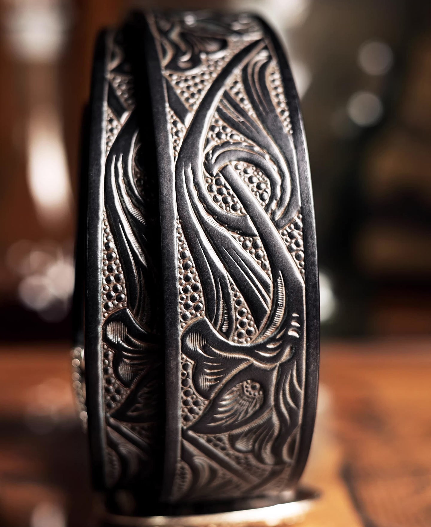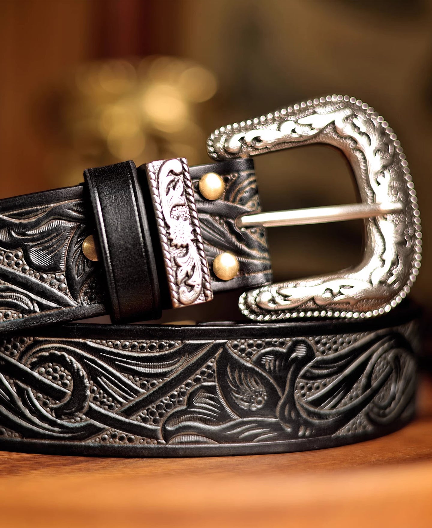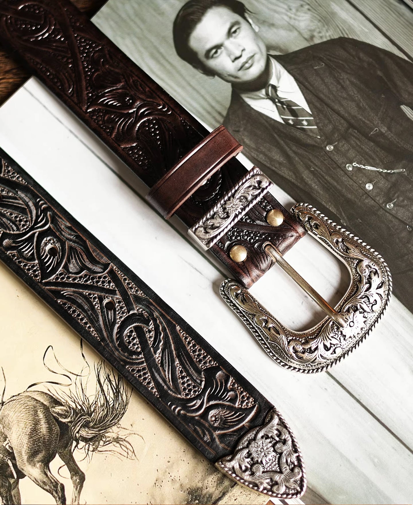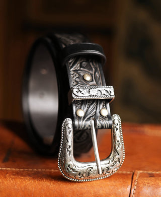 • 벨트는 두께 4.0mm의 이탈리아 가죽으로 제작되었으며, 은도금 황동 버클과 황동 리벳이 사용되었습니다. 수공예품으로, 도구로 장식된 아라베스크 디자인이 특징입니다. 처음에는 뻣뻣했지만 착용하면 부드러워져 다양한 스타일에 잘 맞습니다.