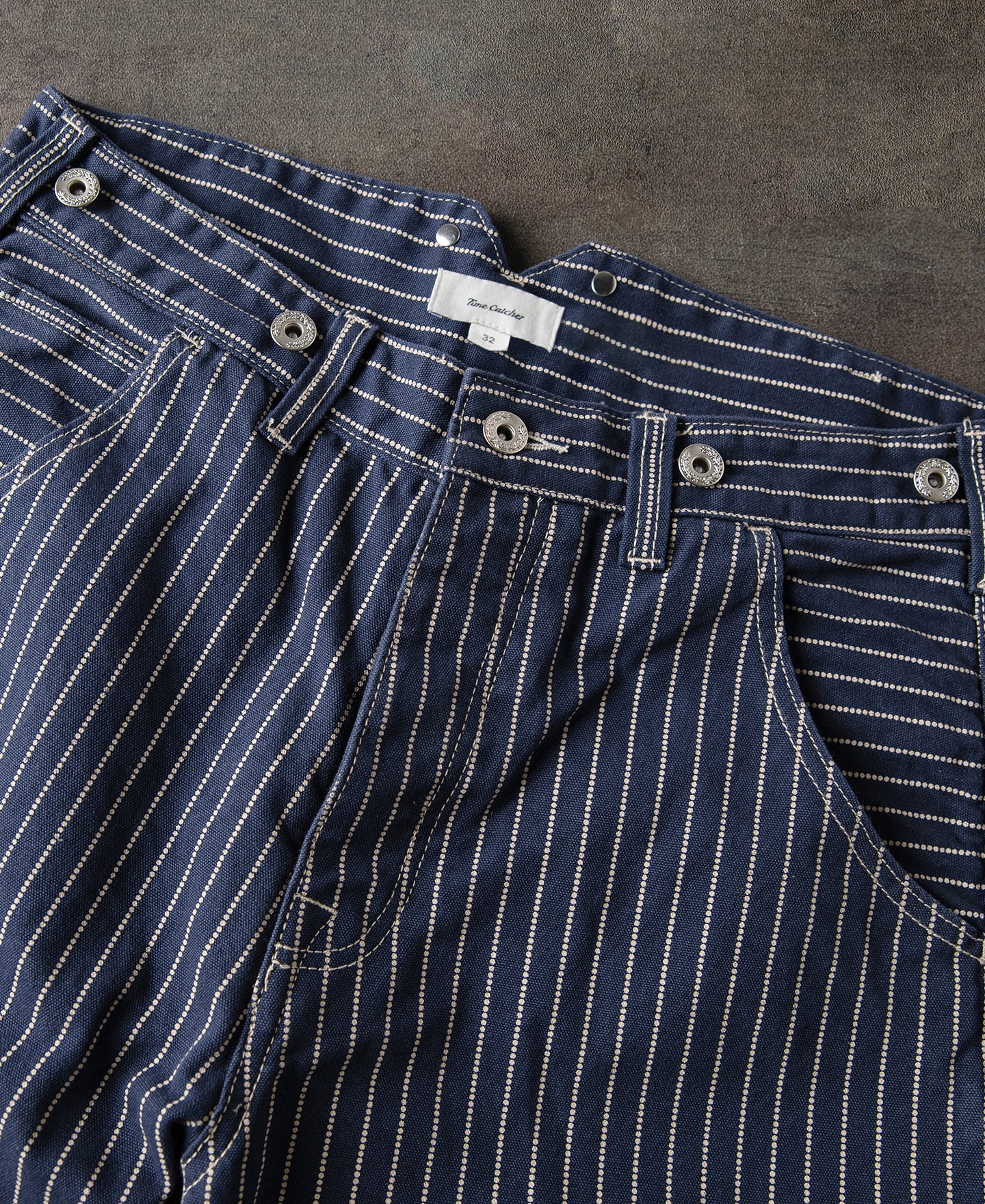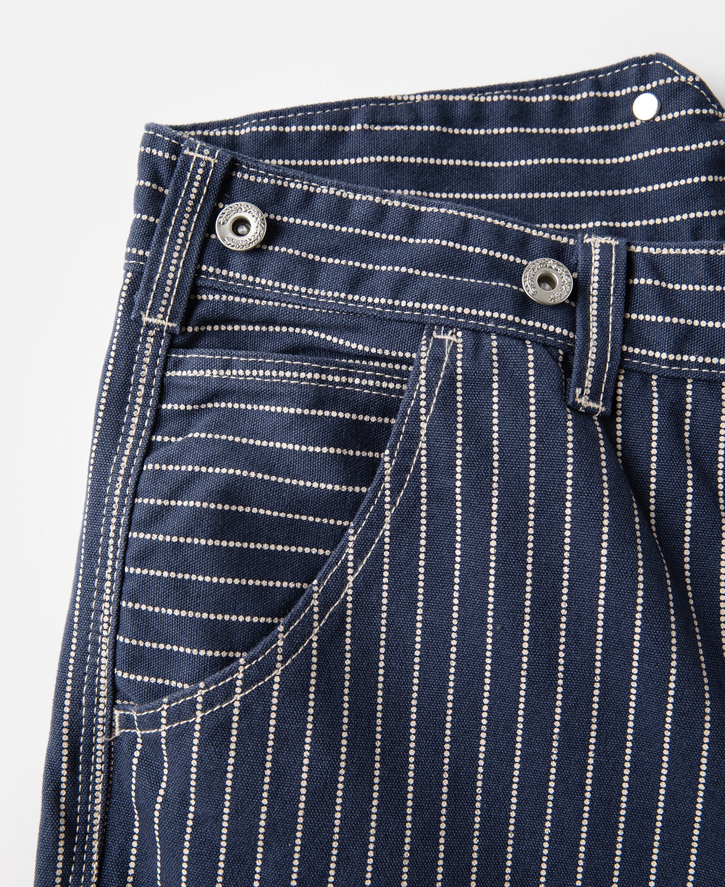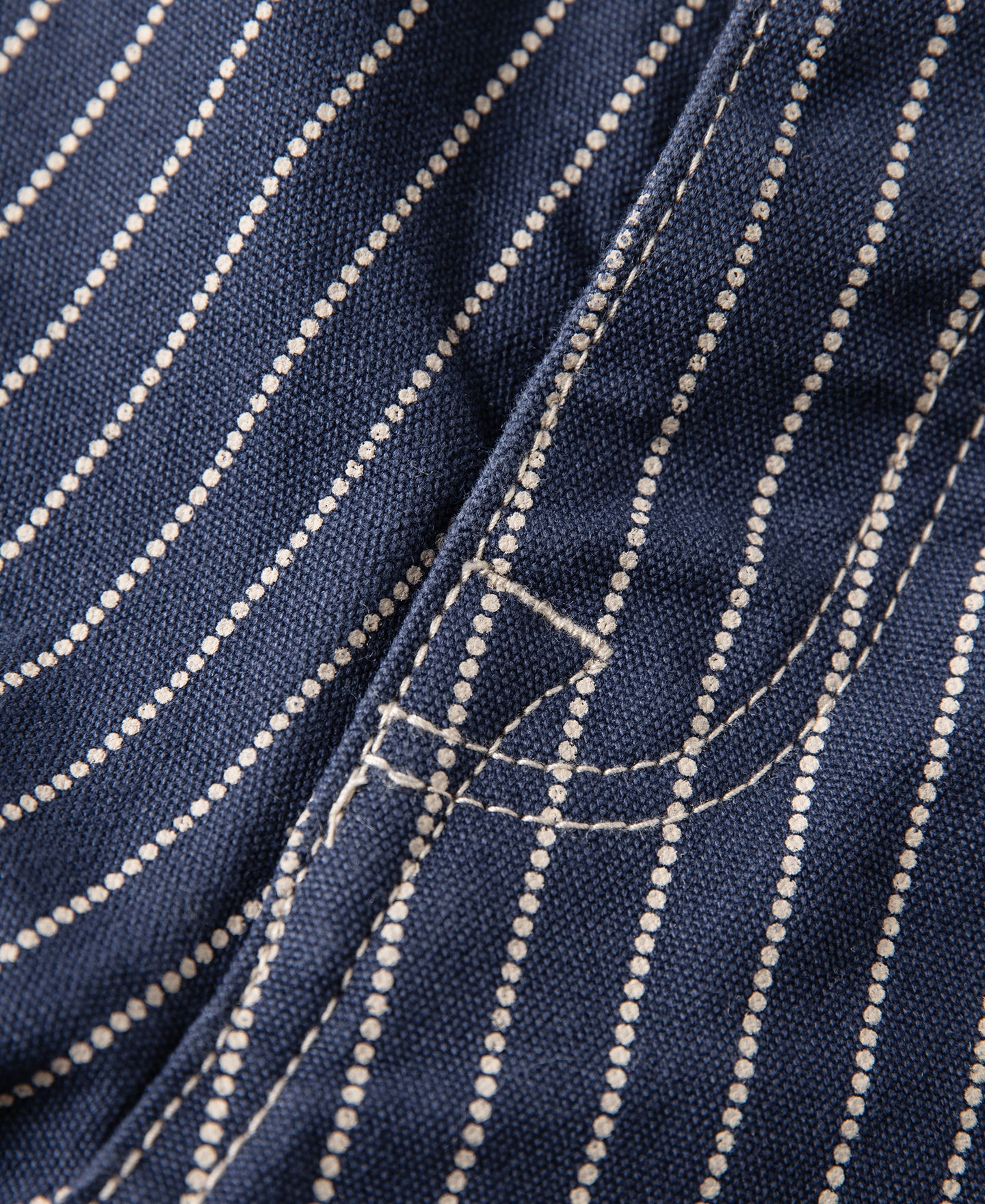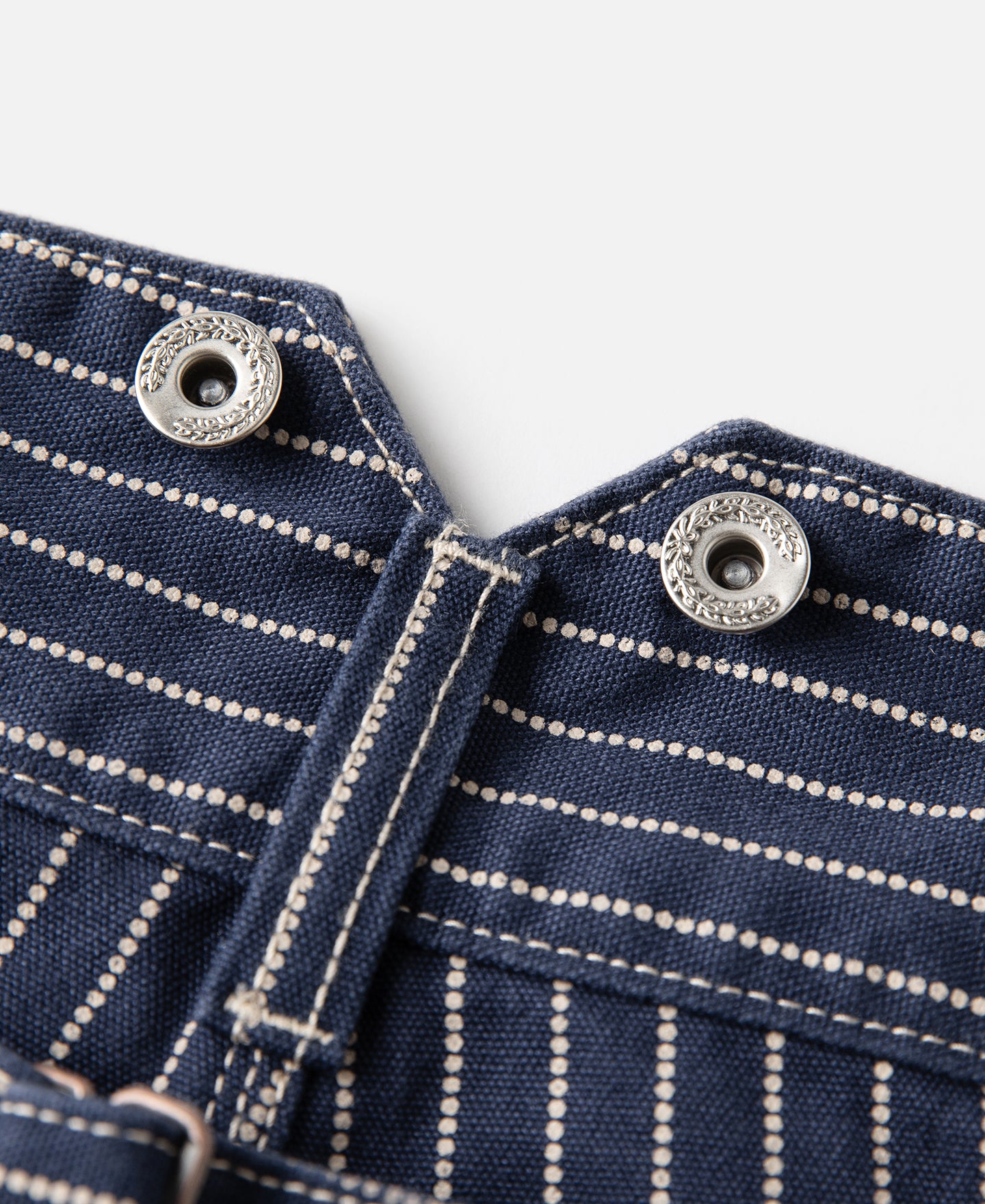 이 워배시 스트라이프 워크 팬츠는 내구성이 뛰어난 12온스 스트라이프 데님 소재로 제작되어 봄, 가을, 초겨울에 착용하기 좋습니다. 여유로운 스트레이트 레그 핏에 올리브 가지 모티프가 새겨진 7개의 합금 허리 단추와 뒷면의 구리 파리 버클로 길이 조절이 가능하며, 클래식 서스펜더 워크웨어의 시대를 초월하는 요소를 그대로 살렸습니다.
