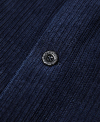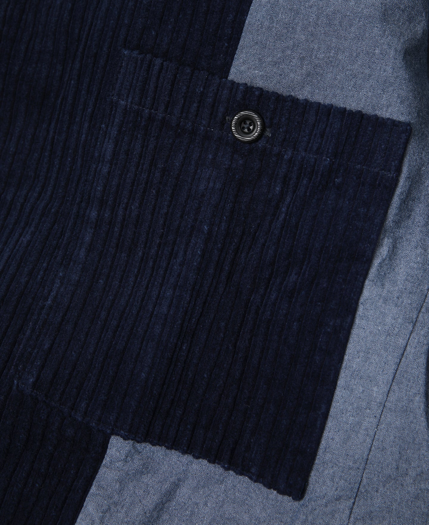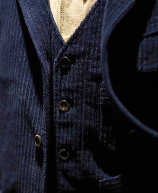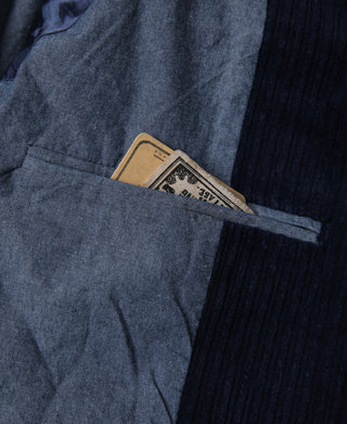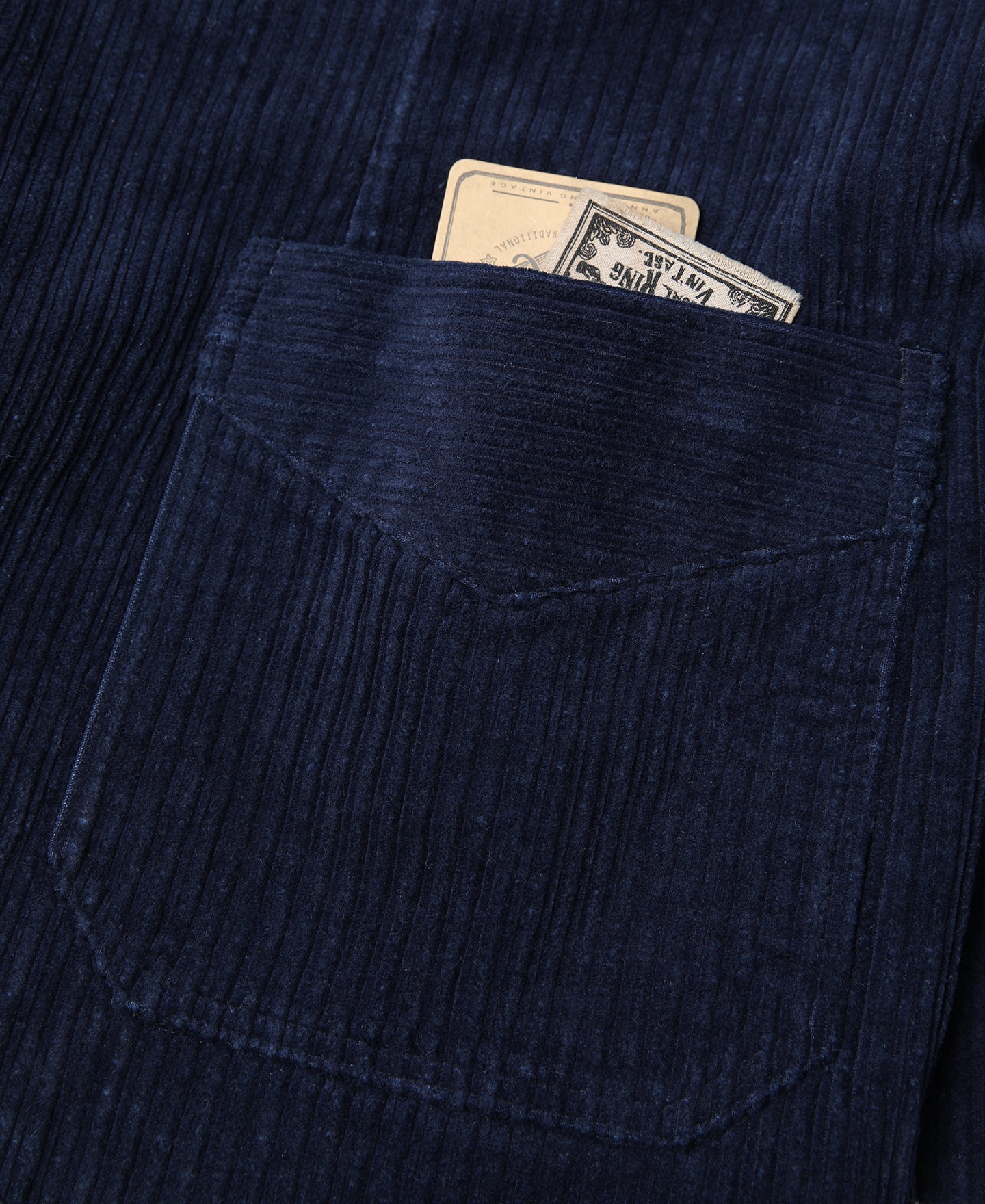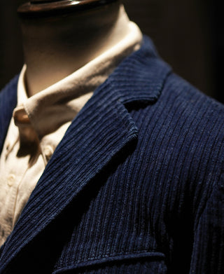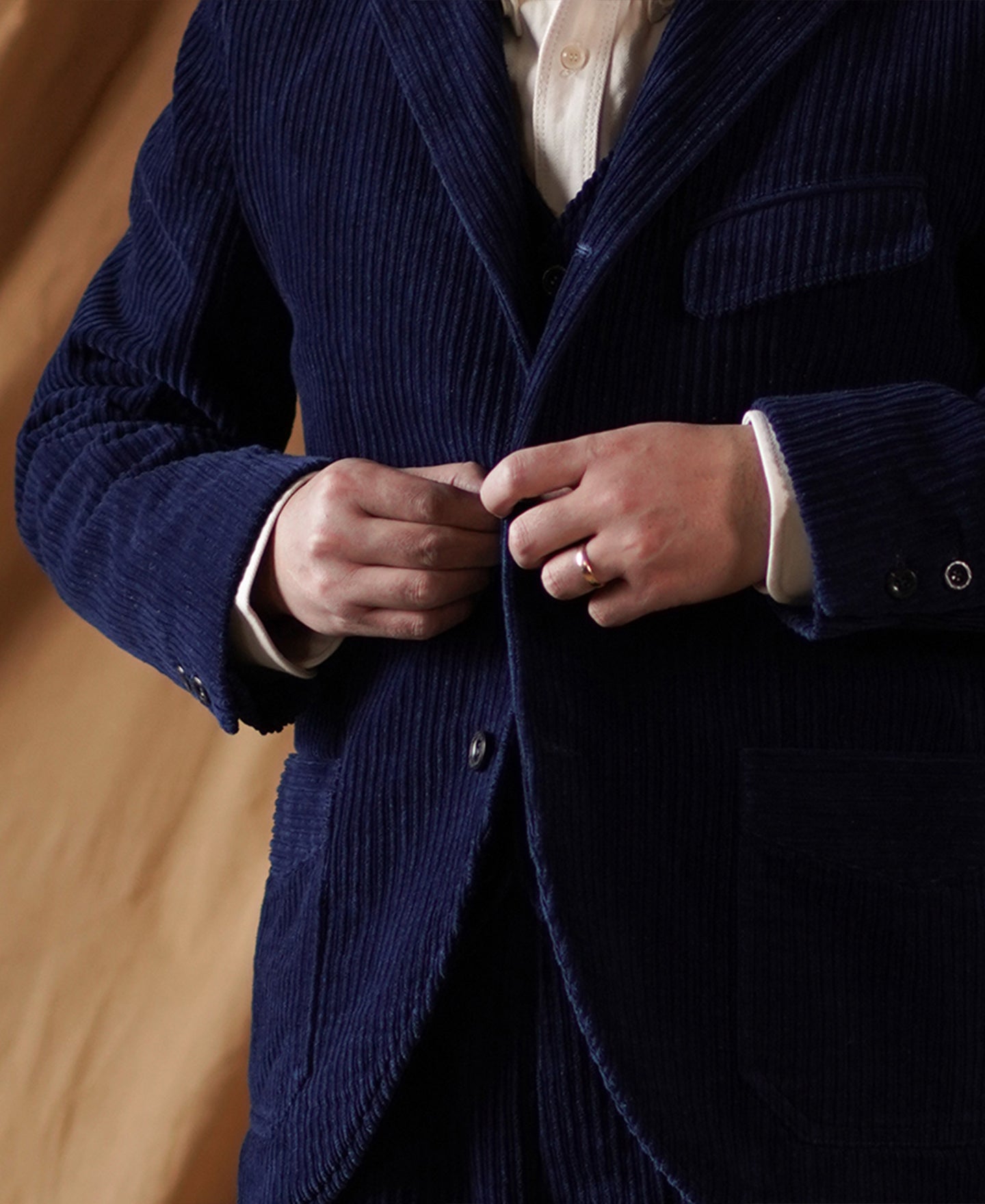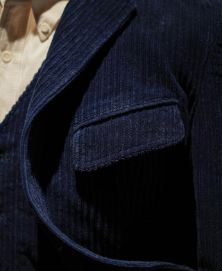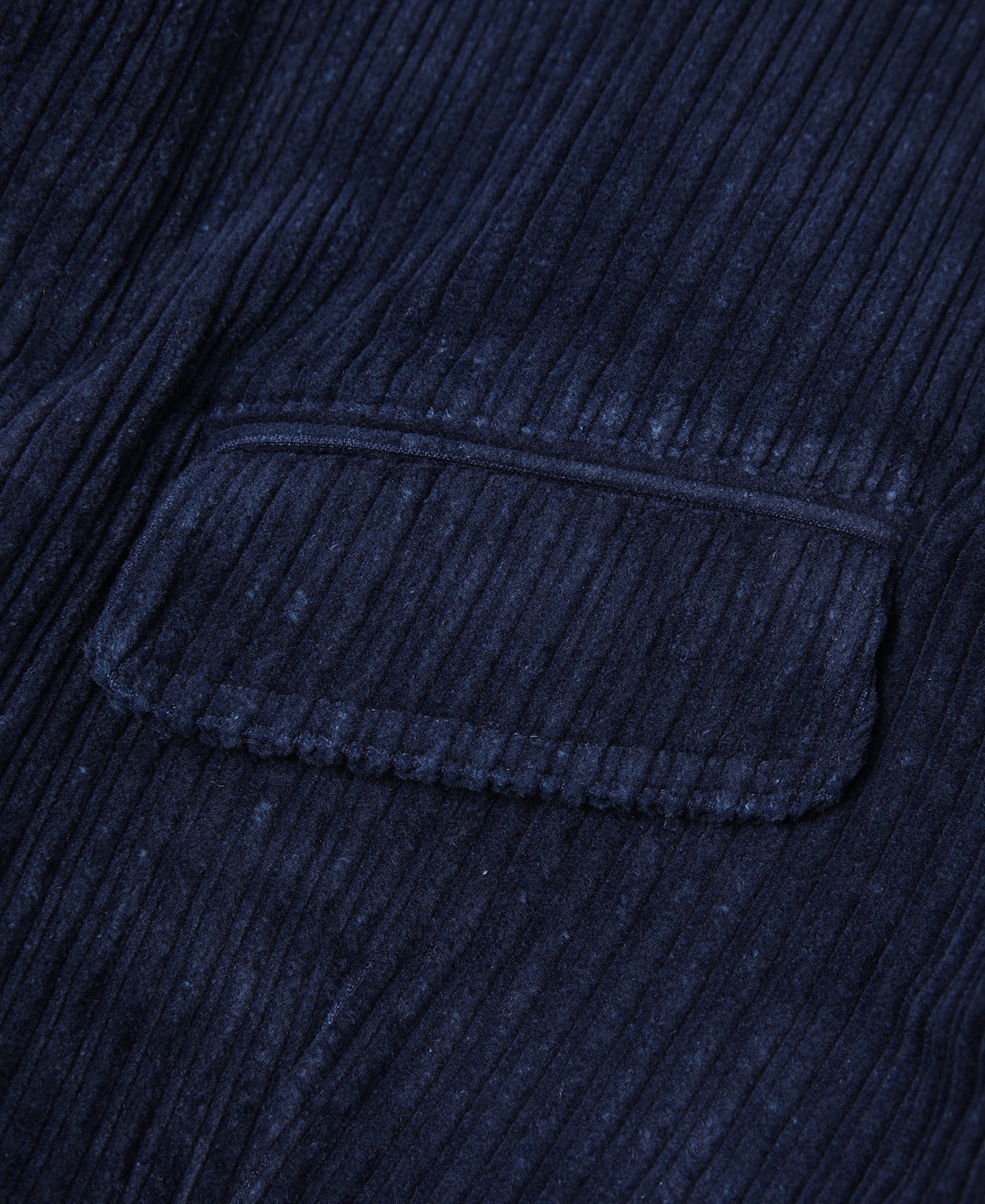 클래식한 인디고 염색의 두껍고 얇은 줄무늬 코듀로이 원단으로 제작된 기본 소재는 독특한 질감과 외관을 제공합니다. 다양한 폭의 벨벳 스트라이프는 의상에 시각적인 흥미와 개성을 더해줍니다. 스웨이드는 고급스럽고 부드러우며, 고밀도 샴브레이 천 안감과 일본산 벰베르그 천 소매 안감이 더해져 편안함을 더해줍니다.