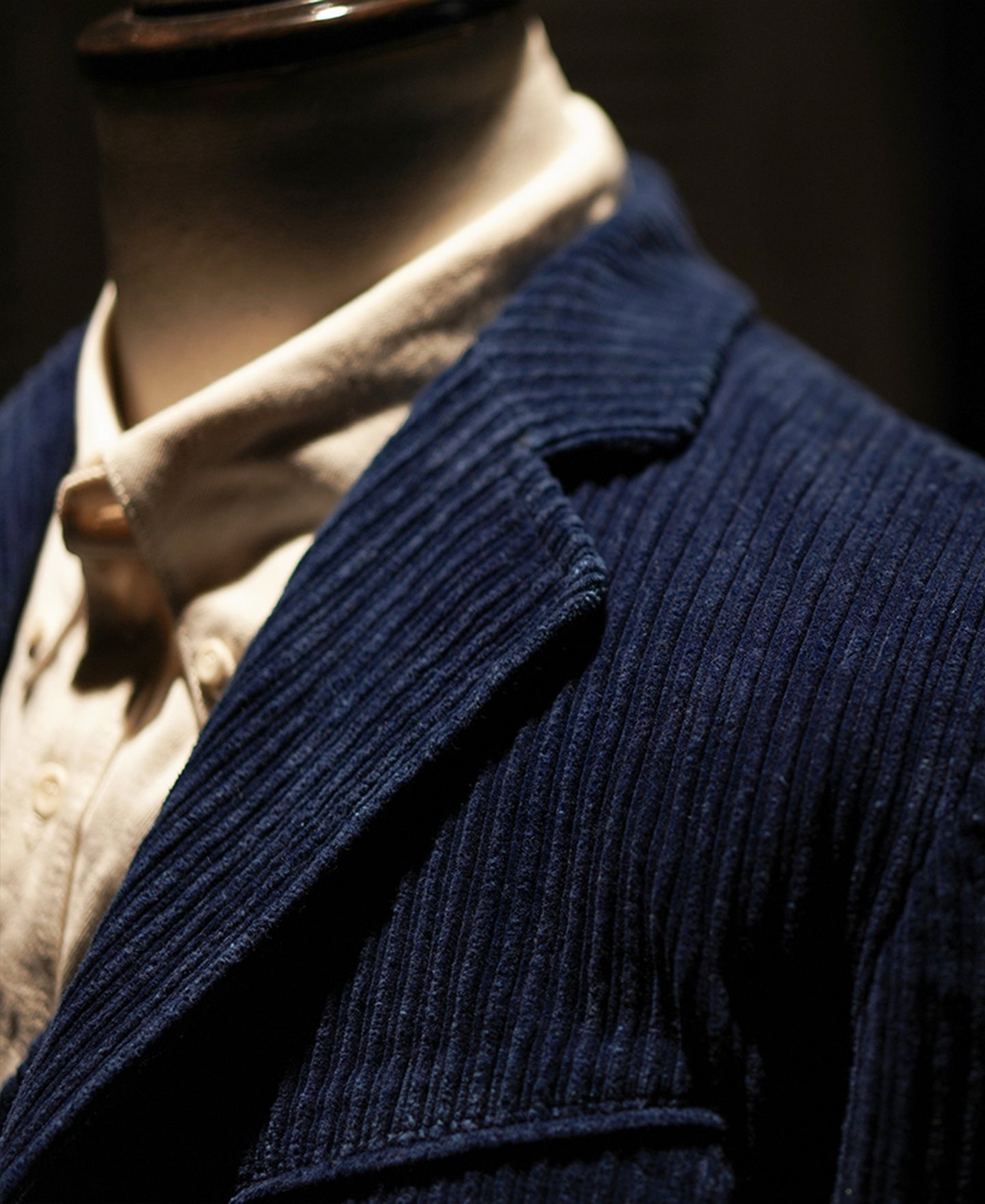 - 겉감: 면 100%, 인디고 염색된 두꺼운 줄무늬와 얇은 줄무늬의 코듀로이 직물. 밑깃: 울 70%, 비스코스 30%. 안감 : 고밀도 샴브레이 천 안감. 소매 안감: 100% 큐프로, Bemberg 제품.