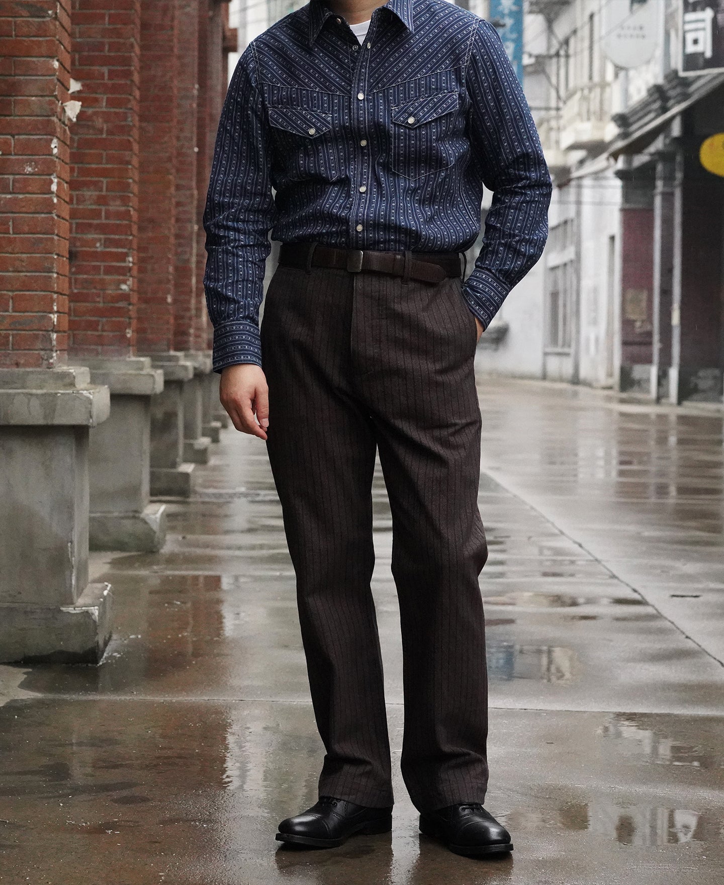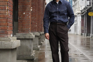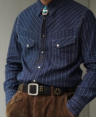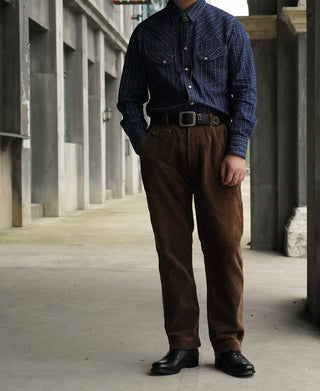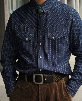 이 셔츠의 원단은 1880년대의 남색 염색 천에 약간의 변형을 가한 복제품입니다. 클래식한 인디고 색상과 질감을 유지하면서 현대적인 의류에 더 잘 어울리도록 실의 굵기를 늘리고 밀도를 높였습니다.