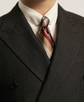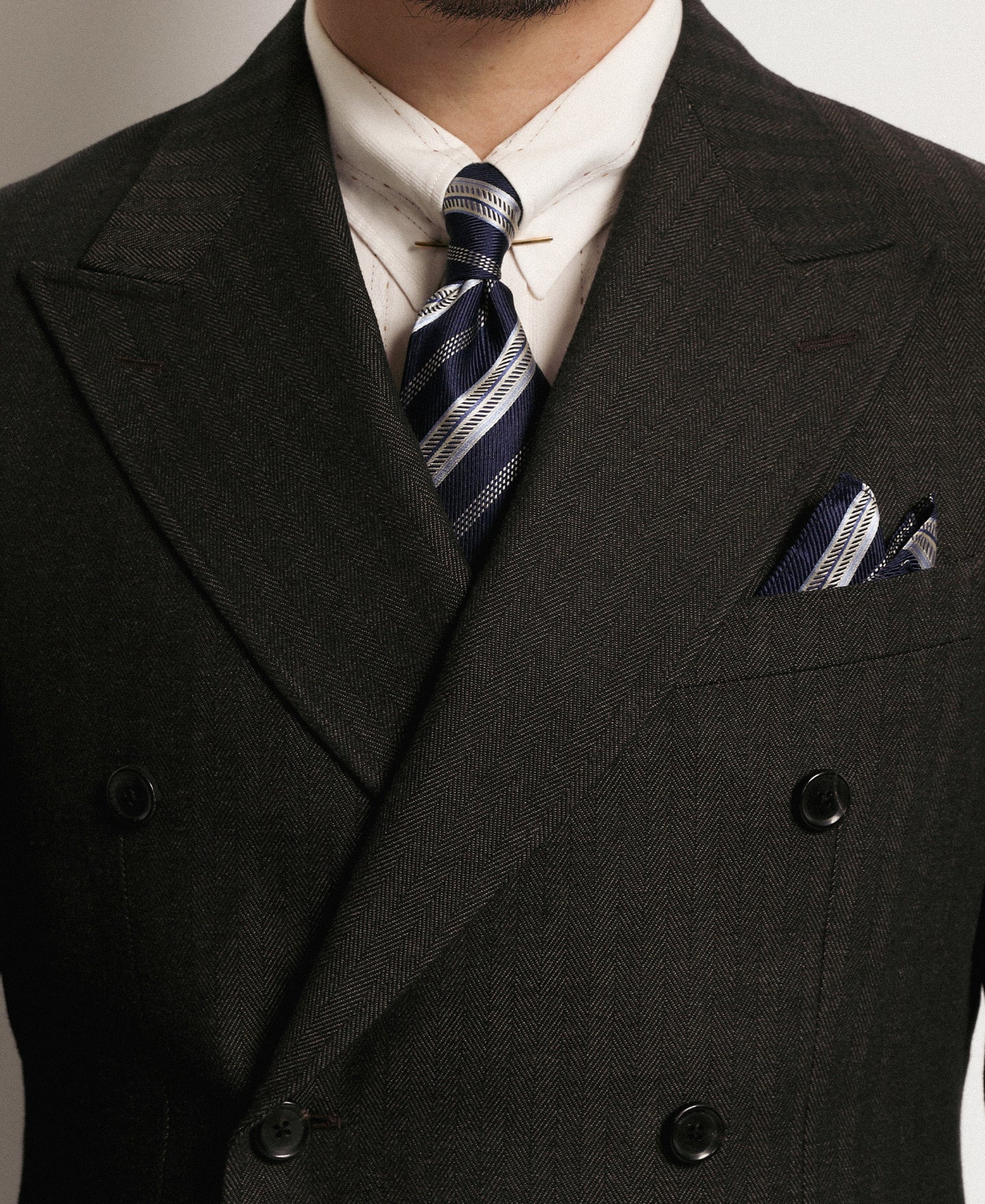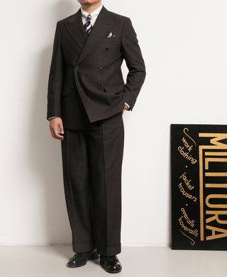 더블브레스트 슈트는 1930년대에 큰 인기를 얻었습니다. 현대 슈트에 비해 어깨가 약간 넓고, 기장이 짧으며, 허리가 딱 맞고, 뒷트임이 없으며, 라펠이 더 넓었습니다. 이 디자인은 신체 비율을 강조하여 자신감 넘치고 세련된 느낌을 주었습니다. 함께 입는 바지는 하이웨이스트에 와이드 레그 스타일로, 바깥쪽으로 주름이 잡히고 허리에 길이 조절 탭이 있는 경우가 많았습니다. 이 와이드 레그 팬츠는 전체적인 룩의 균형을 맞추는 동시에, 피트되는 재킷과 대비를 이루어 착용자의 체형을 강조하고, 앙상블에 세련되고 클래식한 느낌을 더했습니다.