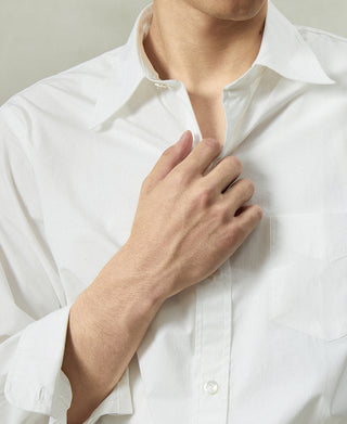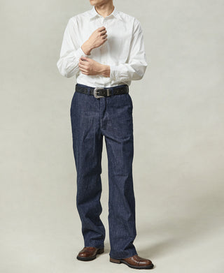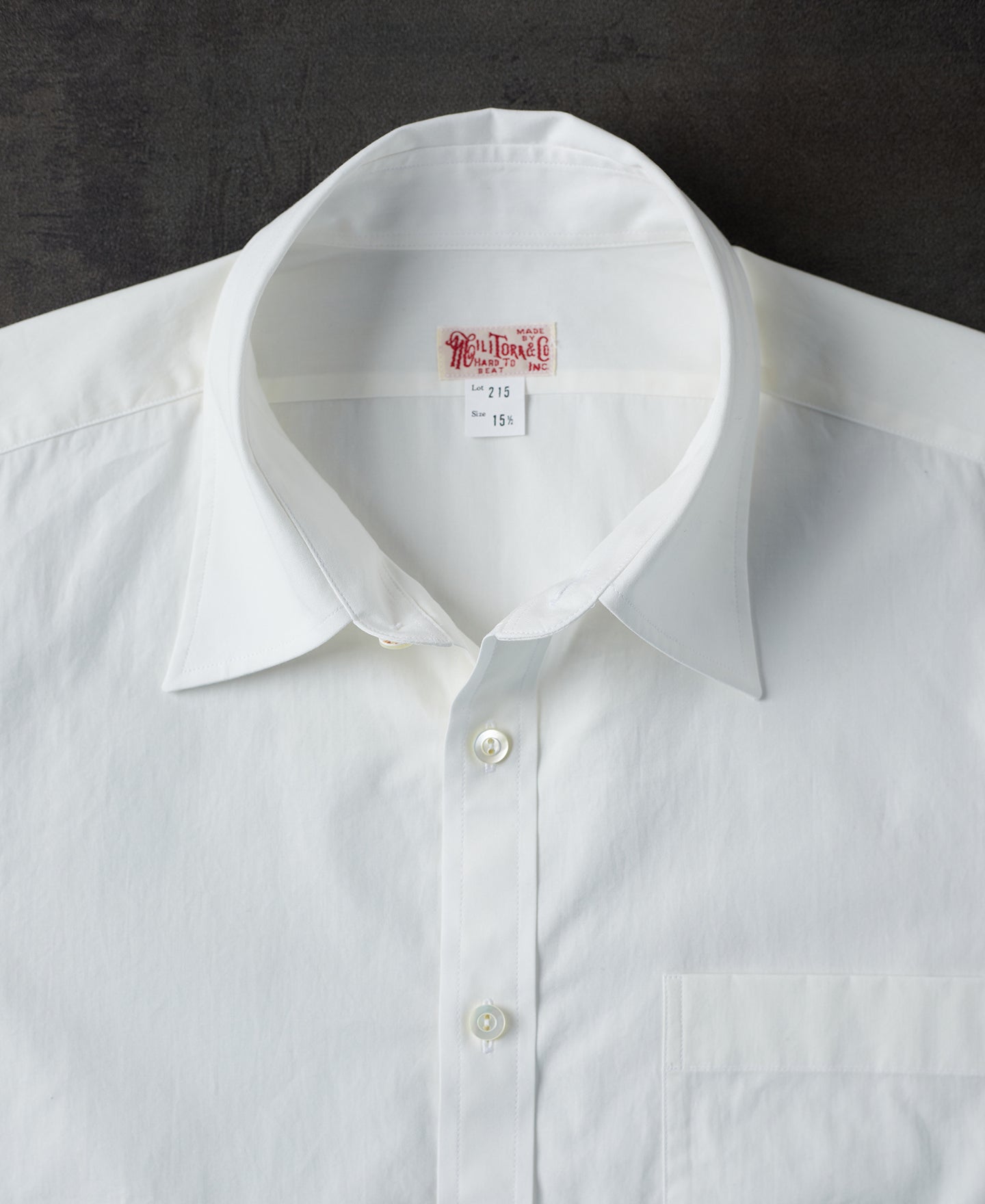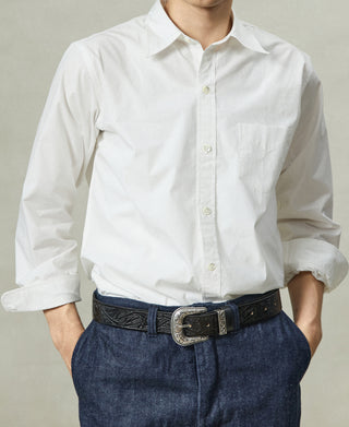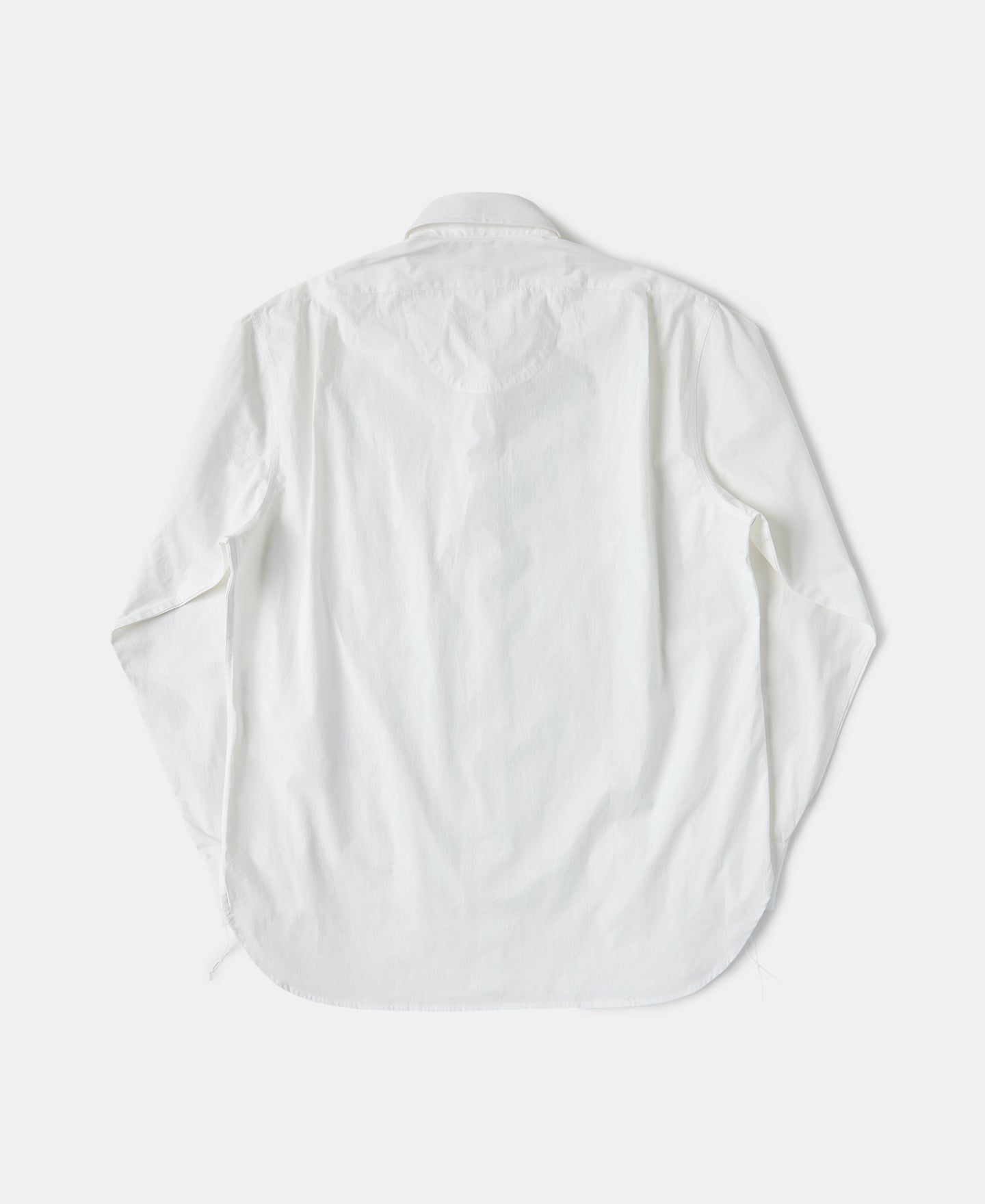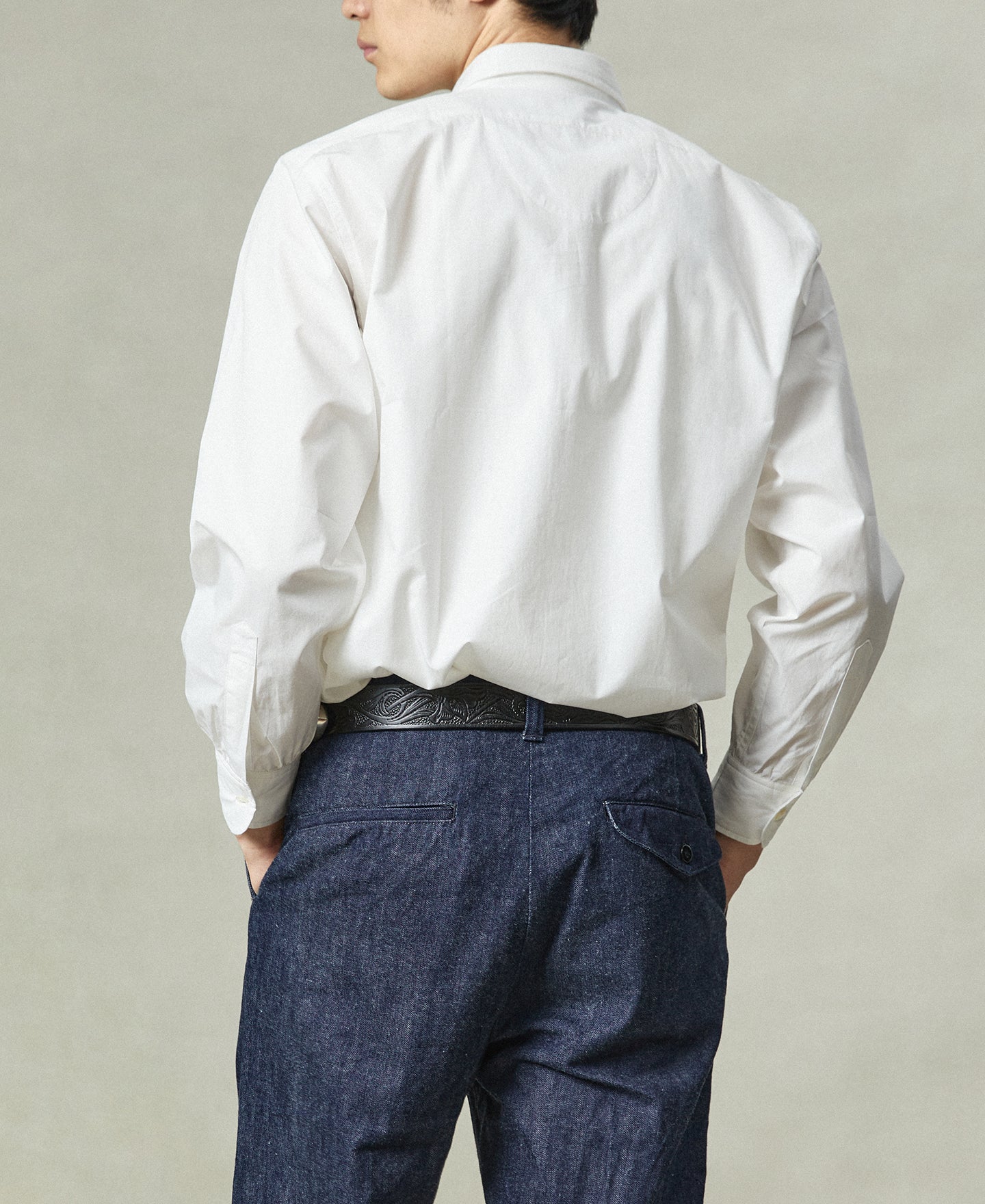 이 셔츠는 1930년대 디자인을 기반으로 합니다. 클래식한 포인트 칼라, 뾰족한 싱글 체스트 포켓, 그리고 뒷어깨에 시그니처인 반달 모양 보강 패치가 특징입니다. 이는 초기 드레스 셔츠의 상징적인 요소입니다.