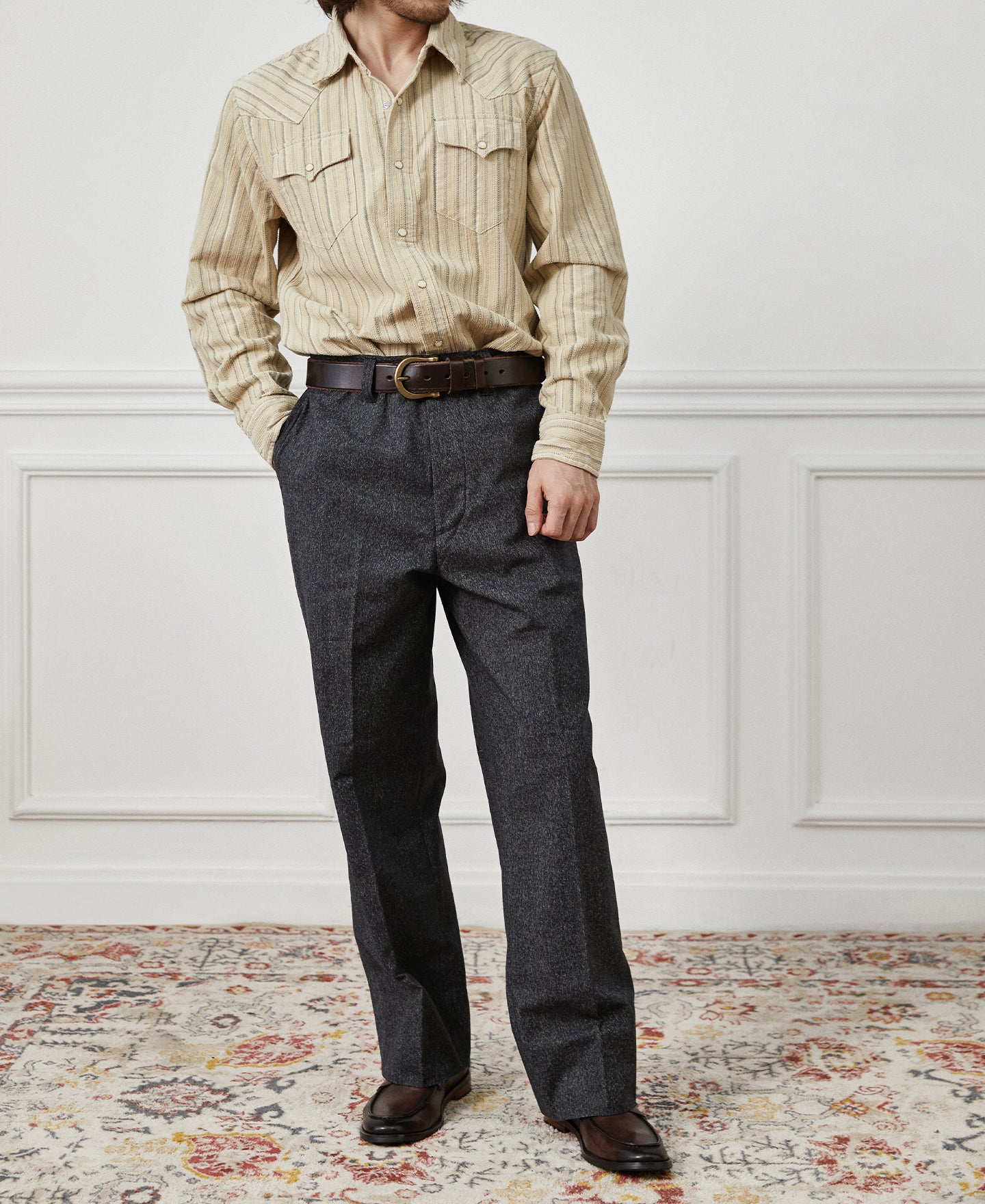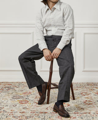 이 바지는 1940년대 5포켓 작업 바지에서 디자인 영감을 얻었으며, 특히 허벅지 부분이 넓은 레그 컷이 특징입니다. 맞춤 제작한 10온스 블랙 소금 후추 원단으로 만든 이 바지는 풍성하면서도 부피가 없는 핏을 제공하여 편안함과 깔끔하고 세련된 룩을 보장합니다. 모든 계절에 적합한 이 바지는 작업복 스타일과 세미드레스 행사에 모두 적합합니다.