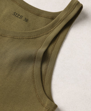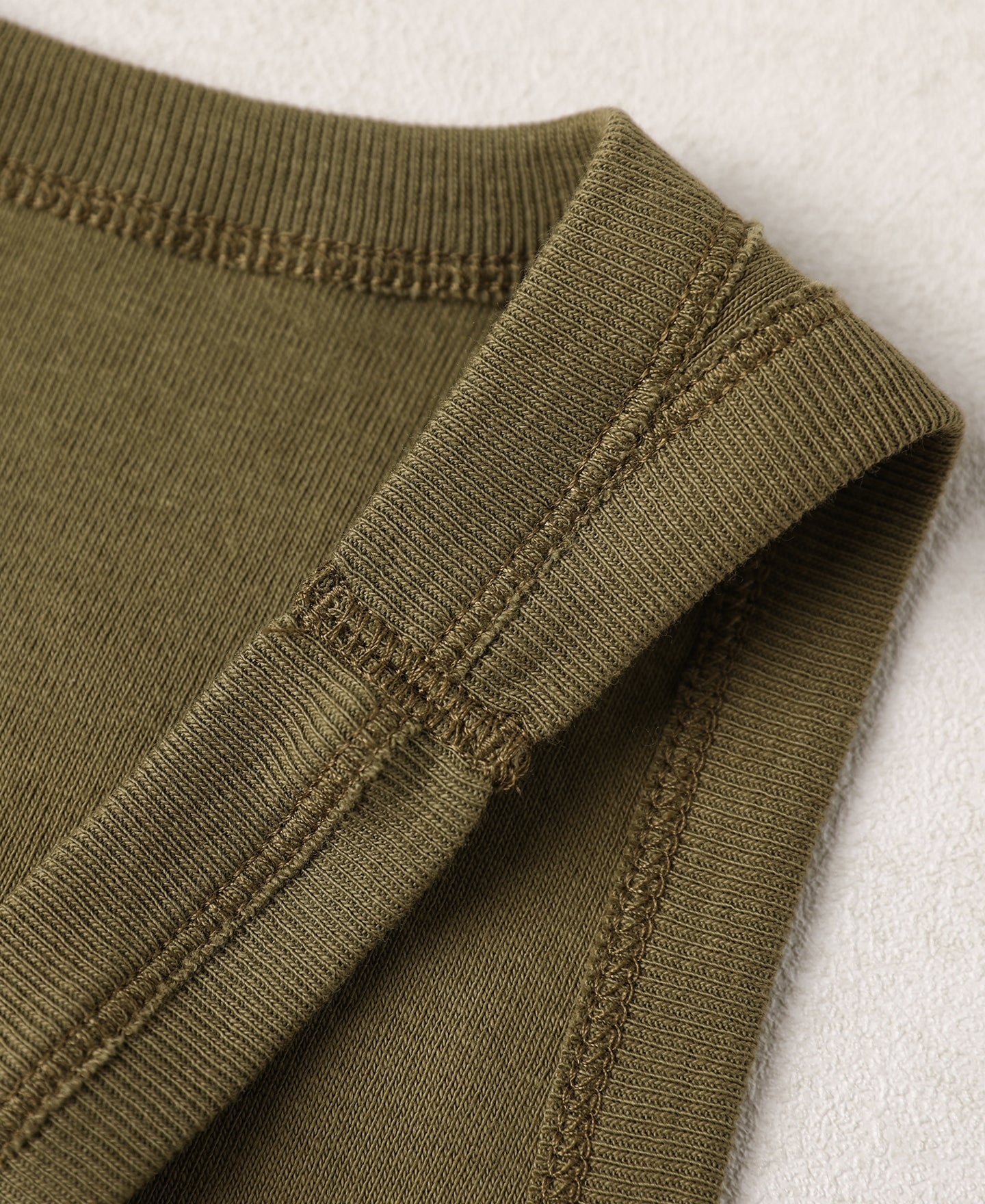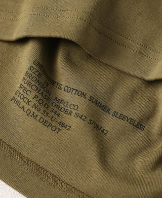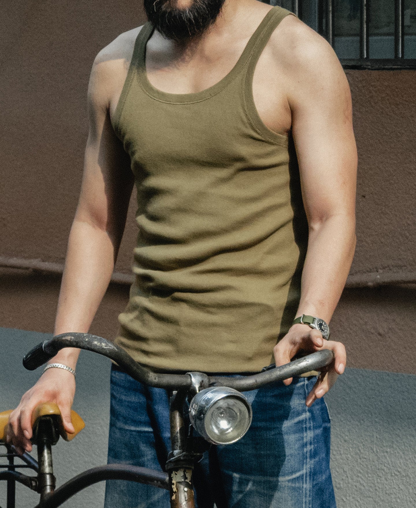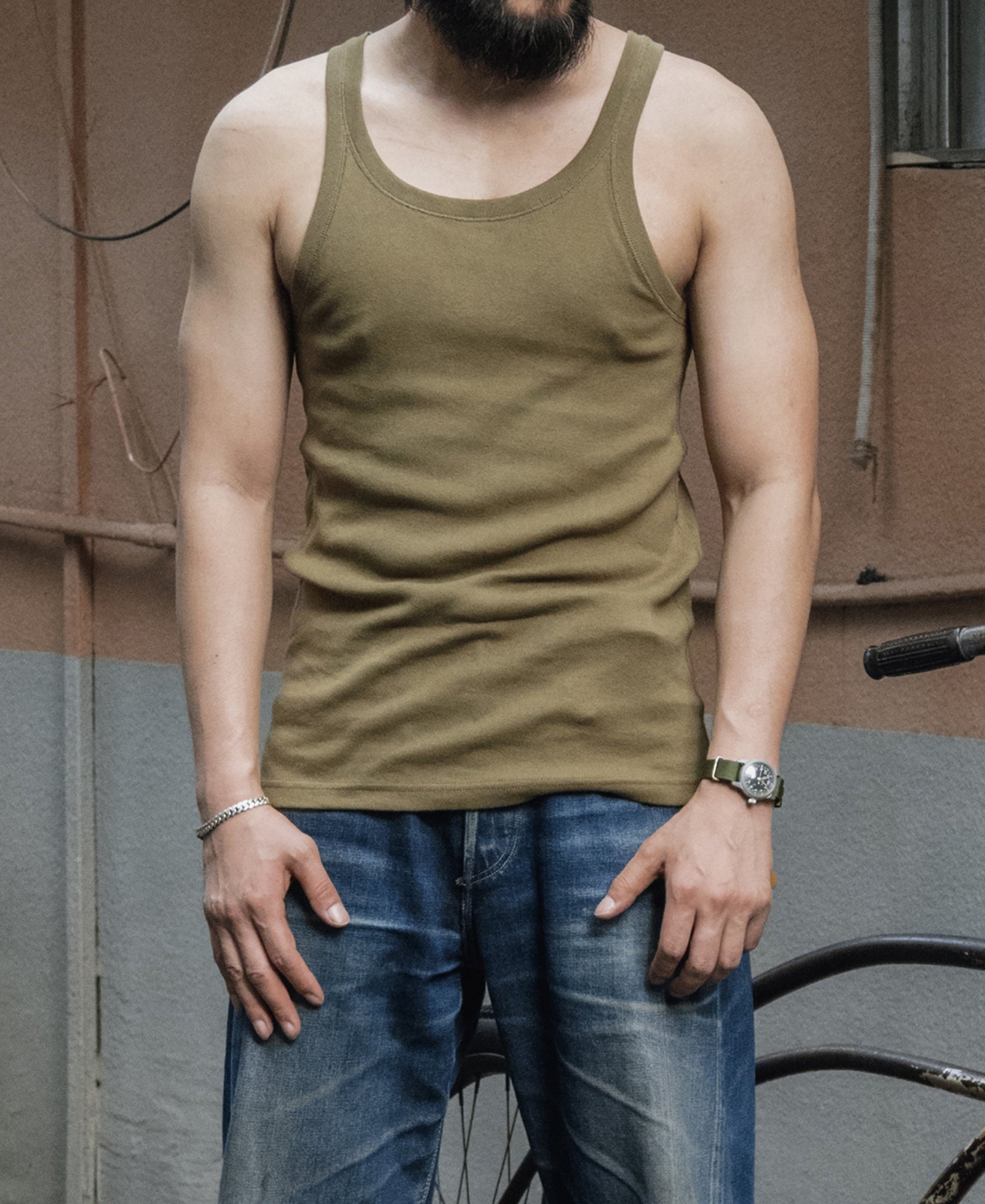 제2차 세계대전 당시 미군이 지급한 "UNDERSHIRTS, COTTON, SUMMER, SLEEVELESS"라는 탱크톱을 재현한 것입니다. 코튼 소재로 골지 처리가 되어 있어 신축성과 통기성이 좋아 편안하게 착용하실 수 있습니다. 이 탱크탑은 일년 내내 필수품입니다.