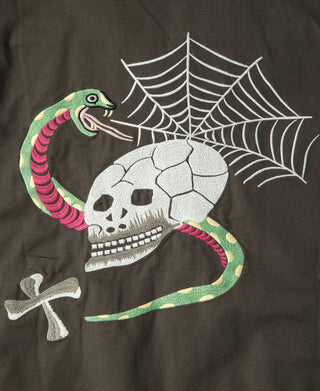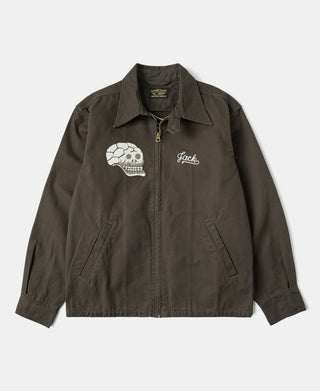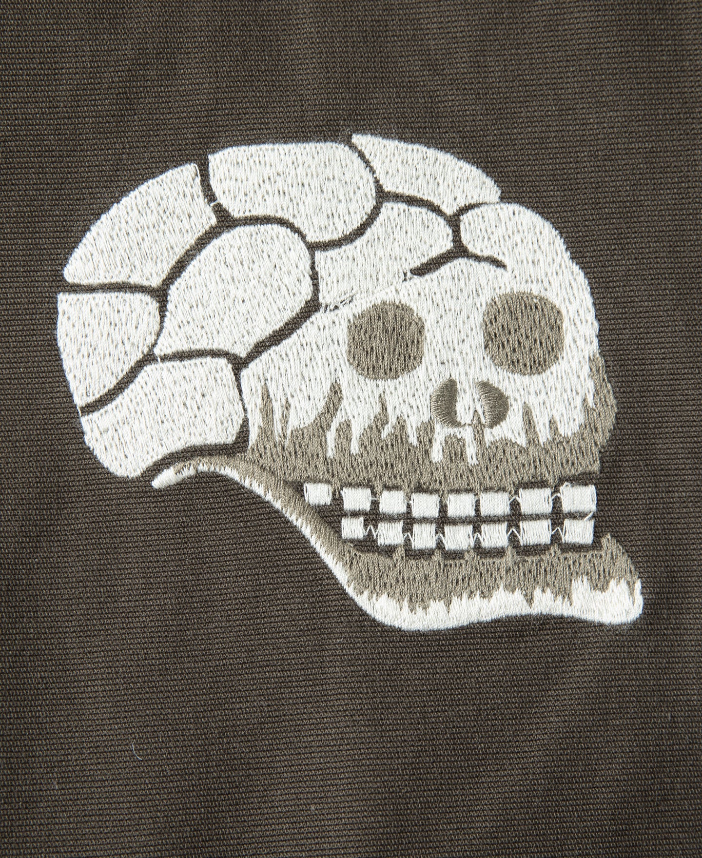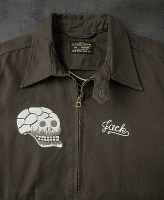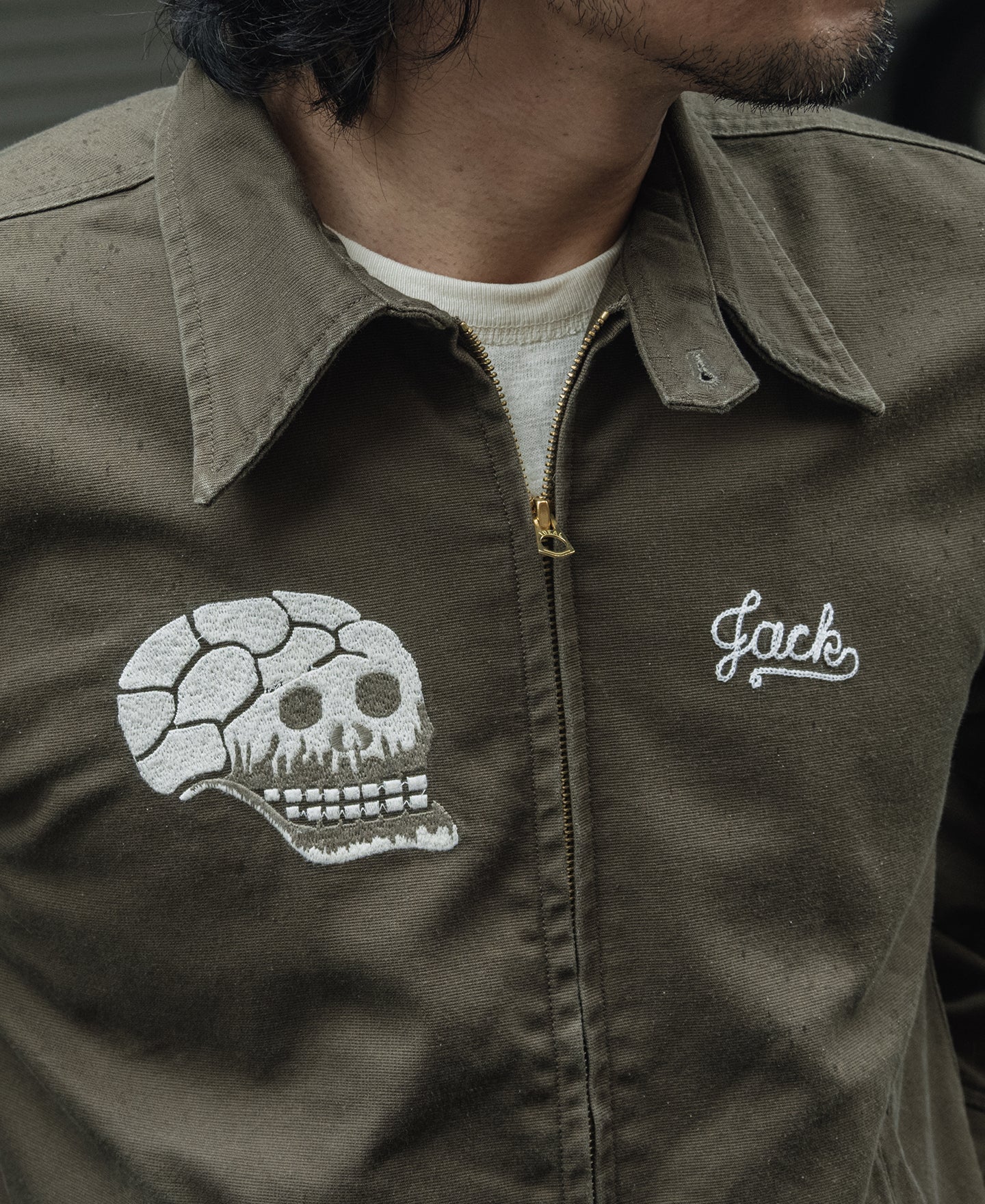 재킷은 왼쪽 가슴에 해골이, 오른쪽 가슴에 "잭"이 있고 뒷면에는 거미줄과 뱀이 자수된 흰색 해골이 있습니다. 전쟁의 잔인함을 반전 정서와 함께 표현한 것입니다.