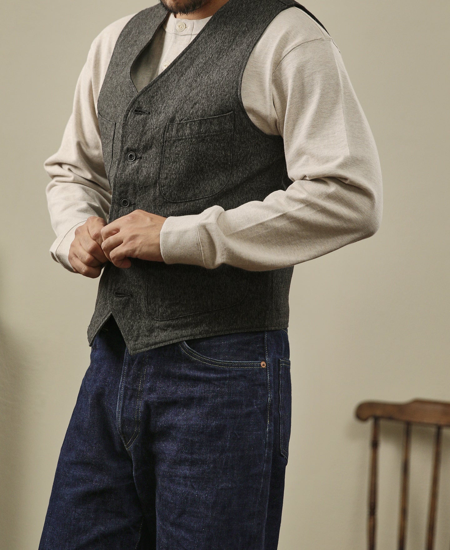 1920년대 프랑스 작업복 조끼에서 영감을 받은 이 작업 조끼는 작업하는 동안 더 많은 도구와 품목을 보관할 수 있도록 디자인된 4개의 주머니가 있어 더욱 실용적입니다. 9.5온스의 맞춤형 좁은 천으로 제작되었으며, 빈티지 마감 금속 버튼이 특징입니다.