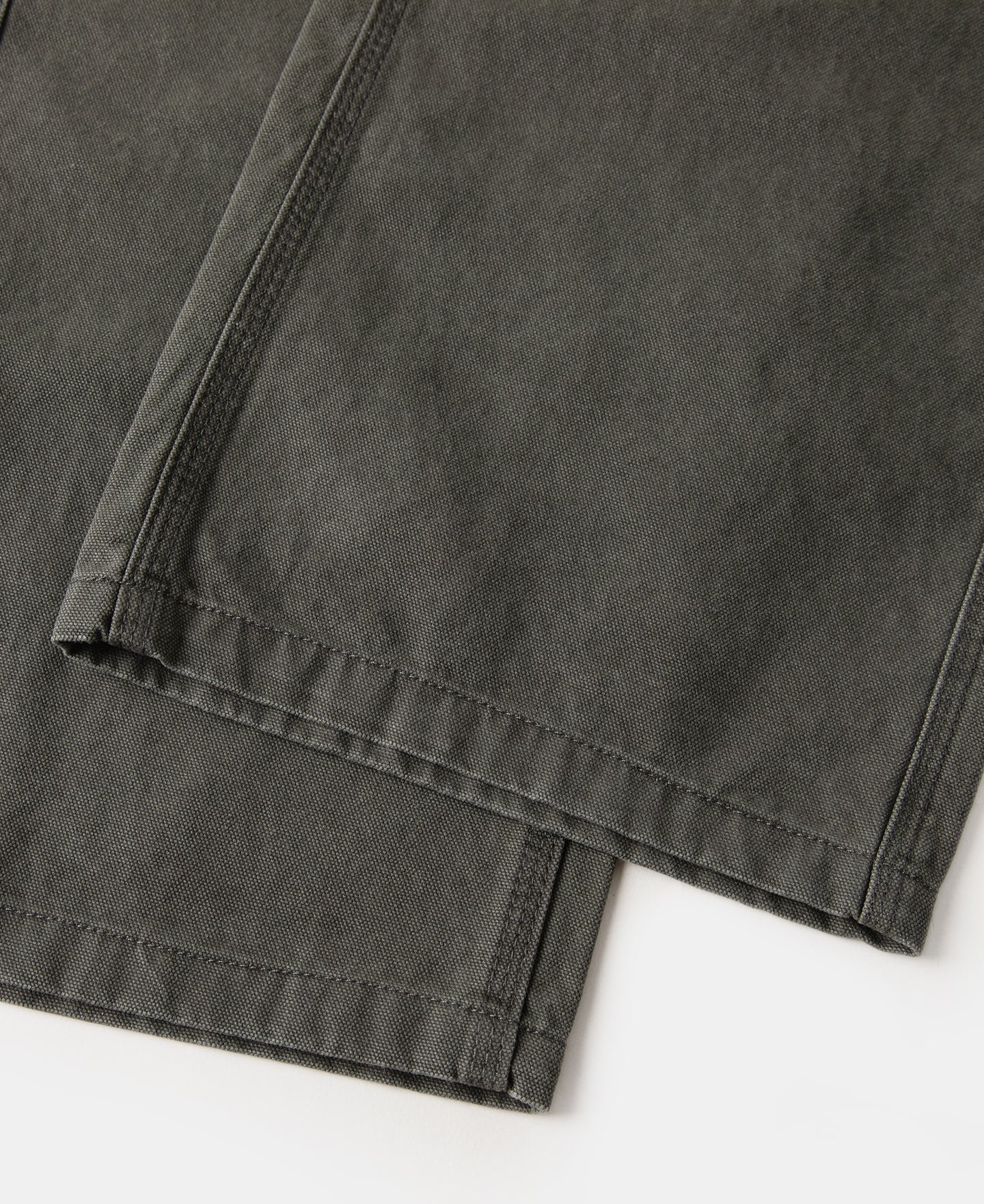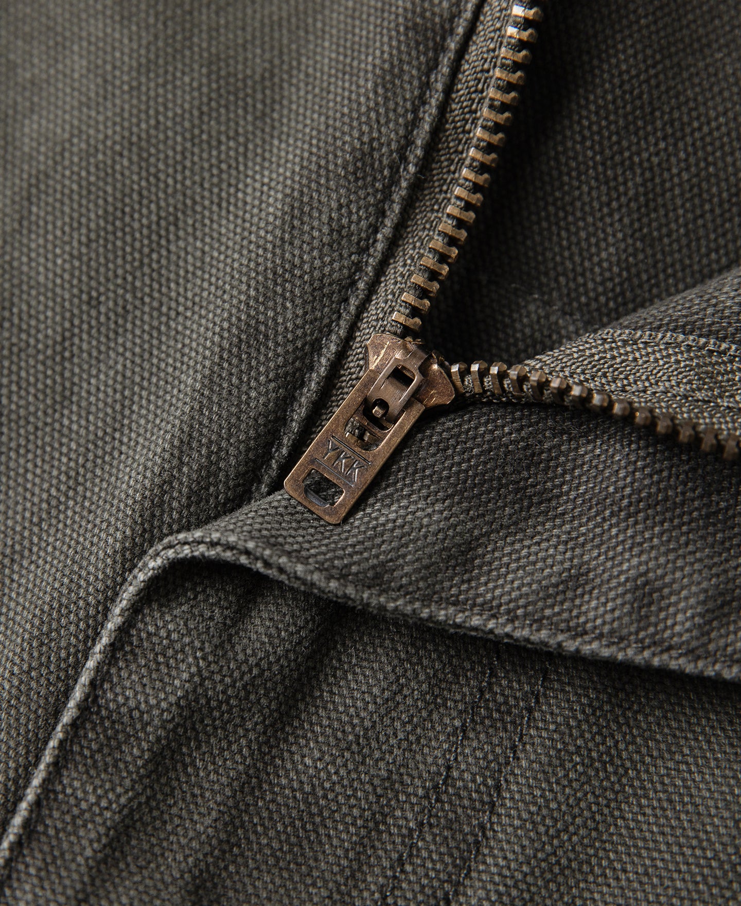 It is made from our own custom 12oz canvas fabric and strictly constructed using workwear techniques. This gives it excellent abrasion resistance and makes it suitable for year-round wear.