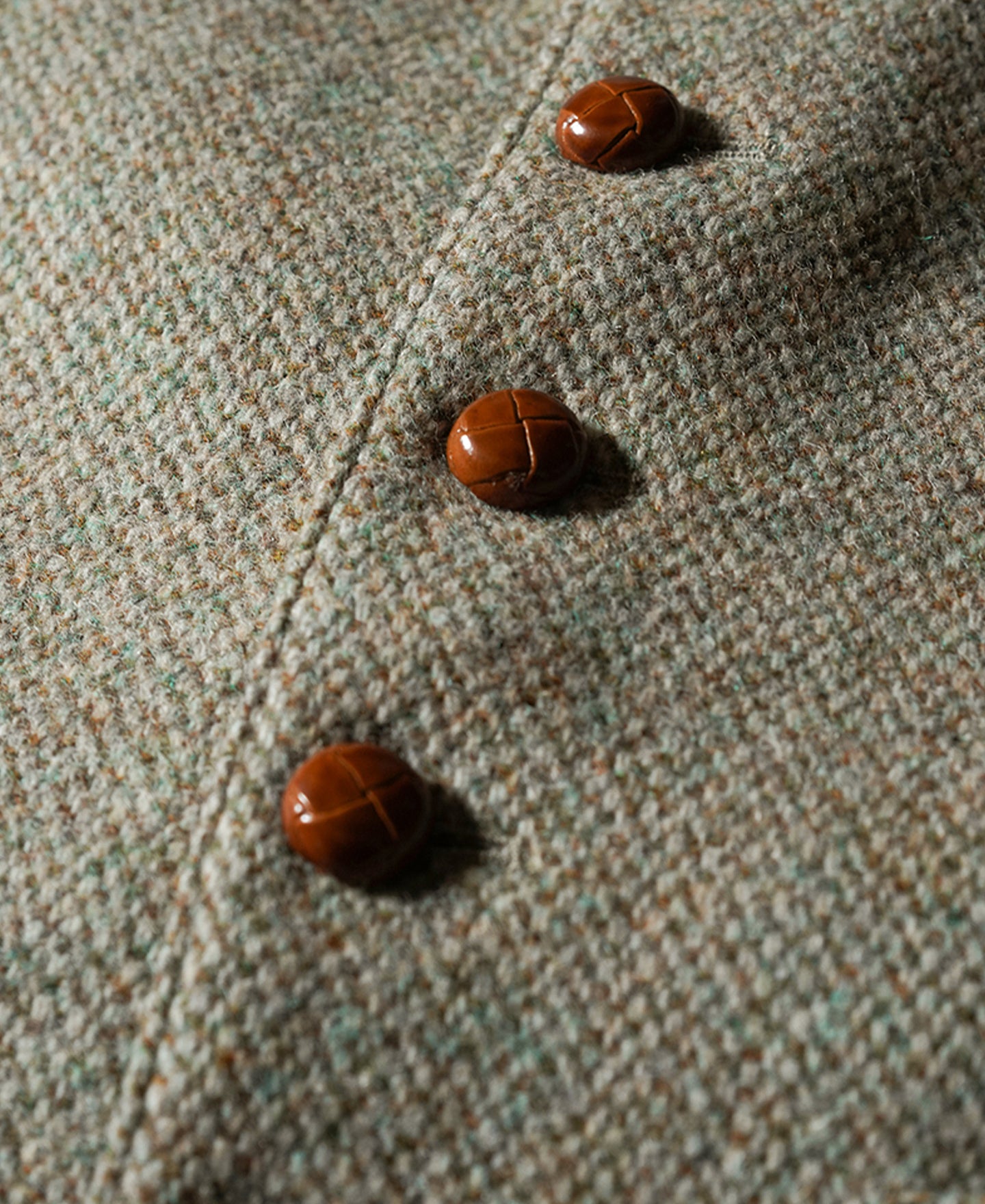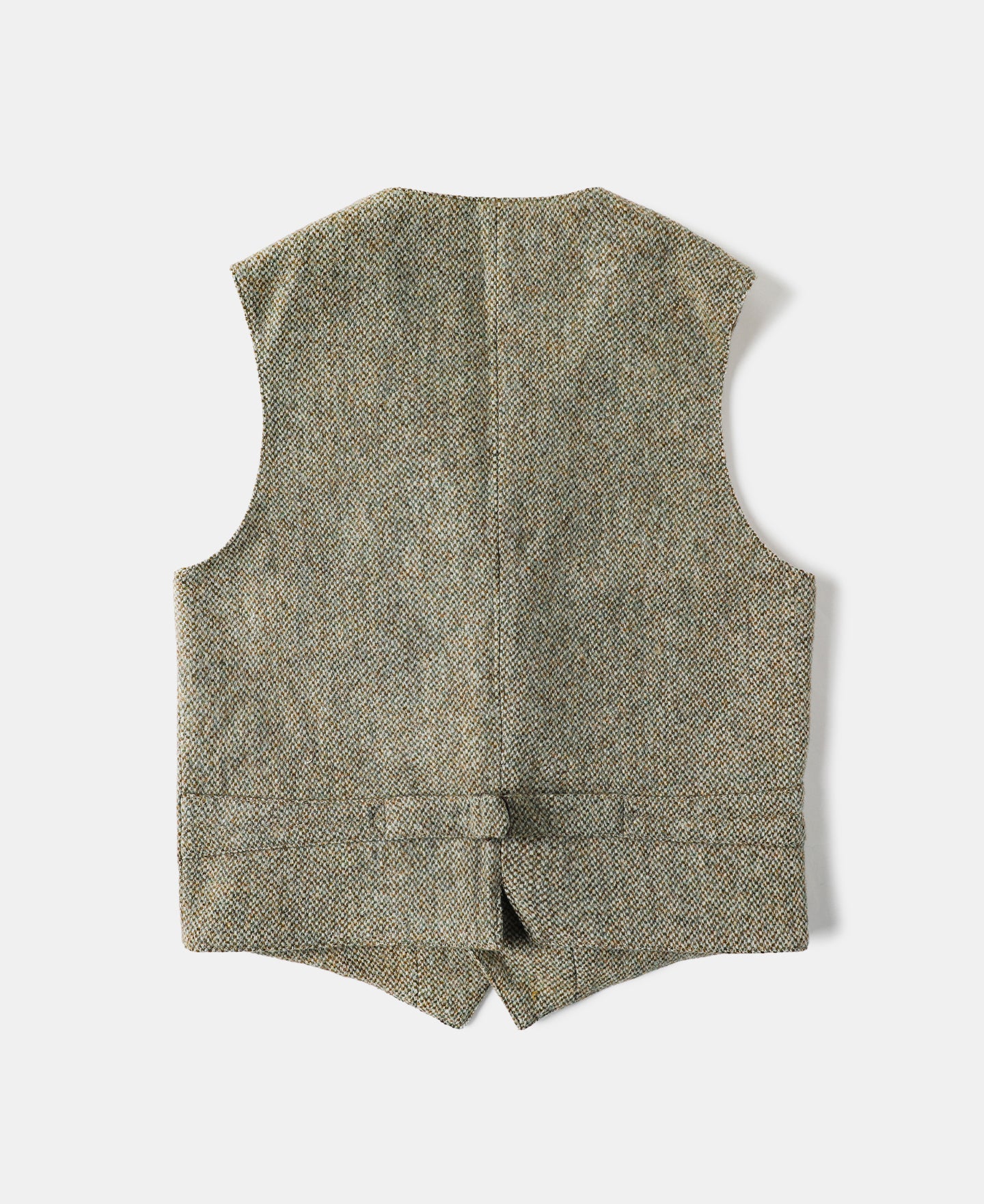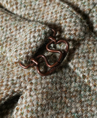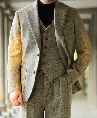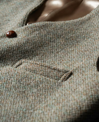 This tweed suit vest features a buckle back and a special yet subtle color for multiple pairing choices. The vest is adored with hand braided cowhide buttons, adding a vintage touch to the whole look.