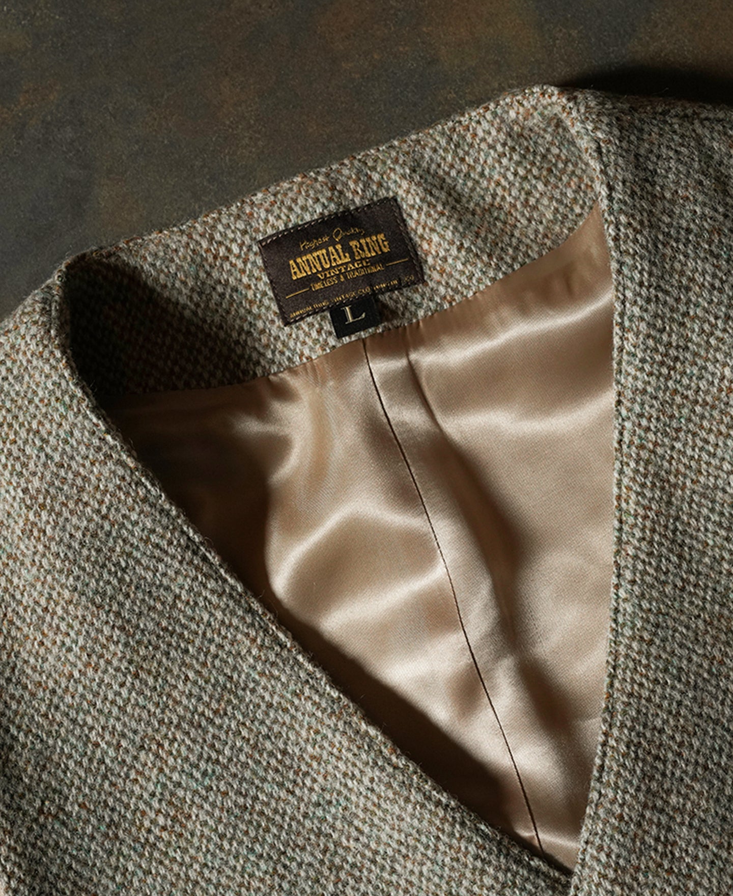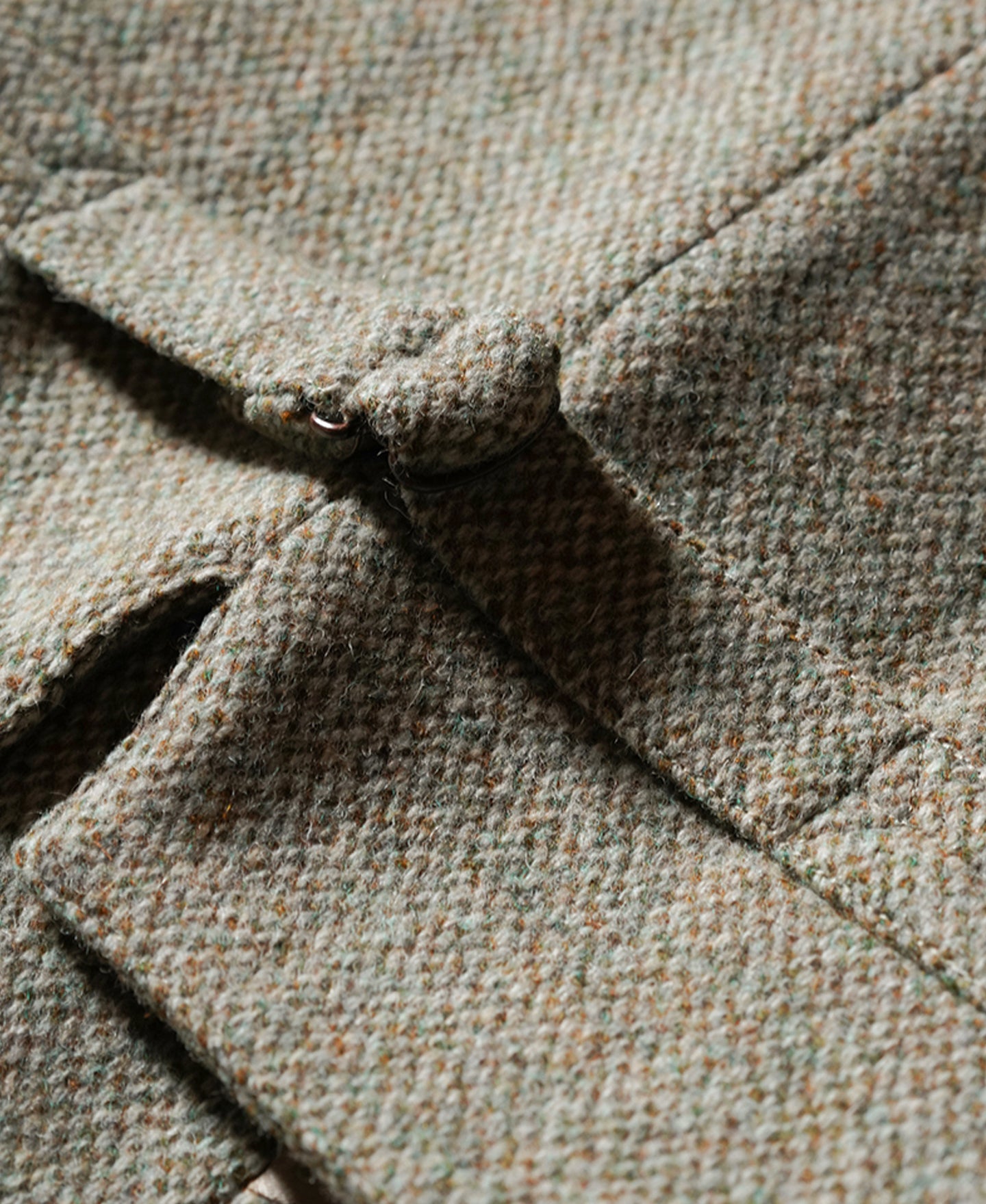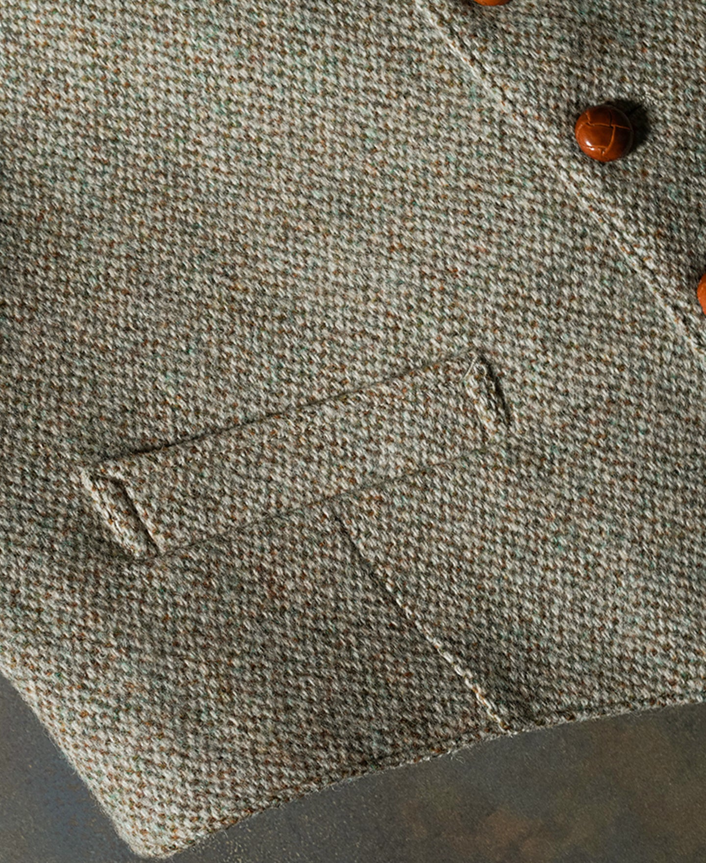This tweed suit vest features a buckle back and a special yet subtle color for multiple pairing choices. The vest is adored with hand braided cowhide buttons, adding a vintage touch to the whole look.