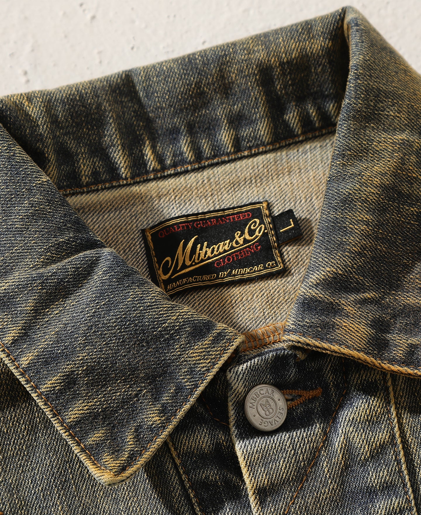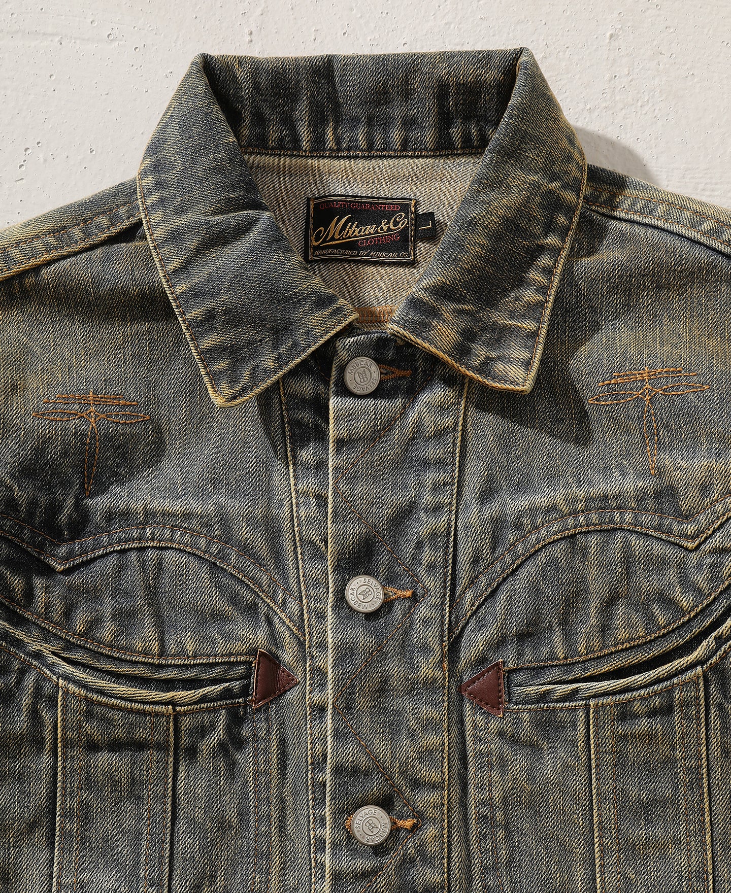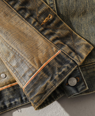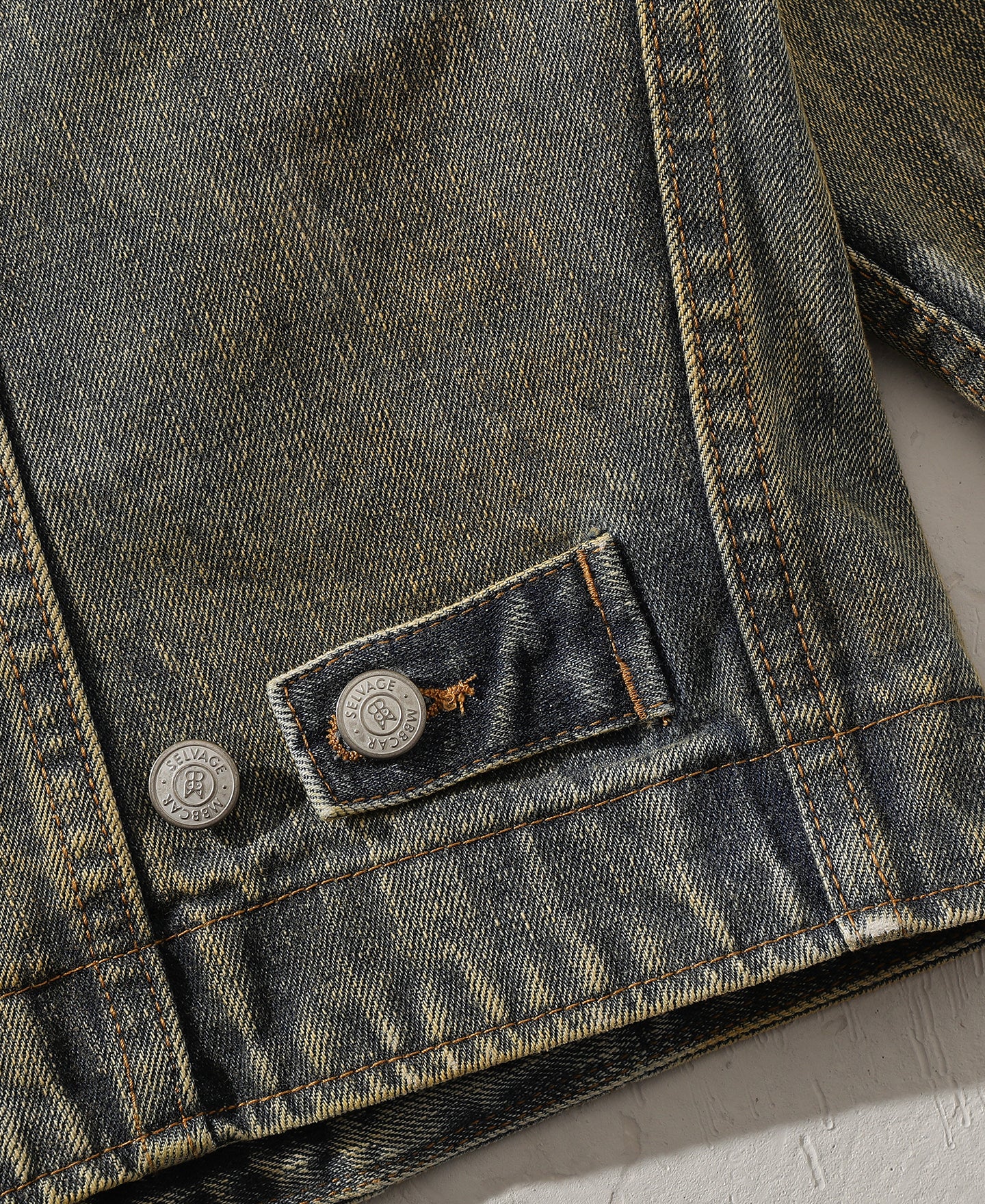 • This jacket is inspired by the 1960s denim jacket design, featuring a shorter, structured cut with a clean hem. Crafted from 16.4oz selvedge denim, it’s perfect for fall and winter. Key details include a sharp curved front and back yoke, western-style pockets with ultra-fiber leather reinforcements, and reinforced elbows. The jacket has undergone stone washing for a strong, vintage faded, muddy effect. Finished with YKK custom MBBCAR buttons and chain-stitched felled seams for durability.