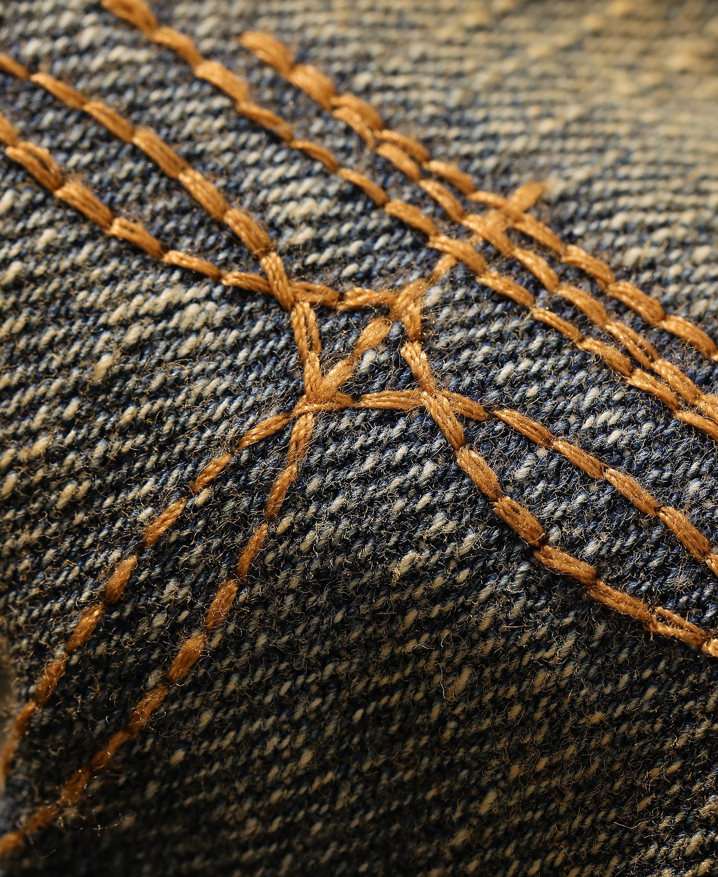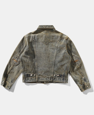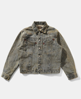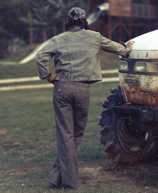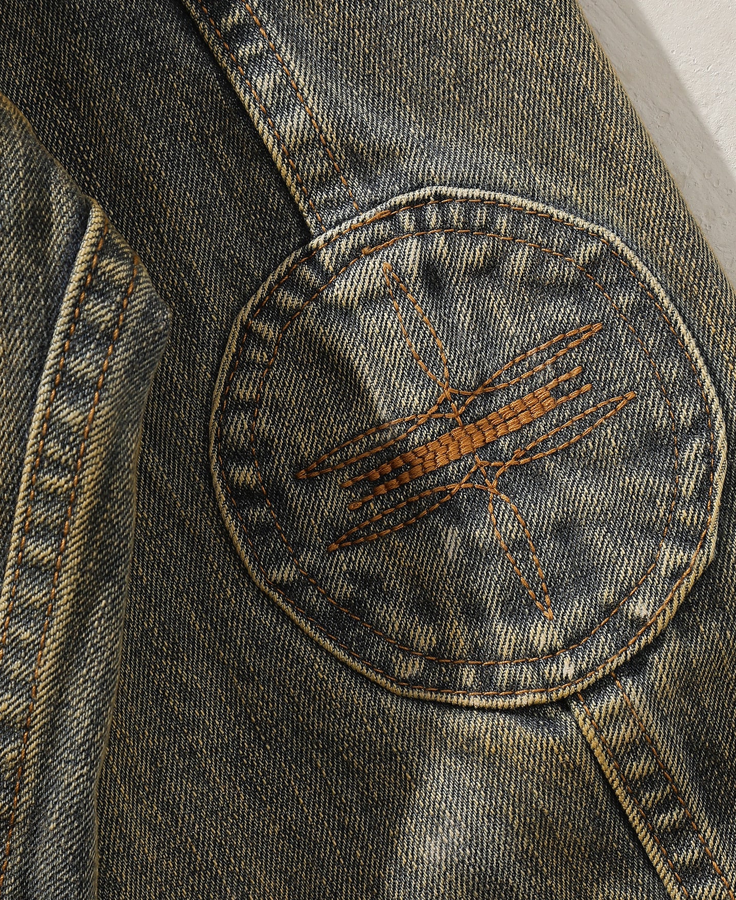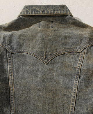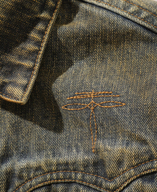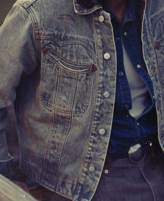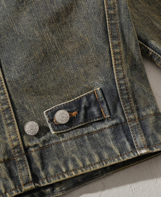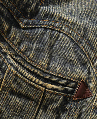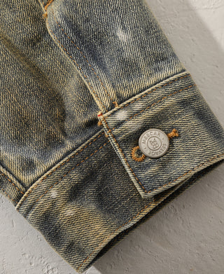 This jacket is inspired by the 1960s denim jacket design, featuring a shorter, structured cut with a clean hem. Crafted from 16.4oz selvedge denim, it’s perfect for fall and winter. Key details include a sharp curved front and back yoke, western-style pockets with ultra-fiber leather reinforcements, and reinforced elbows. The jacket has undergone stone washing for a strong, vintage faded, muddy effect. Finished with YKK custom MBBCAR buttons and chain-stitched felled seams for durability.
