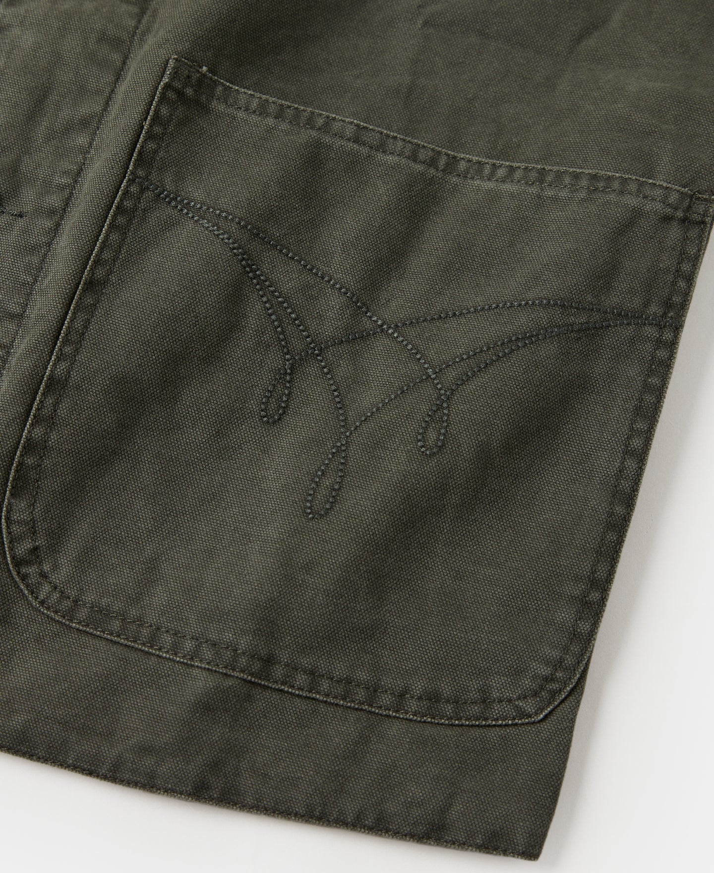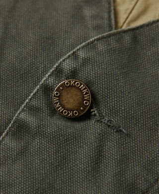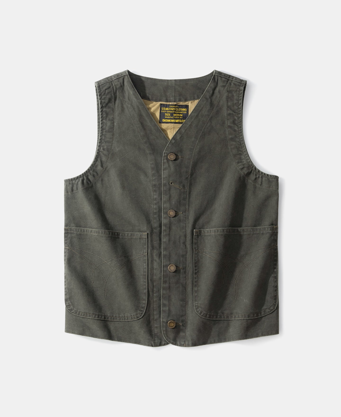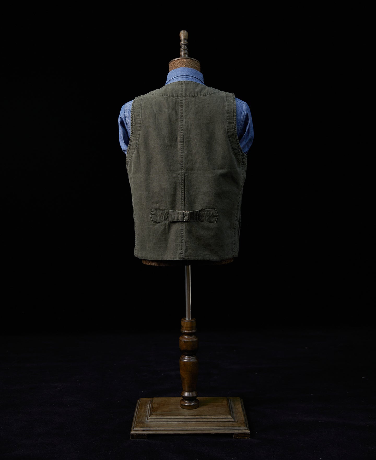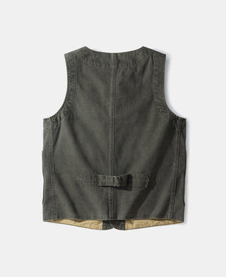 This workwear-inspired vest is made from 12oz high-density canvas. The fully lined interior, double-layered design features a V-neck and two waist patch pockets adorned with embroidery details. The back includes a signature adjustable buckle for a functional and timeless look.