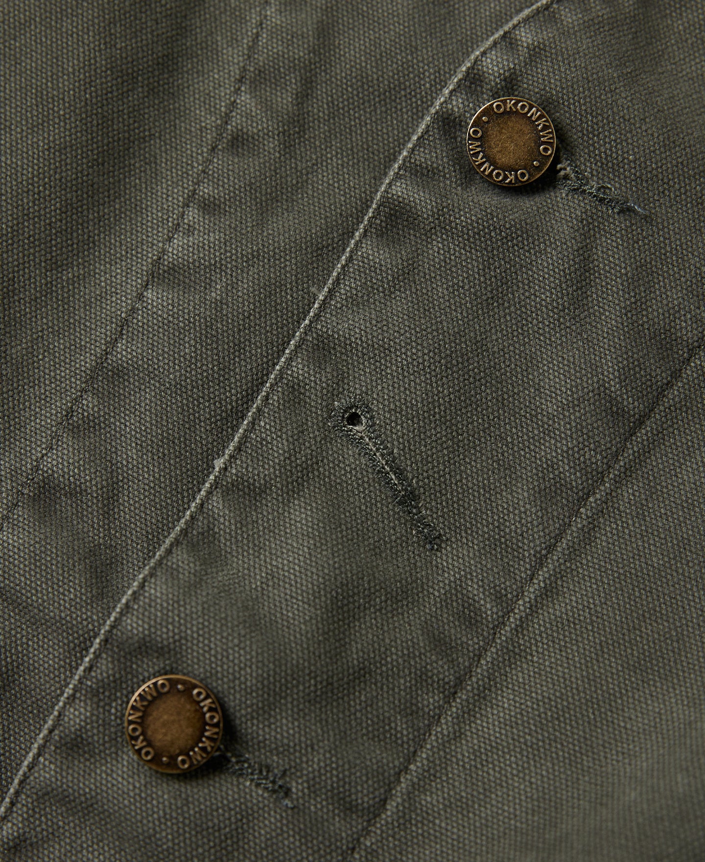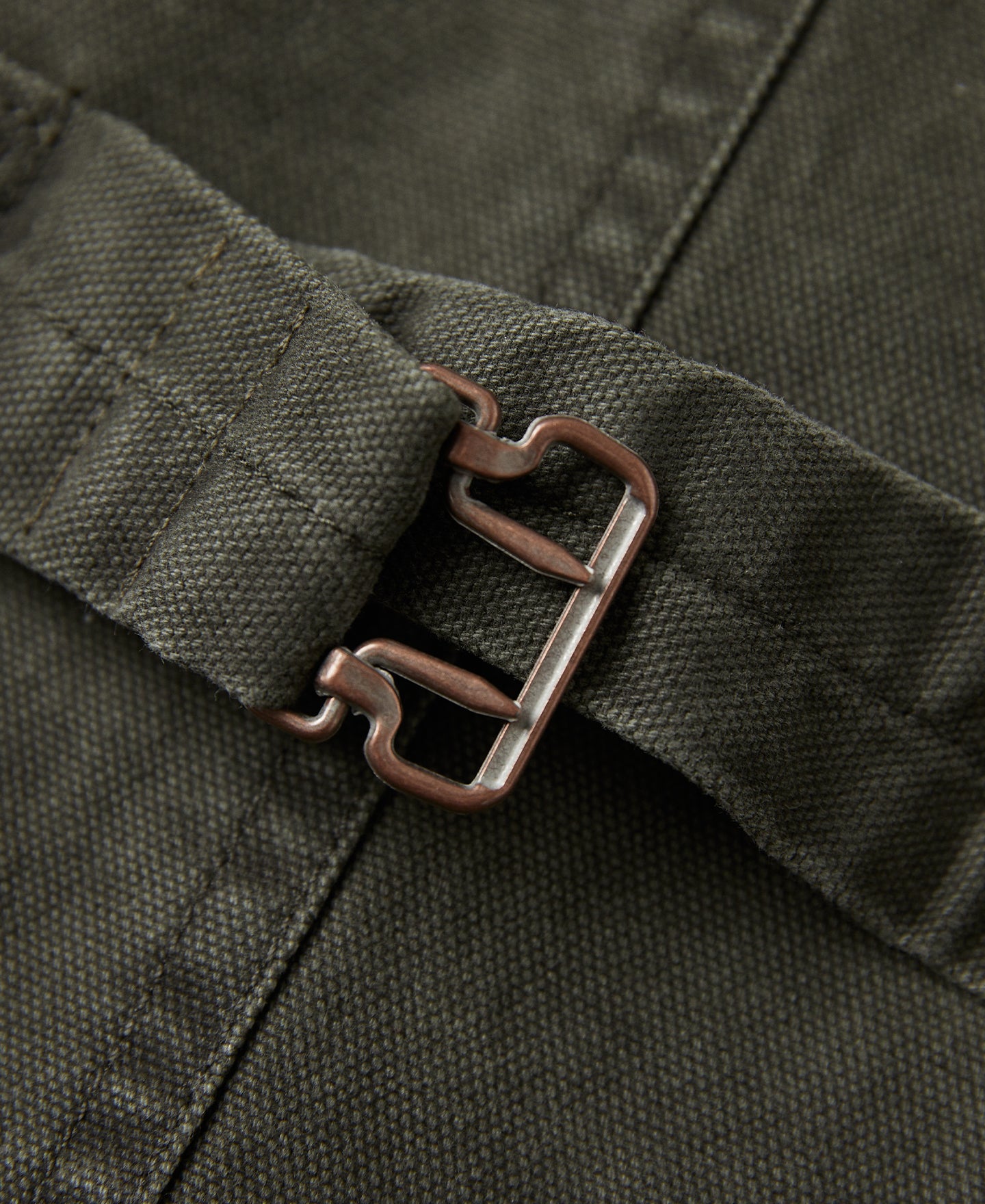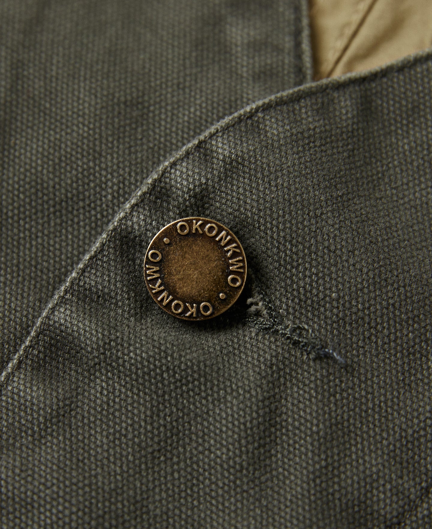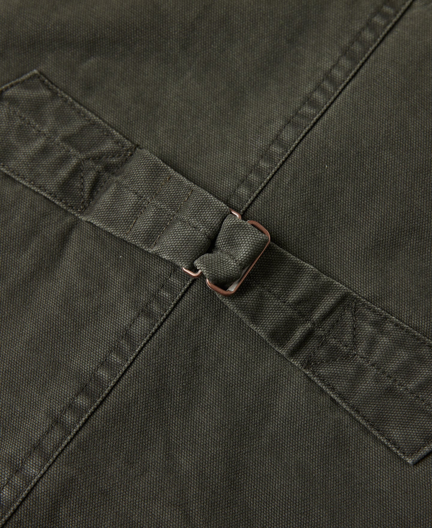 • This workwear-inspired vest is made from 12oz high-density canvas. The fully lined interior, double-layered design features a V-neck and two waist patch pockets adorned with embroidery details. The back includes a signature adjustable buckle for a functional and timeless look.