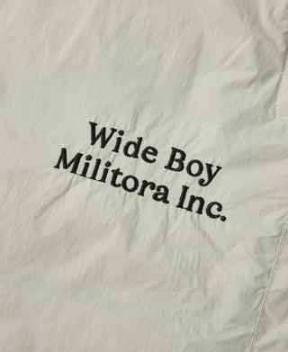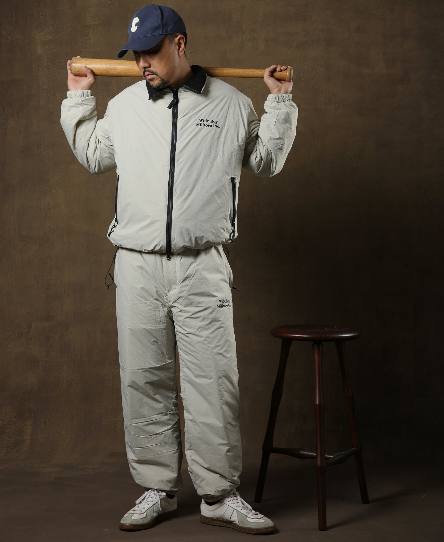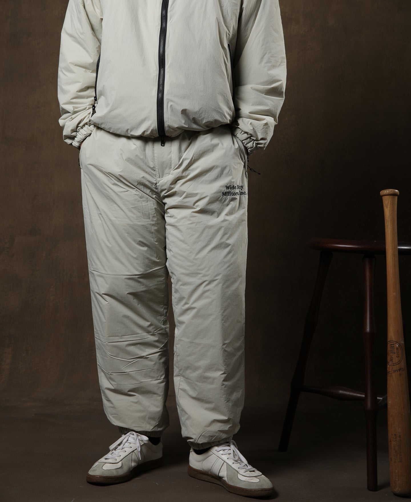 Classic design includes two zippered side and two back pockets, 'WIDE BOY, Militora Inc.' embroidery, and elastic waistband with drawstring for adjustments. Stay stylish and cozy with this retro-inspired winter suit. -