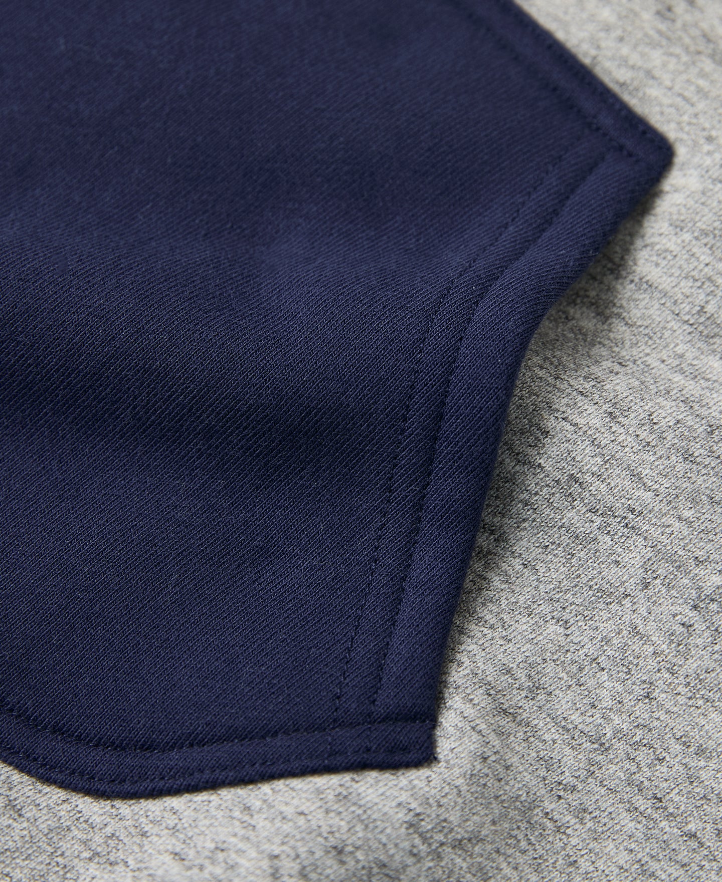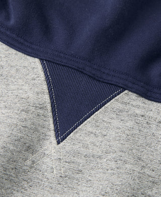 The "After Hoodie" is a unique style where the hood is sewn onto the neckline after the crewneck sweatshirt is constructed, offering a retro feel. This design includes a double V-gusset at the front and back of the collar for added durability and stretch, as well as a convenient kangaroo pocket at the front. The combination of heather gray and oatmeal color blocking gives it a classic, nostalgic look, while the construction ensures extra warmth and comfort around the neck.