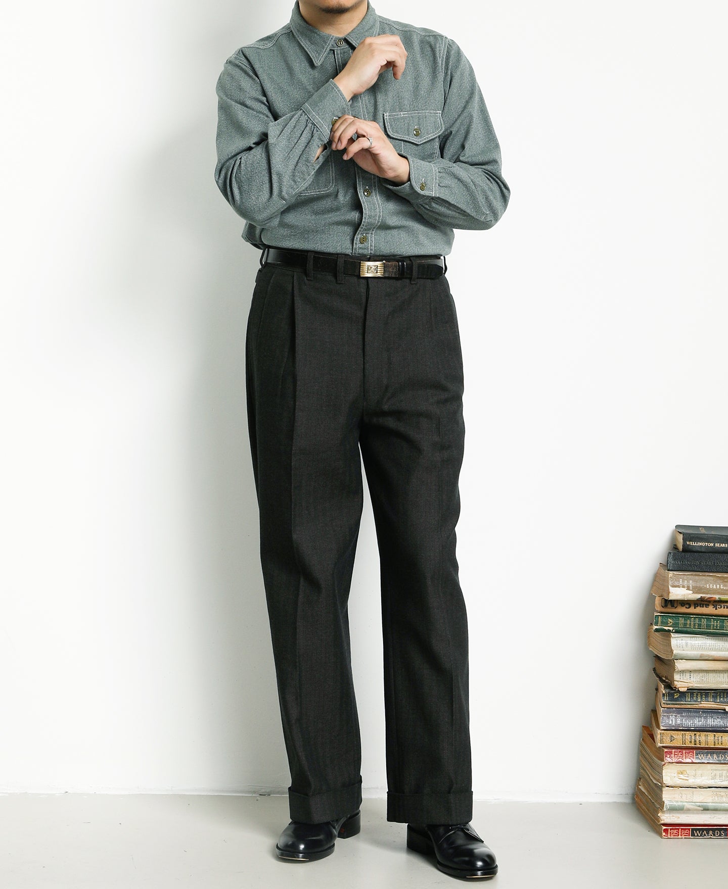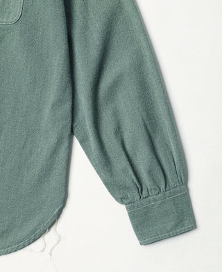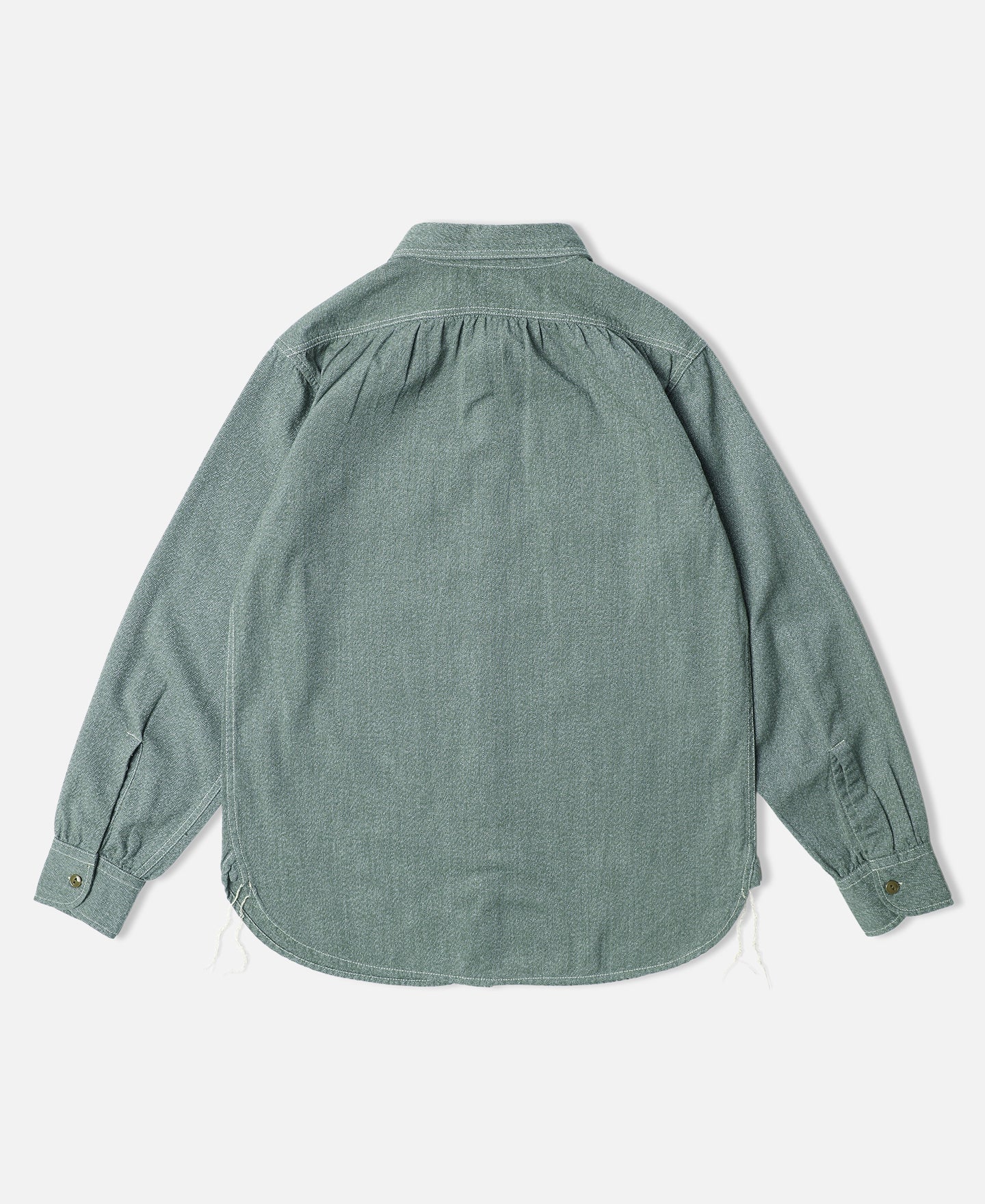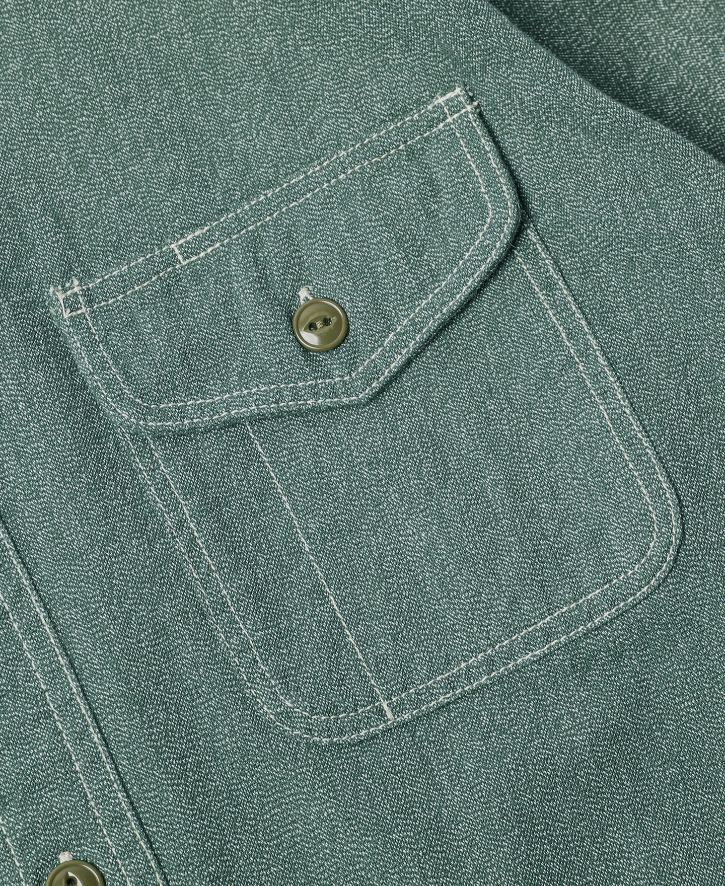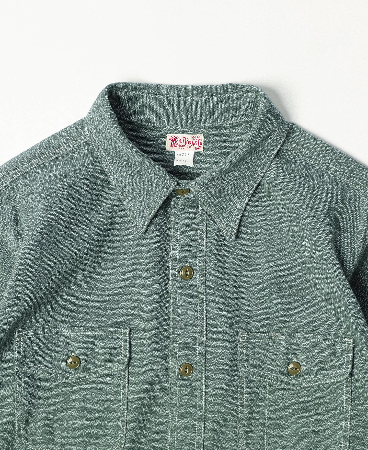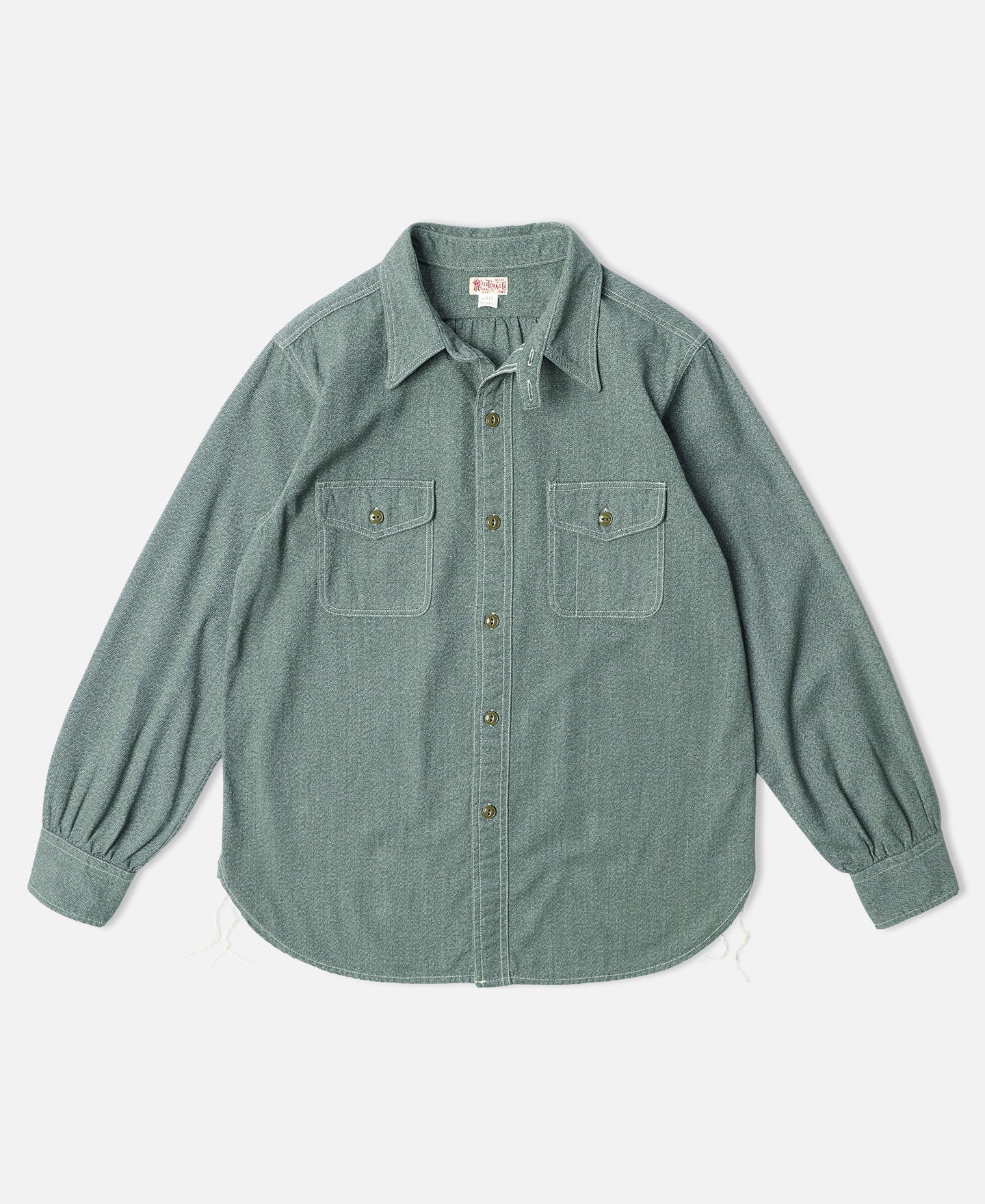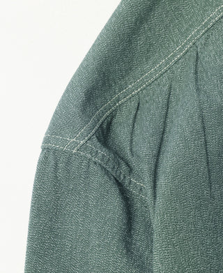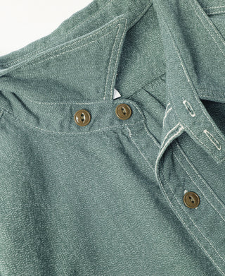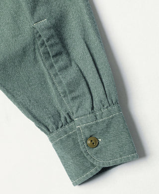 This shirt is crafted from vintage-inspired, twisted pepper&salt fabric, made from 100% cotton, capturing an authentic heritage feel. The retro pointed collar design gives the garment a structured and layered look, with an added visual effect that complements face shape. The extended buttoned throat tab detail under the collar adds an extra touch of refinement. The waterfall cuffs provide a roomy sleeve fit, enhancing mobility, while the flap pockets with pen slot restore the classic workwear style of the 1940s. Chain-stitch machine sewing is used throughout, with visible seams that add depth and texture to the garment.