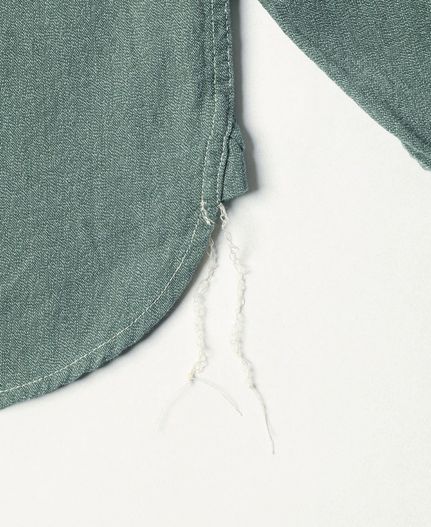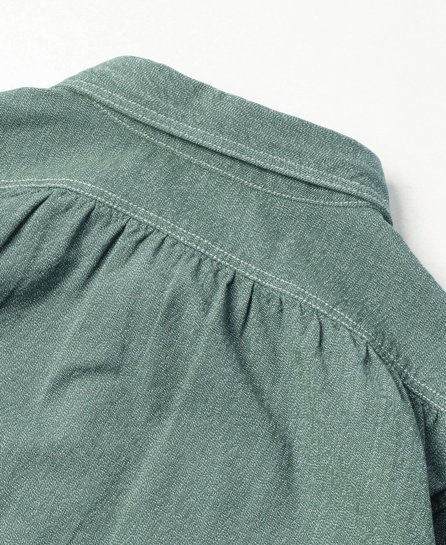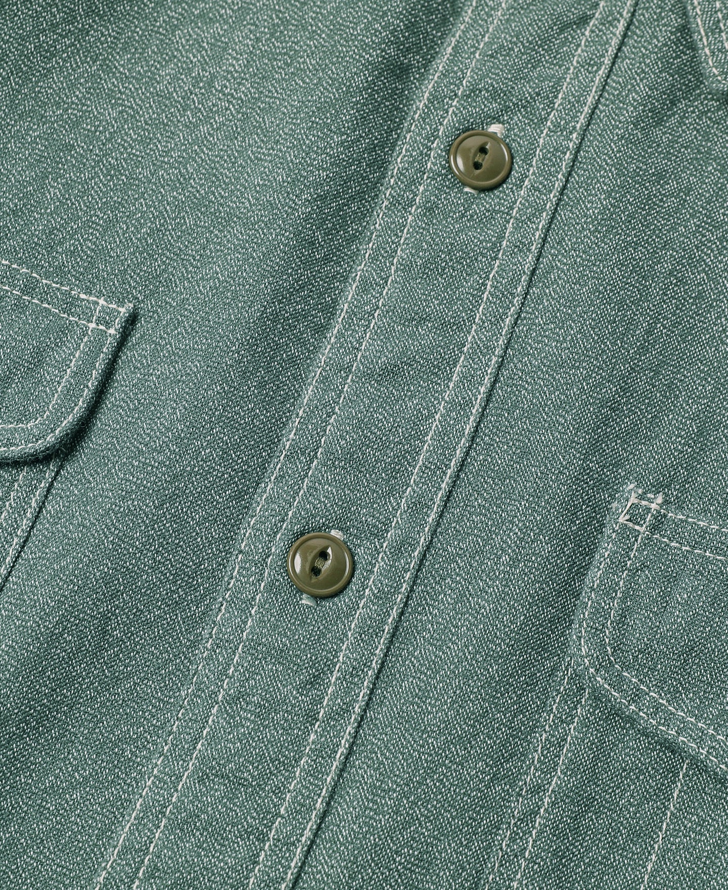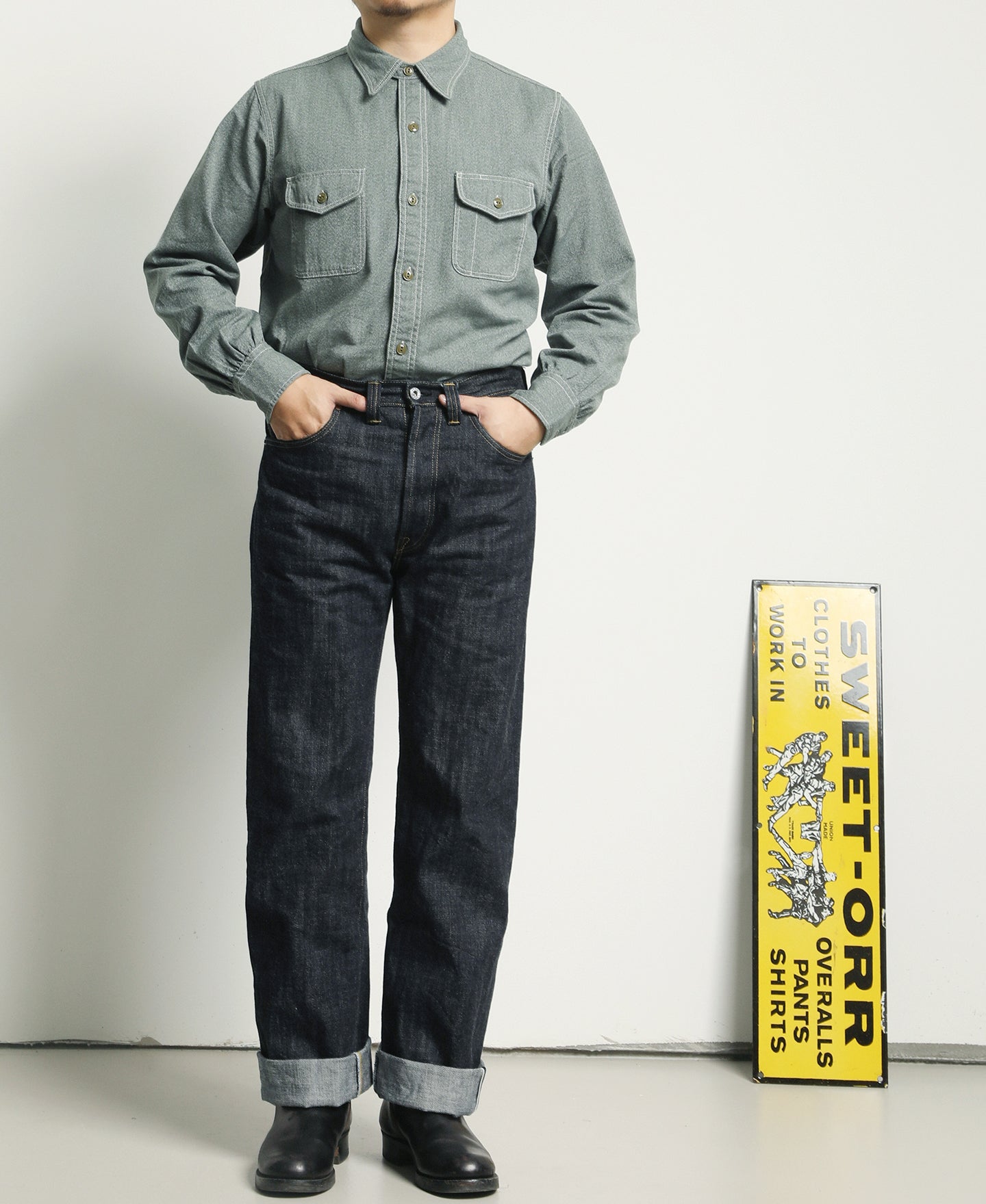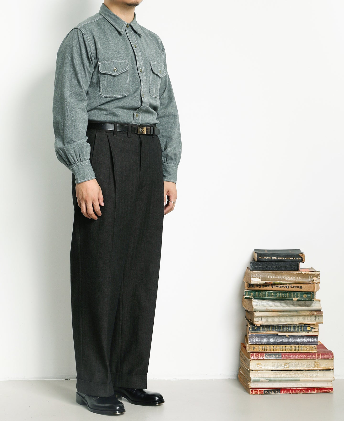This shirt is crafted from vintage-inspired, twisted pepper&salt fabric, made from 100% cotton, capturing an authentic heritage feel. The retro pointed collar design gives the garment a structured and layered look, with an added visual effect that complements face shape. The extended buttoned throat tab detail under the collar adds an extra touch of refinement. The waterfall cuffs provide a roomy sleeve fit, enhancing mobility, while the flap pockets with pen slot restore the classic workwear style of the 1940s. Chain-stitch machine sewing is used throughout, with visible seams that add depth and texture to the garment.