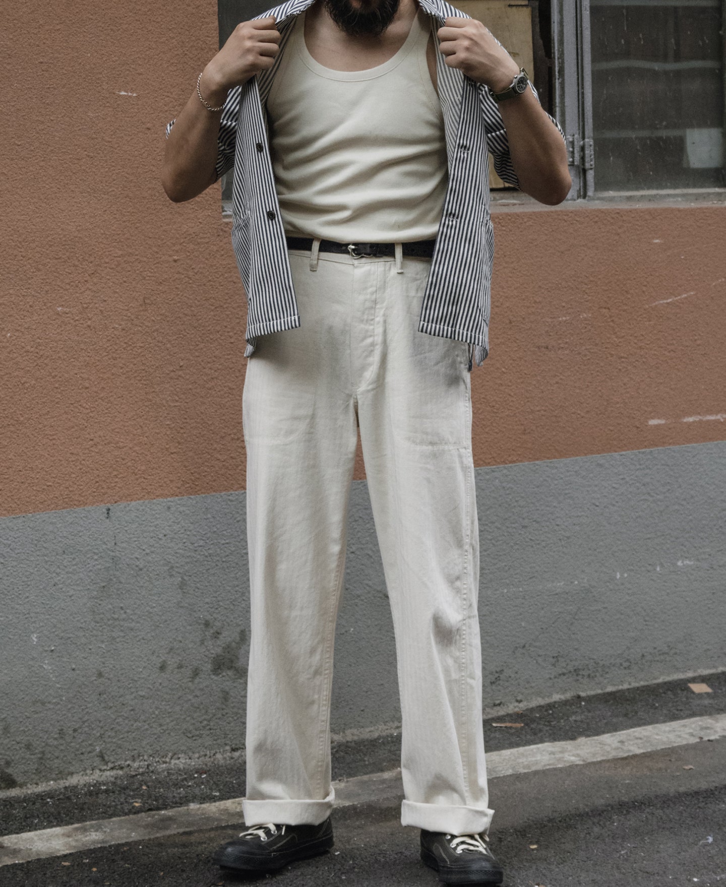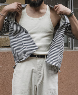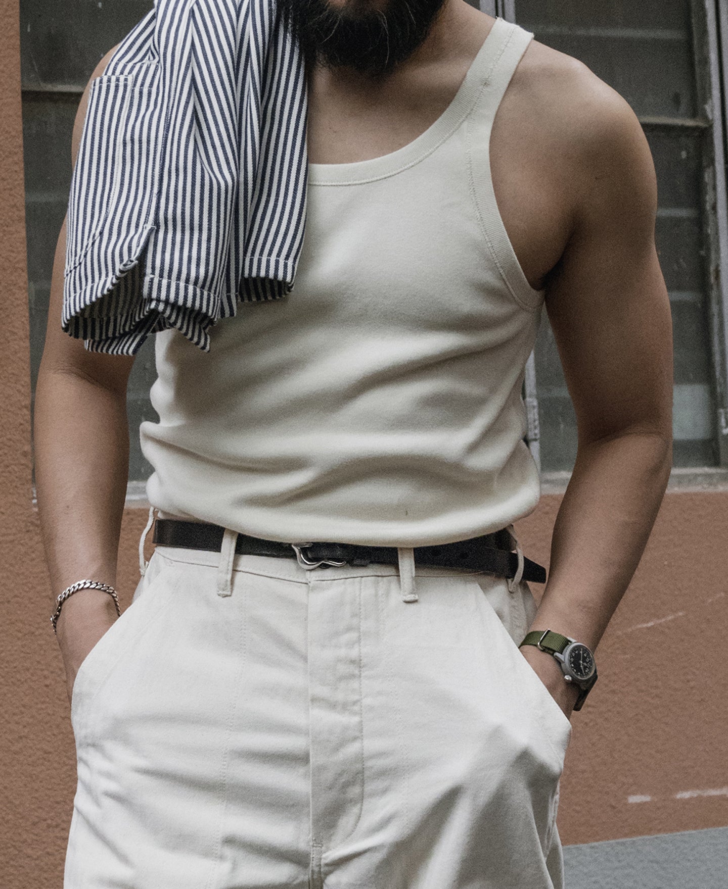 It's a reproduction of a tank top issued by the U.S. Army during World War II, called "UNDERSHIRTS, COTTON, SUMMER, SLEEVELESS." Crafted from cotton with a ribbed texture, with good elasticity and air permeability, comfortable to wear. this tank top is a year-round staple.