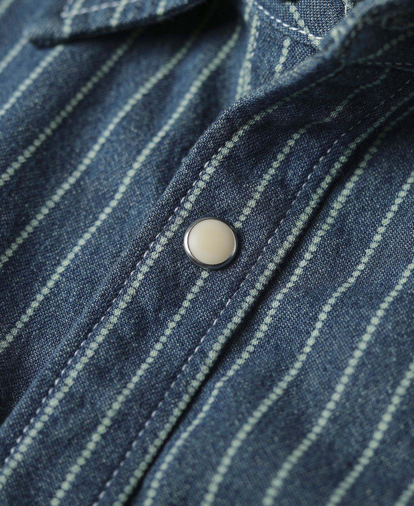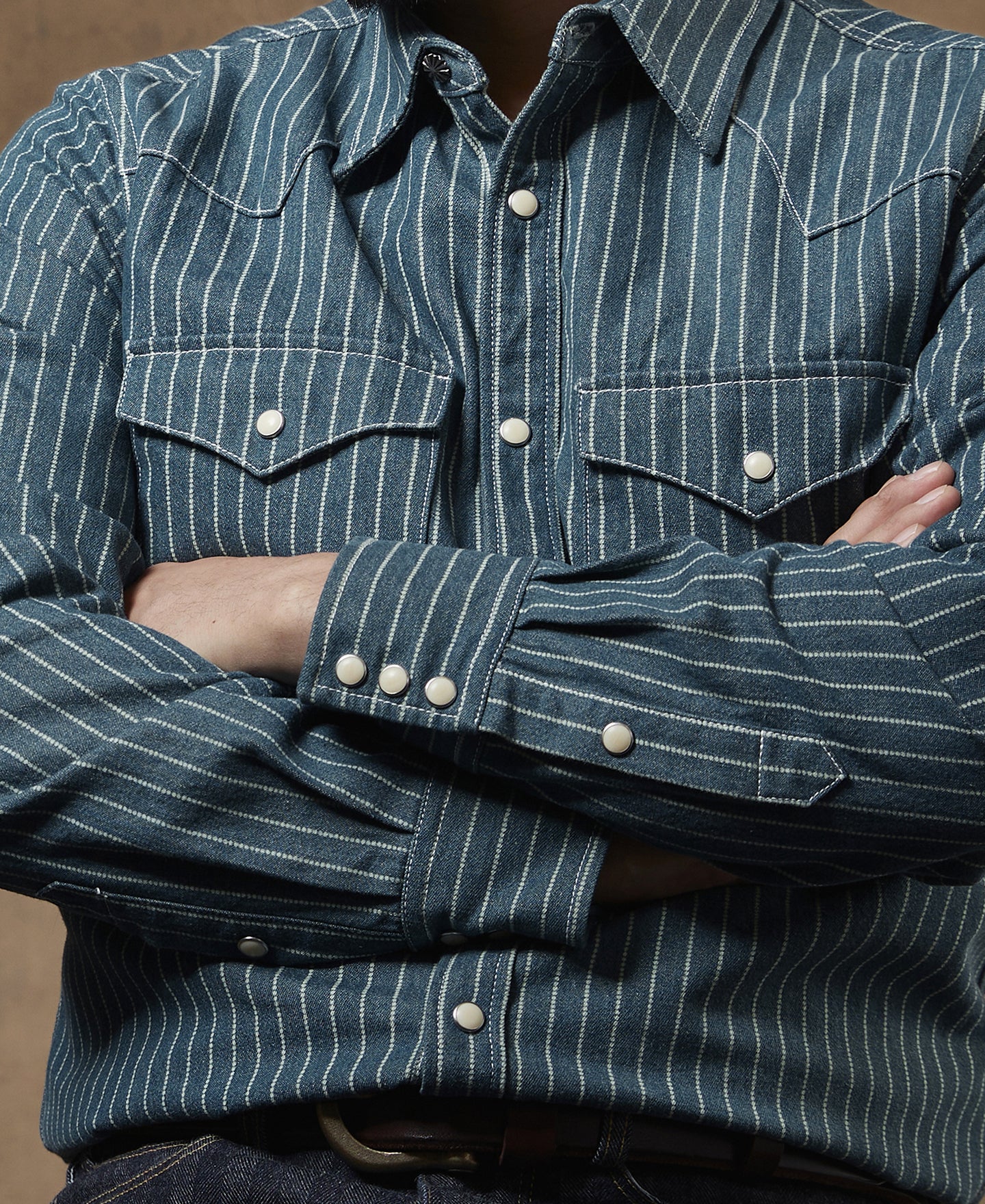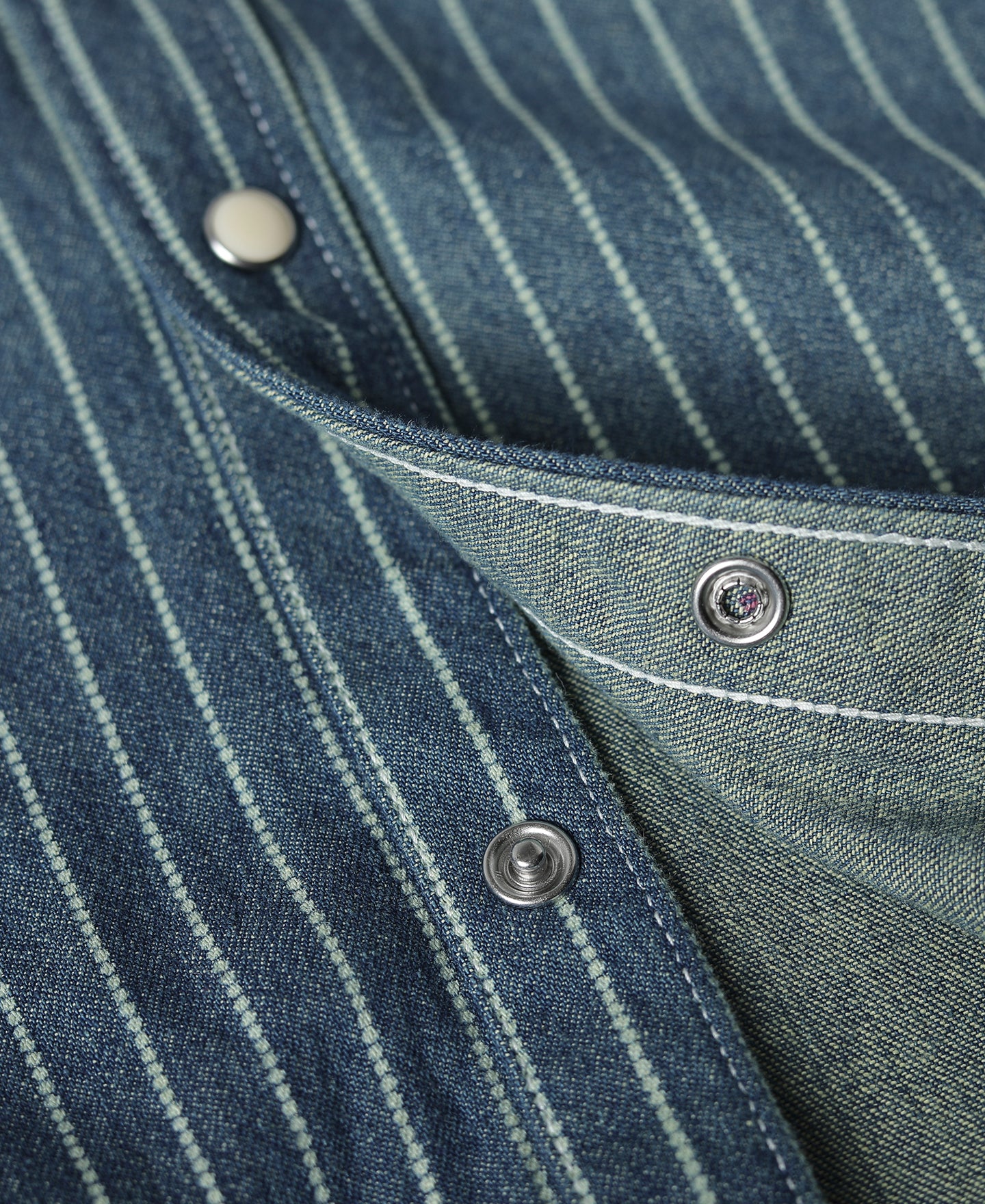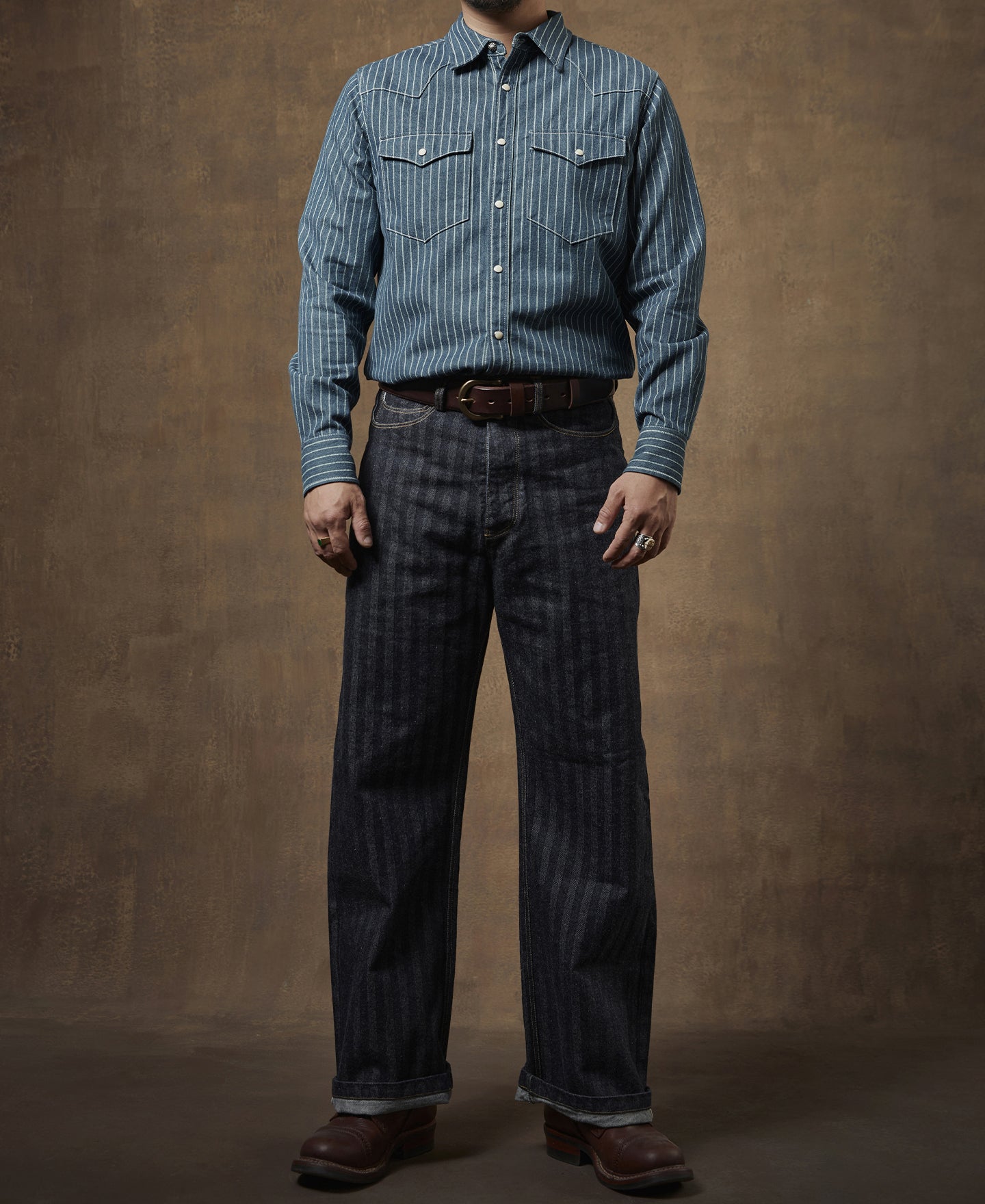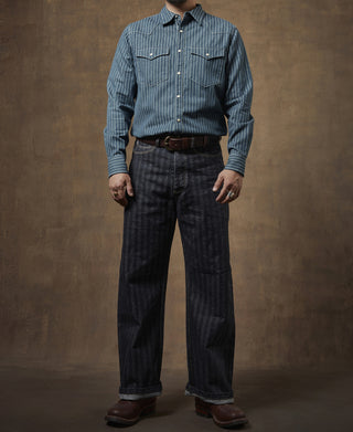 Fit cut, crafted from indigo denim fabric, this pair is adored with Wabash dot-stripe pattern. Authentic chain-stitching structure ensures durable construction. Custom high-rim snaps.