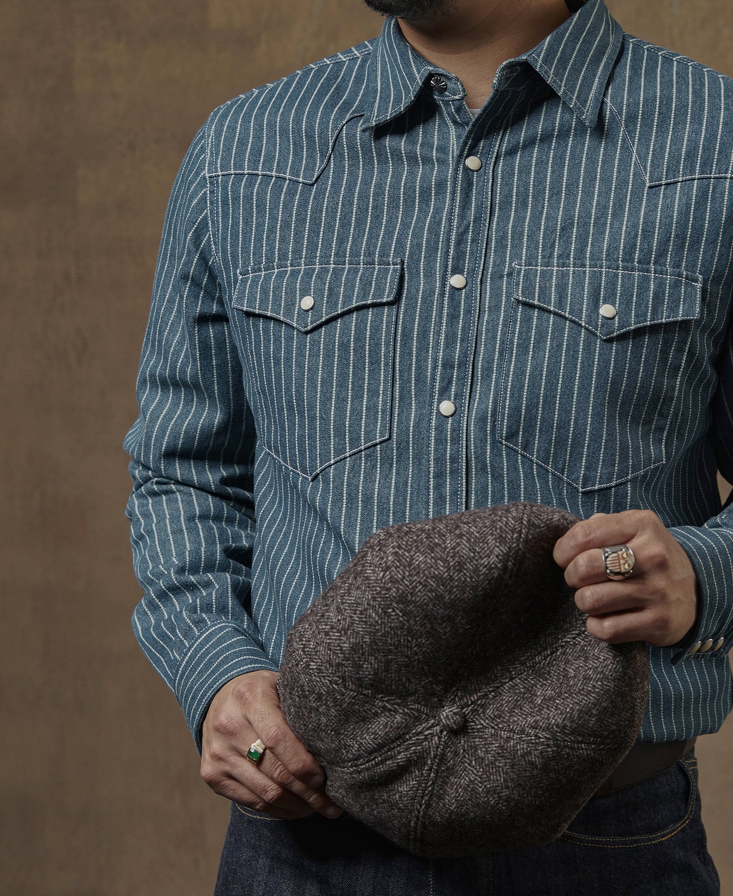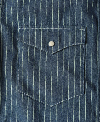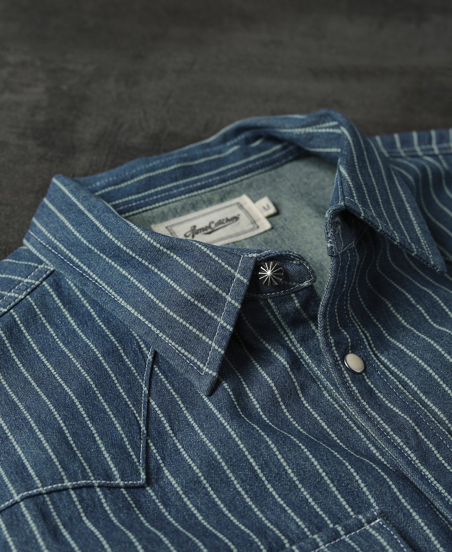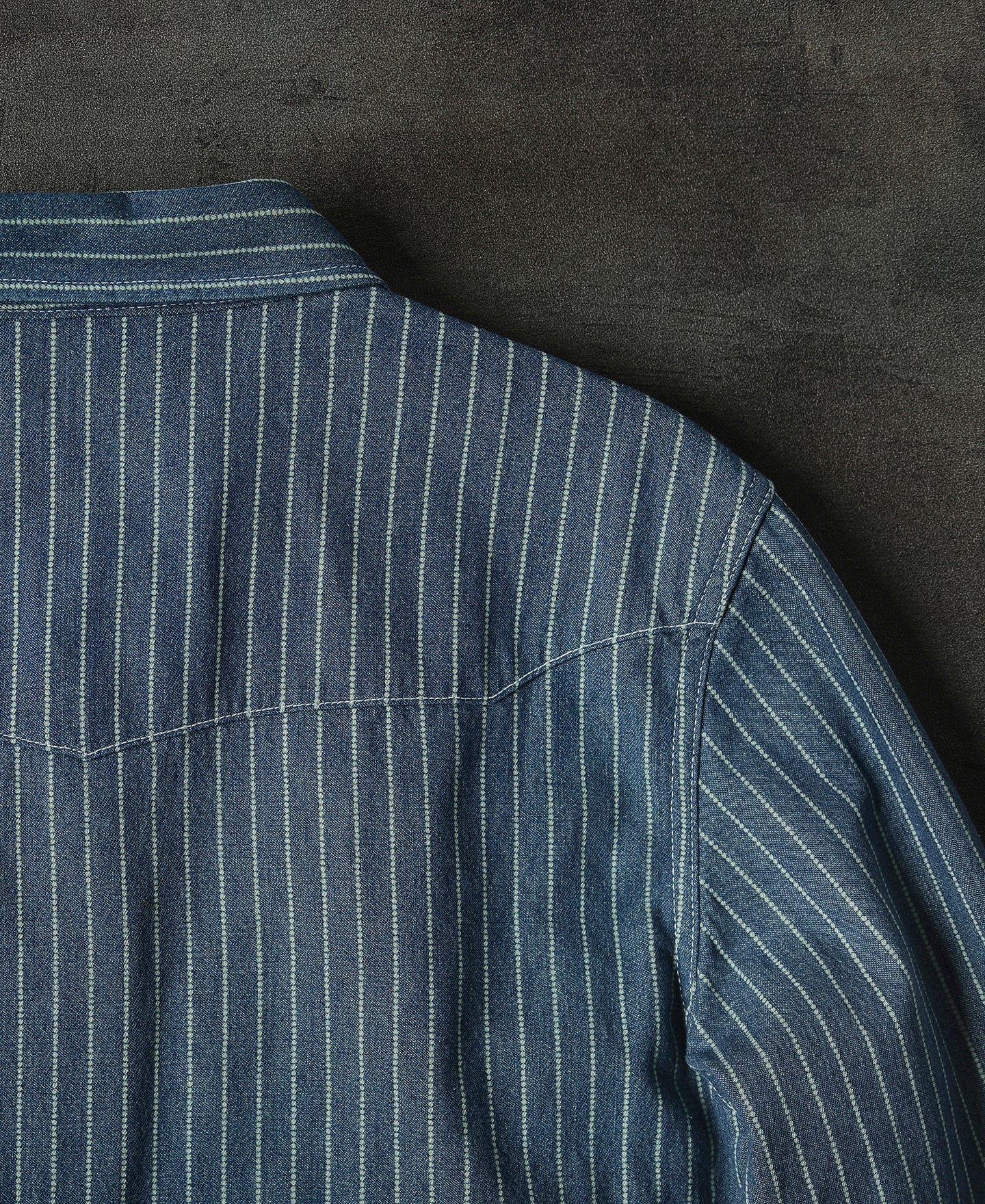 Fit cut, crafted from indigo denim fabric, this pair is adored with Wabash dot-stripe pattern. Authentic chain-stitching structure ensures durable construction. Custom high-rim snaps.