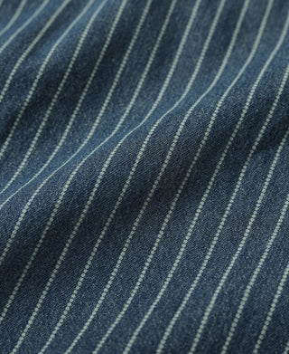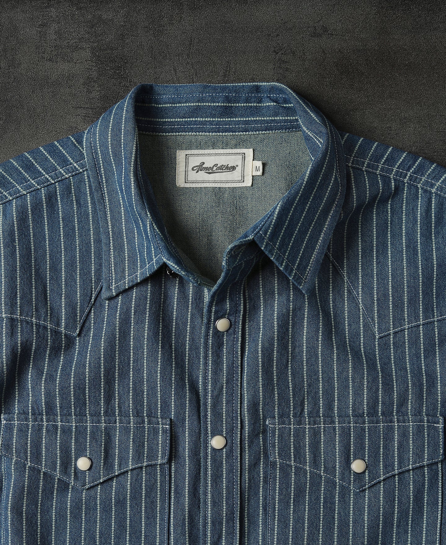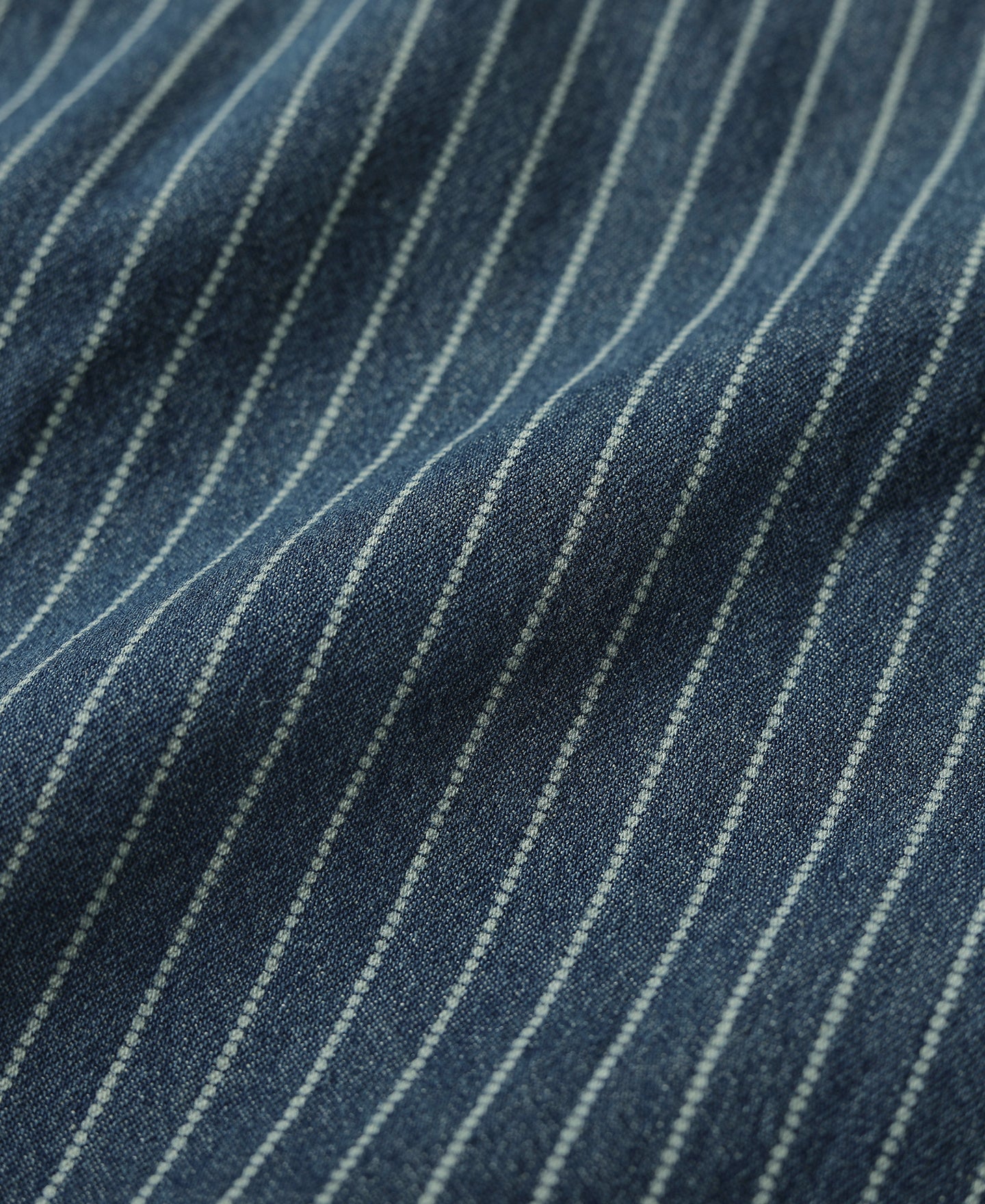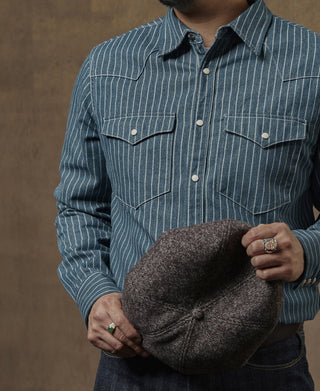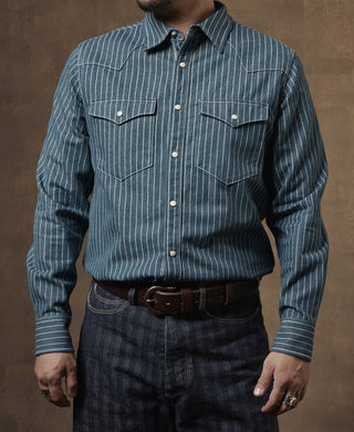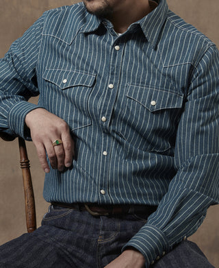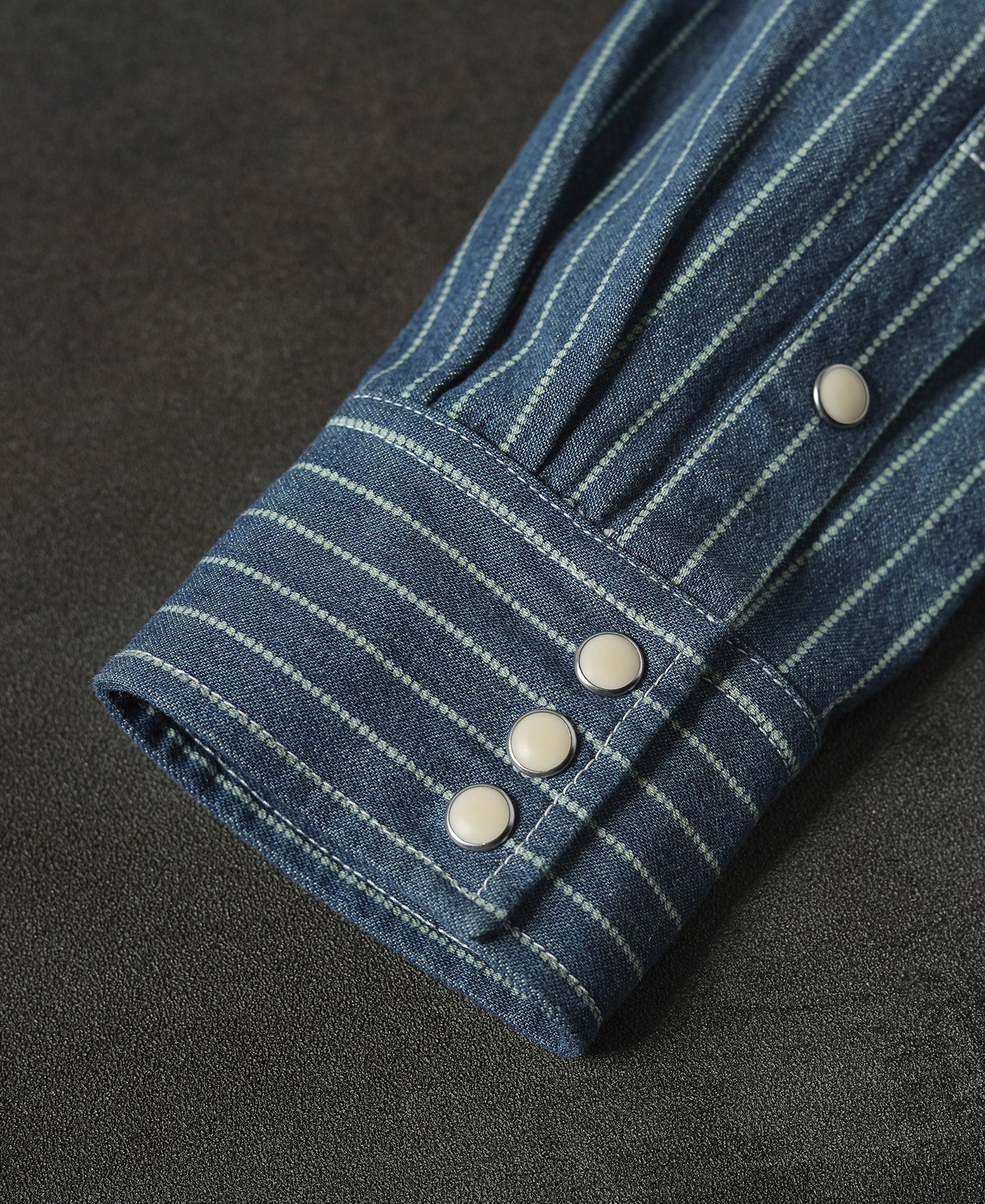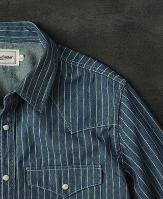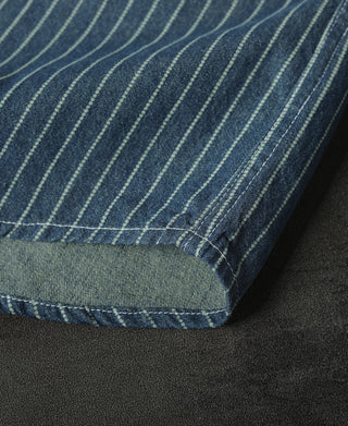 Fit cut, crafted from indigo denim fabric, this pair is adored with Wabash dot-stripe pattern. Authentic chain-stitching structure ensures durable construction. Custom high-rim snaps.