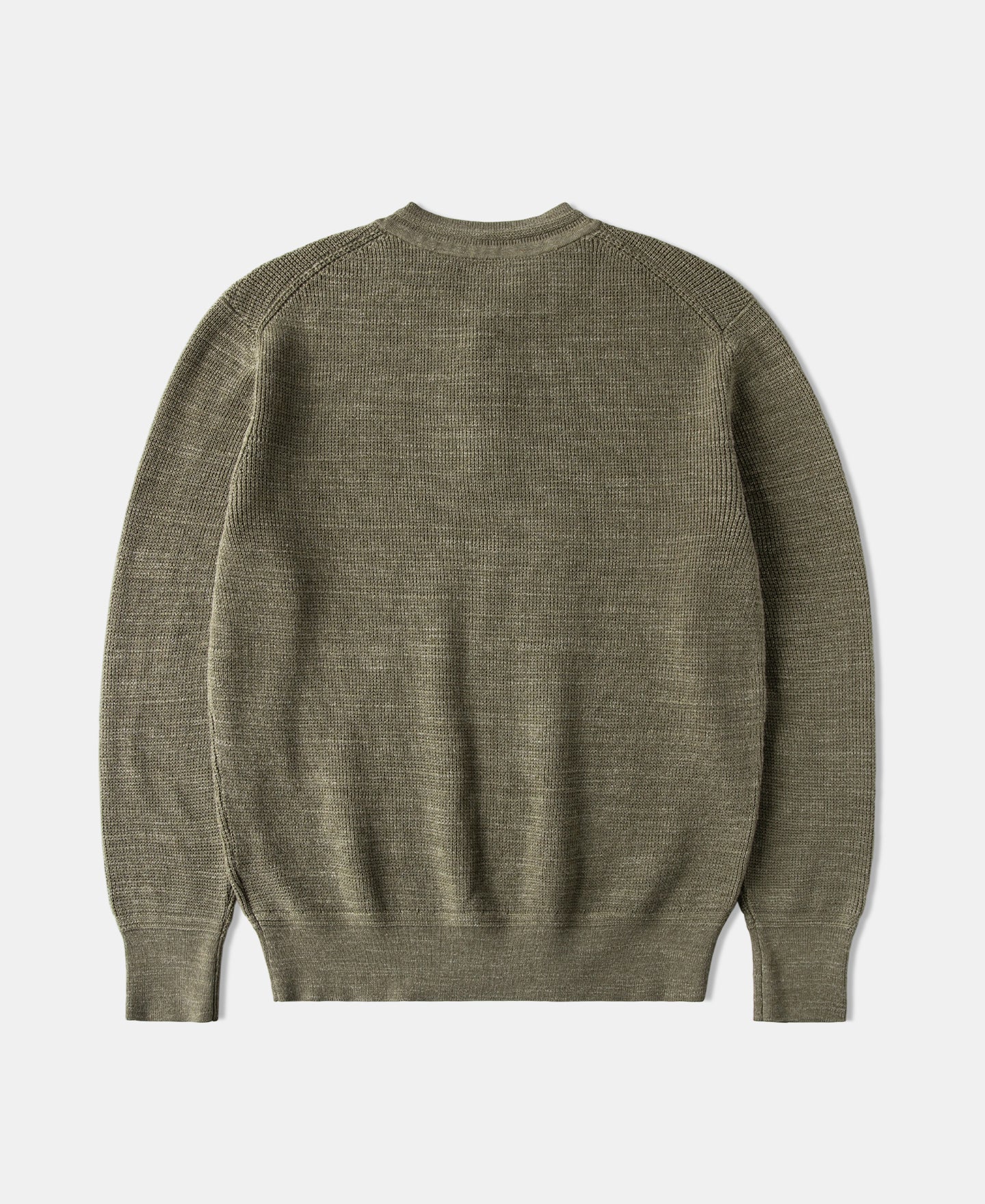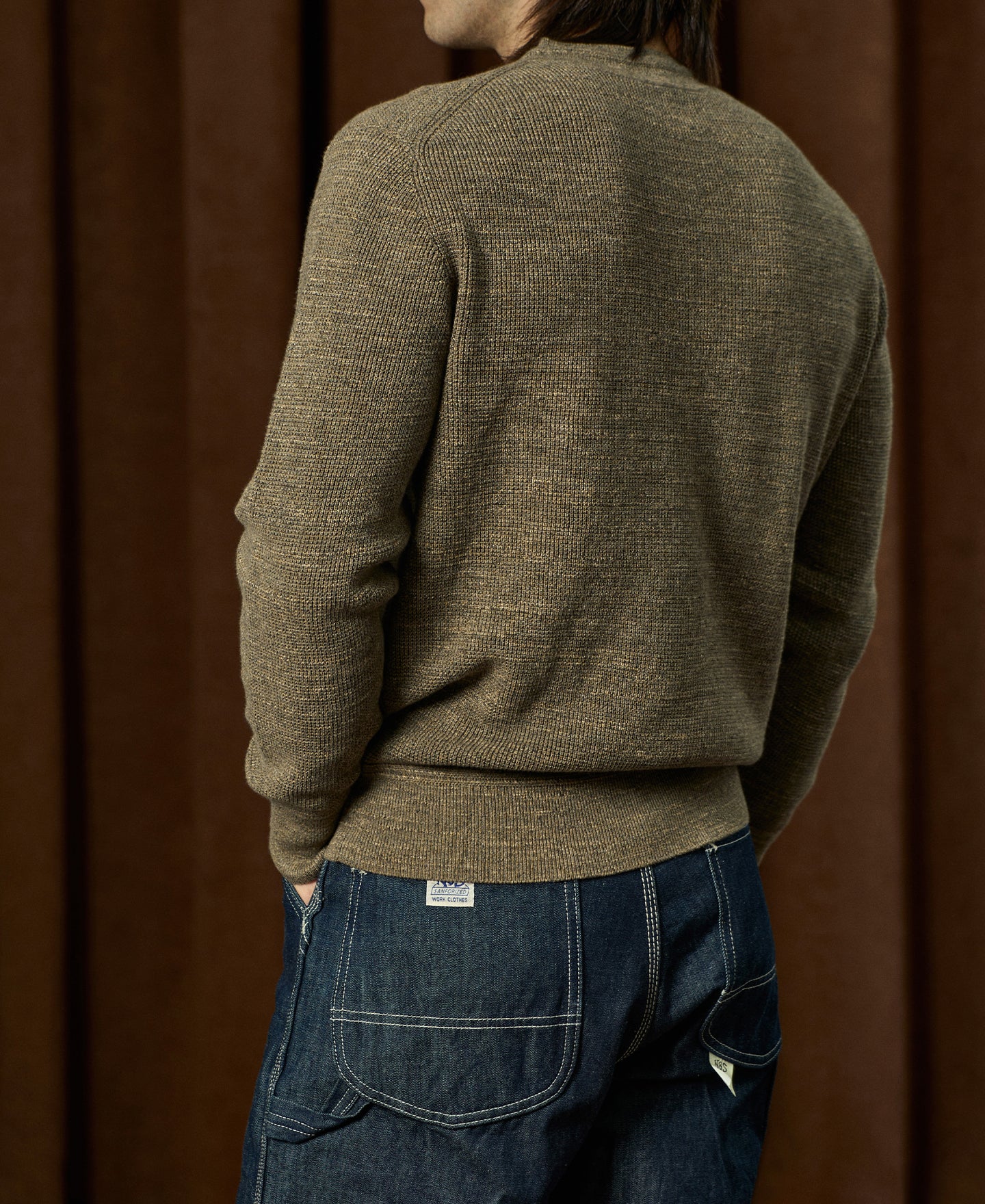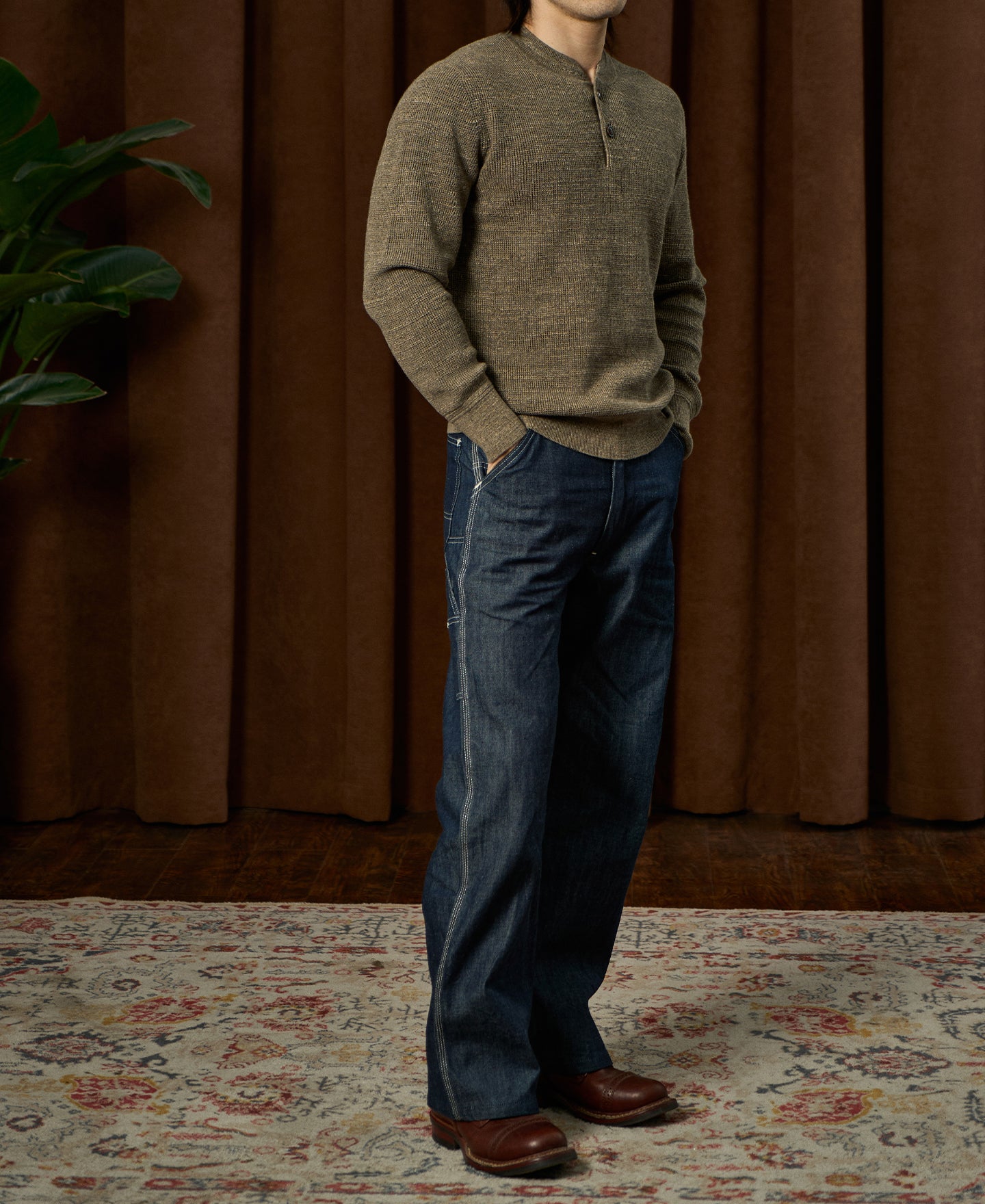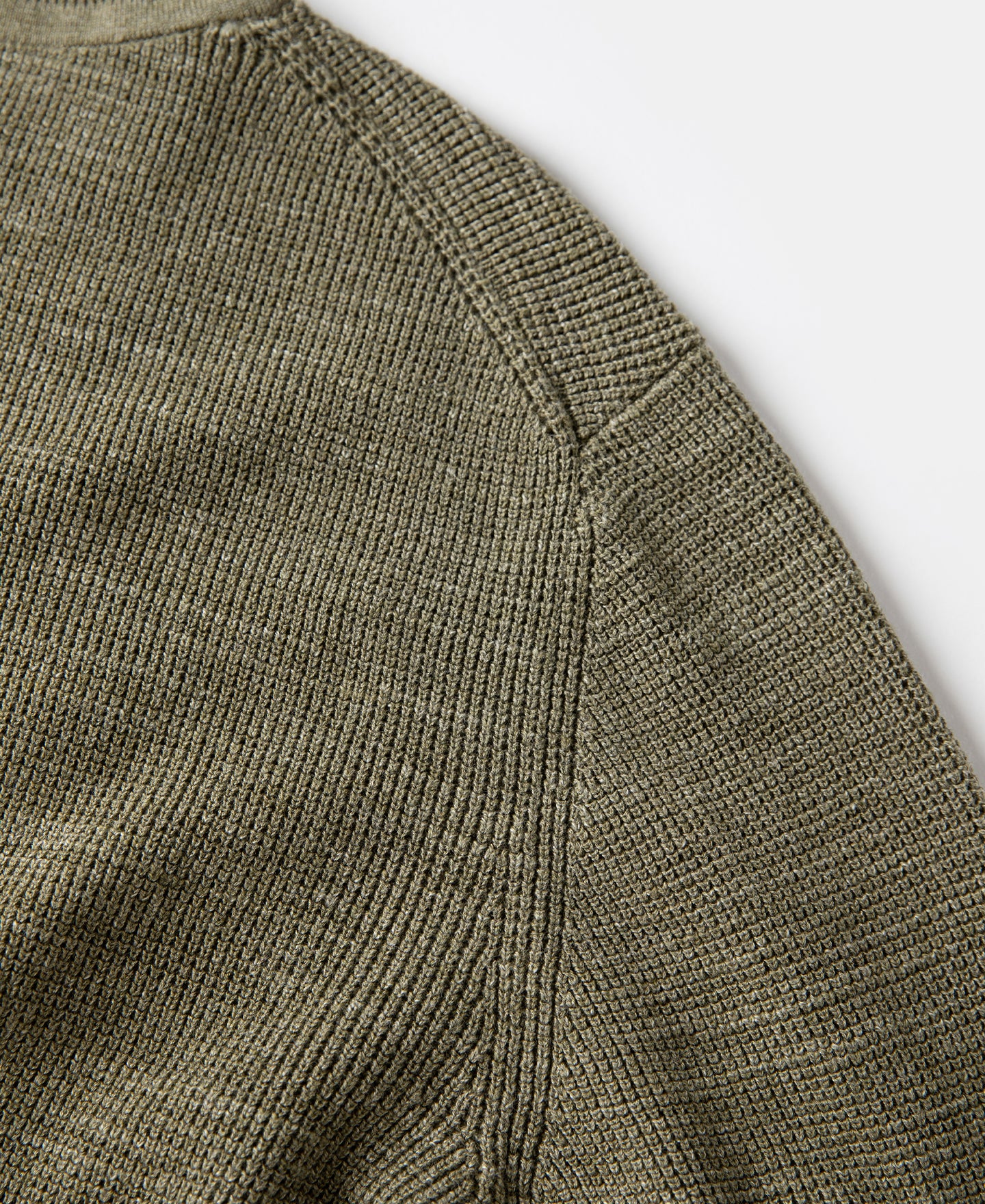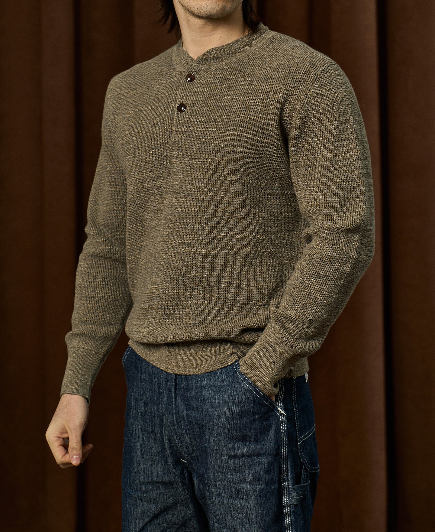 This two-button knitted Henley is crafted from a richly textured twisted melange yarn, combining classic waffle and seed stitch structures for a distinctive vintage look.