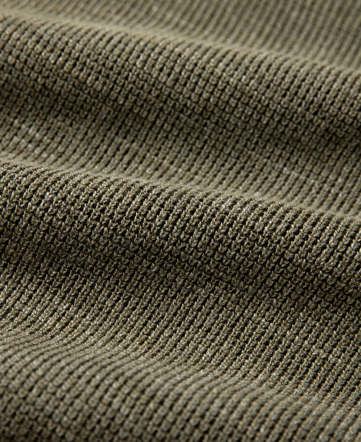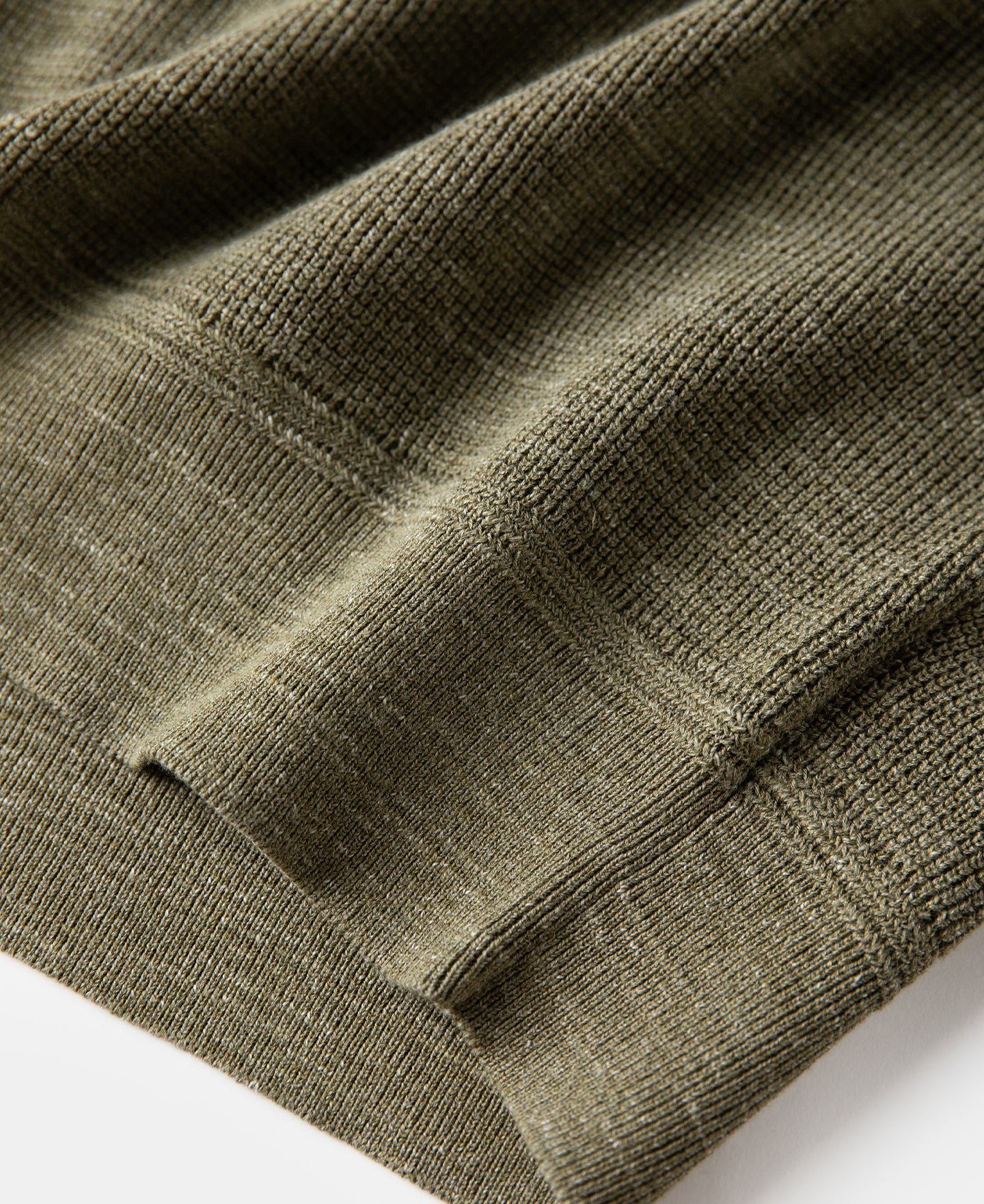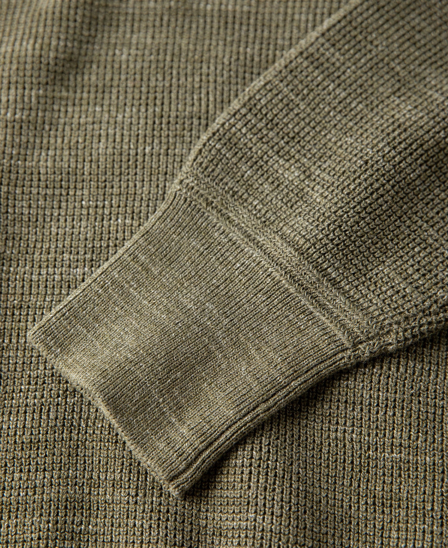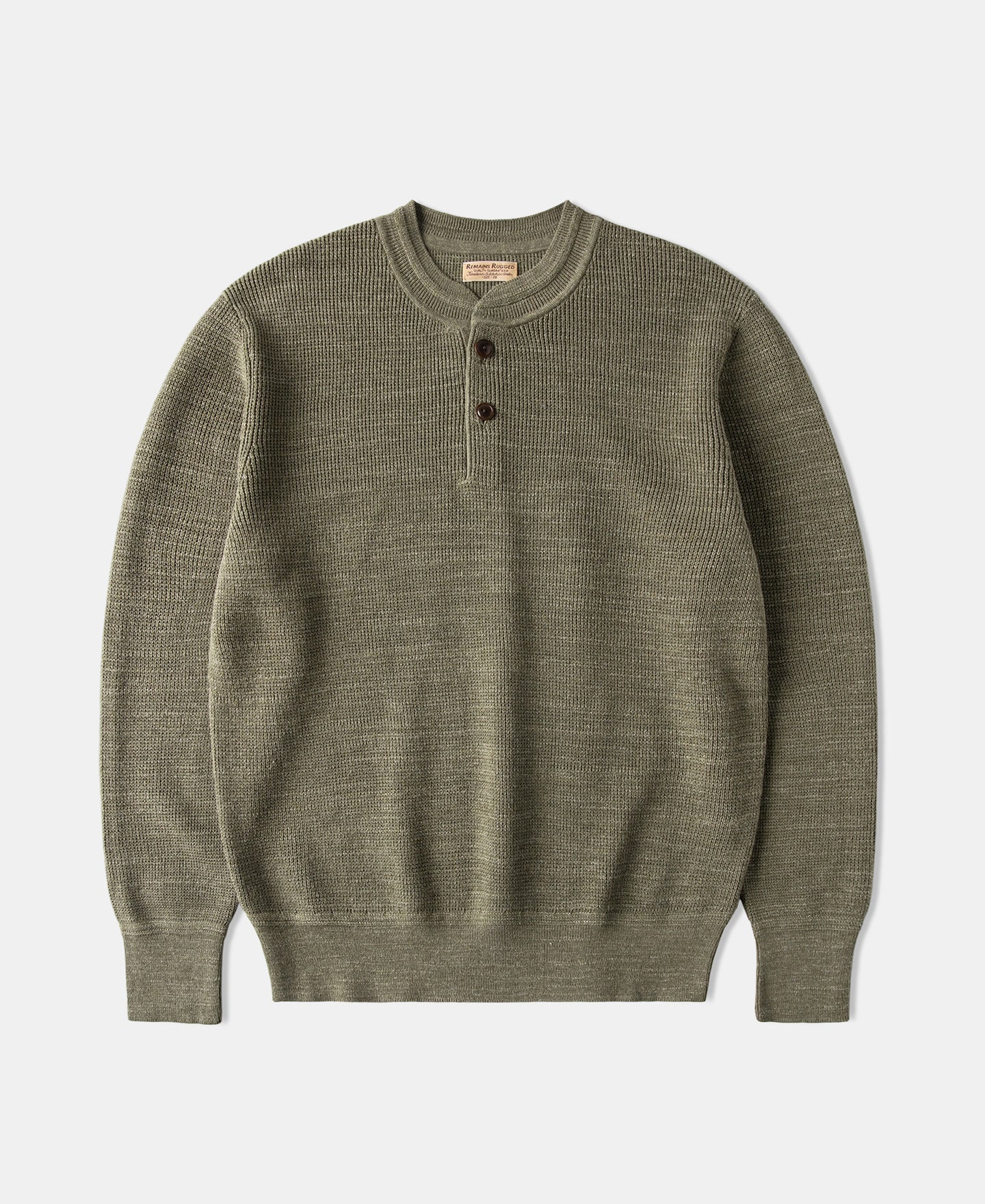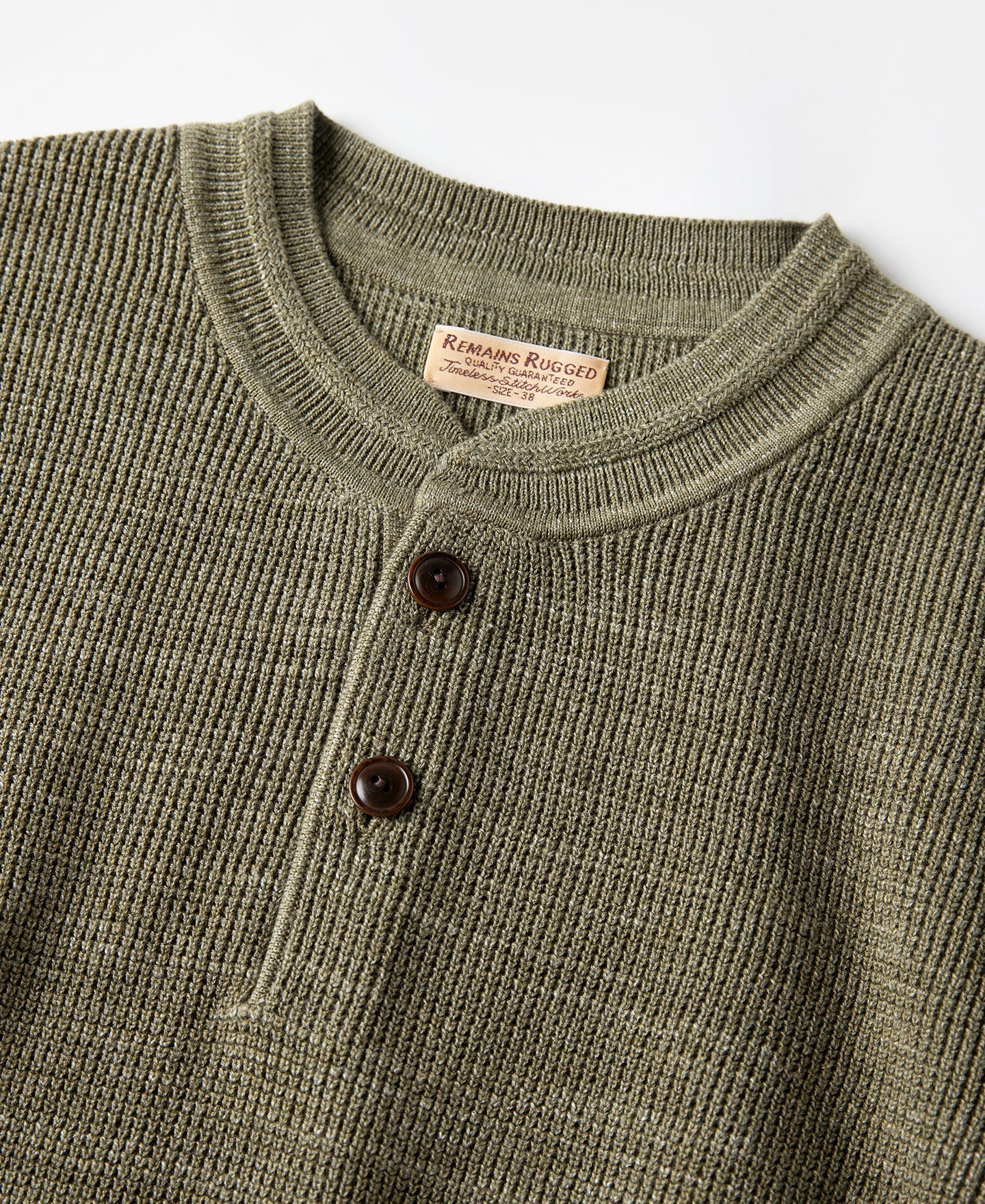 • This two-button knitted Henley is crafted from a richly textured twisted melange yarn, combining classic waffle and seed stitch structures for a distinctive vintage look.