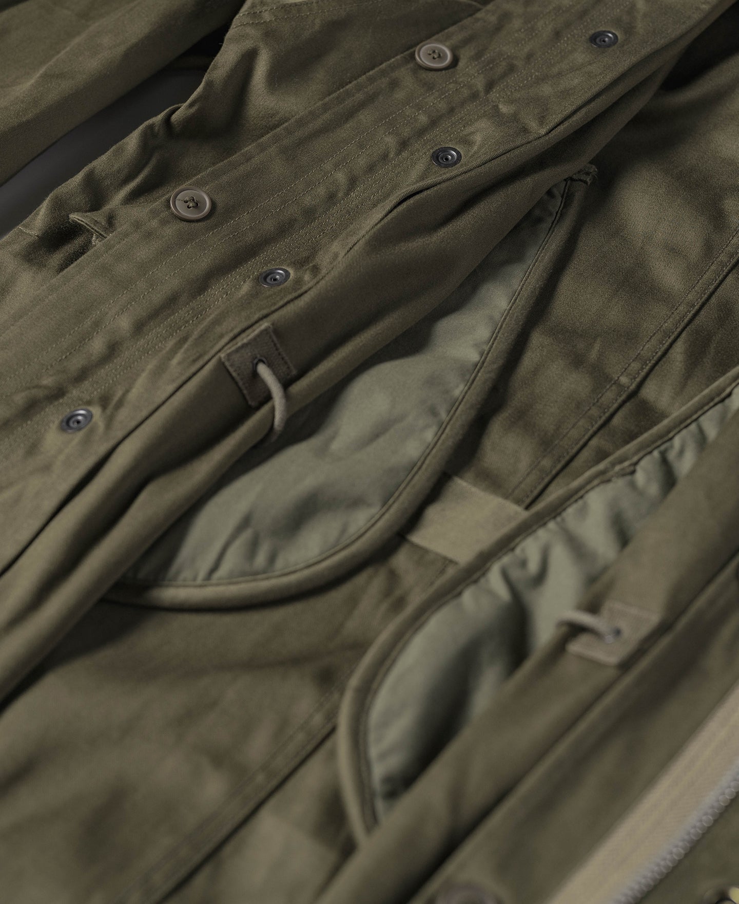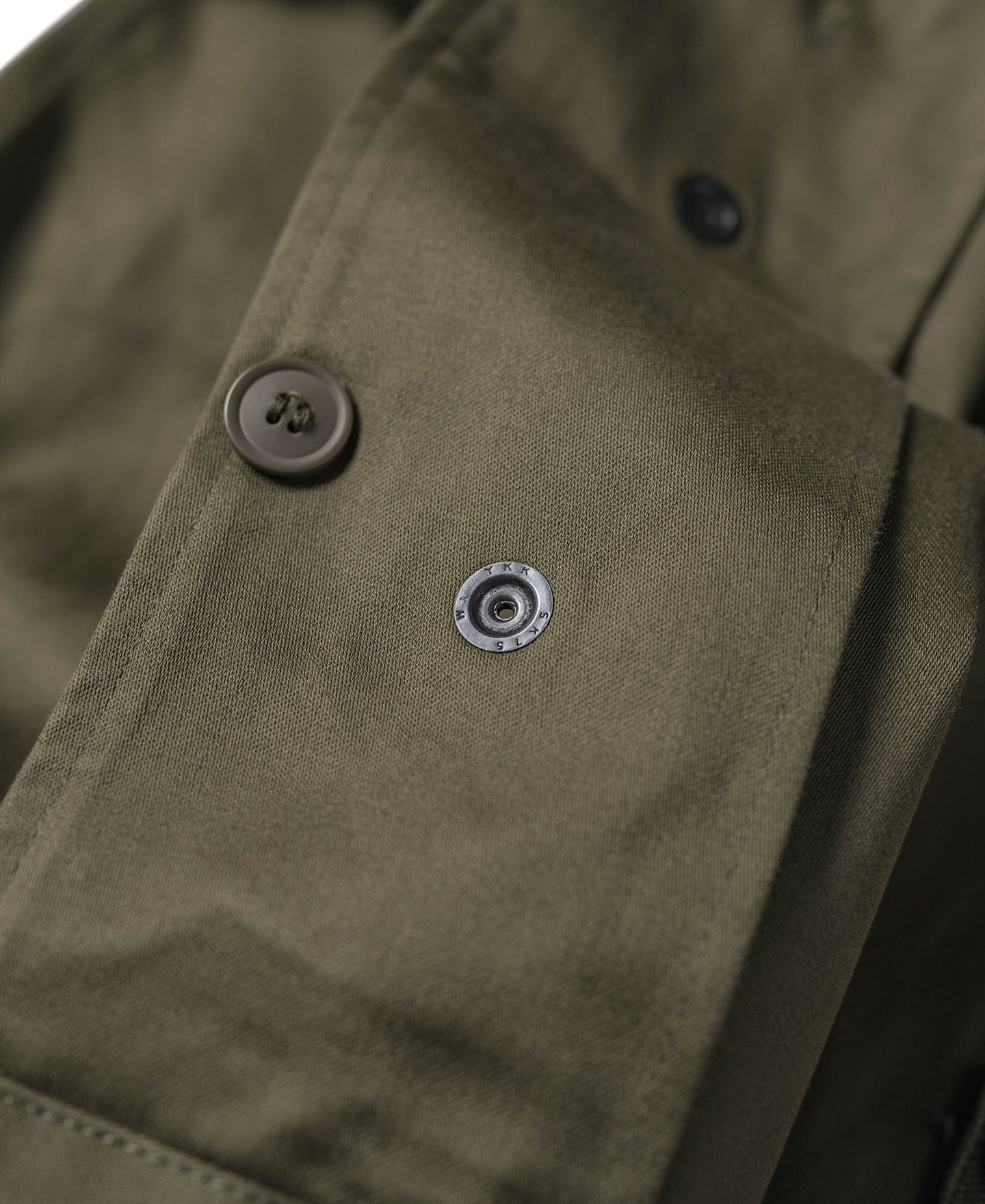 • A reproduction of the 1951 1st version M-51 Parka. It's crafted from 11.5 oz. cotton sateen fabric and features a Talon #10 brass zipper plated in tin color. The parka also includes internal marks made using the mimeograph process, faithfully replicating the details of the original version.