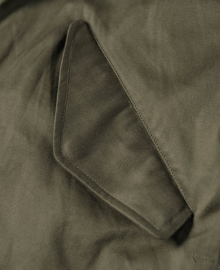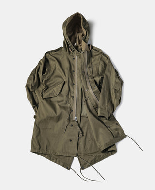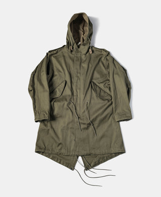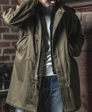 A reproduction of the 1951 1st version M-51 Parka. It's crafted from 11.5 oz. cotton sateen fabric and features a Talon #10 brass zipper plated in tin color. The parka also includes internal marks made using the mimeograph process, faithfully replicating the details of the original version.