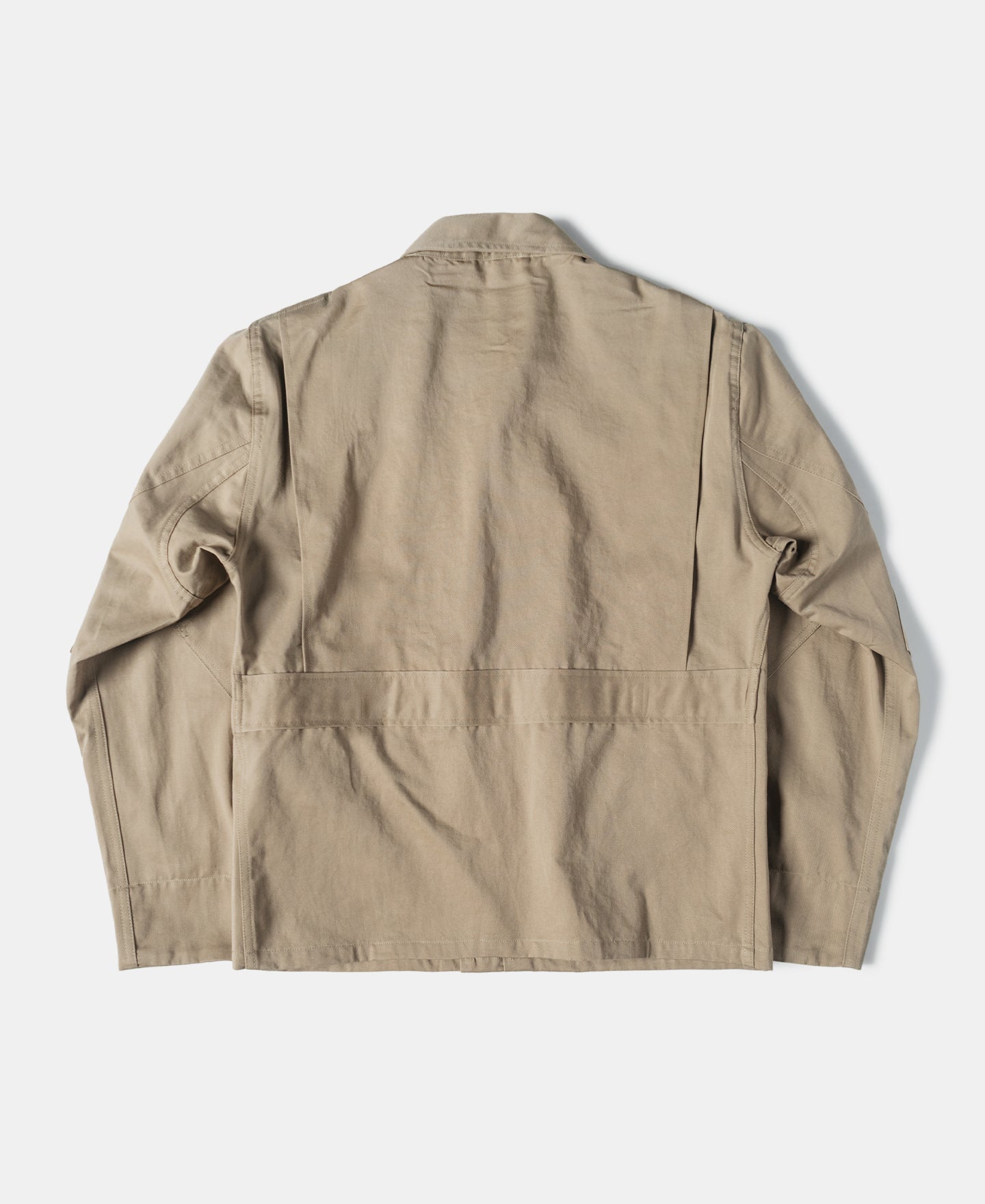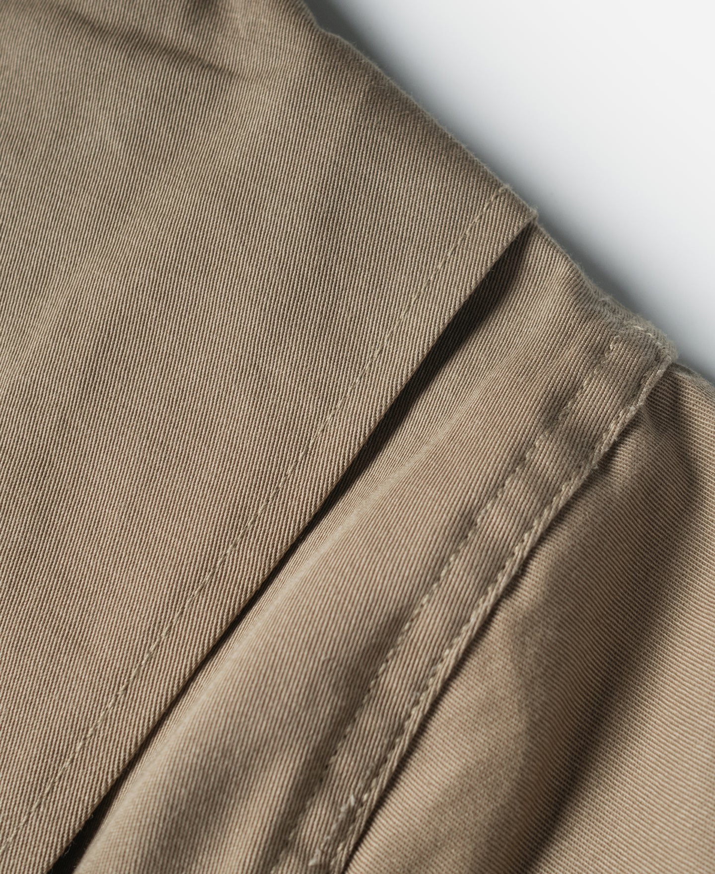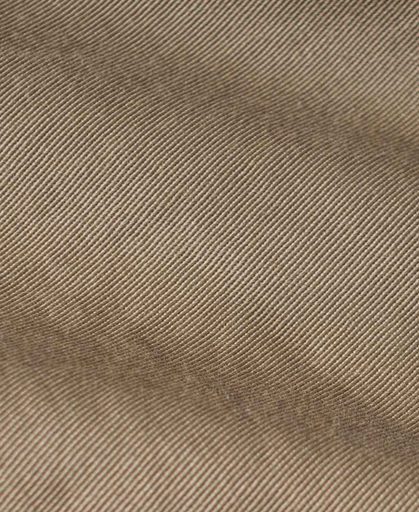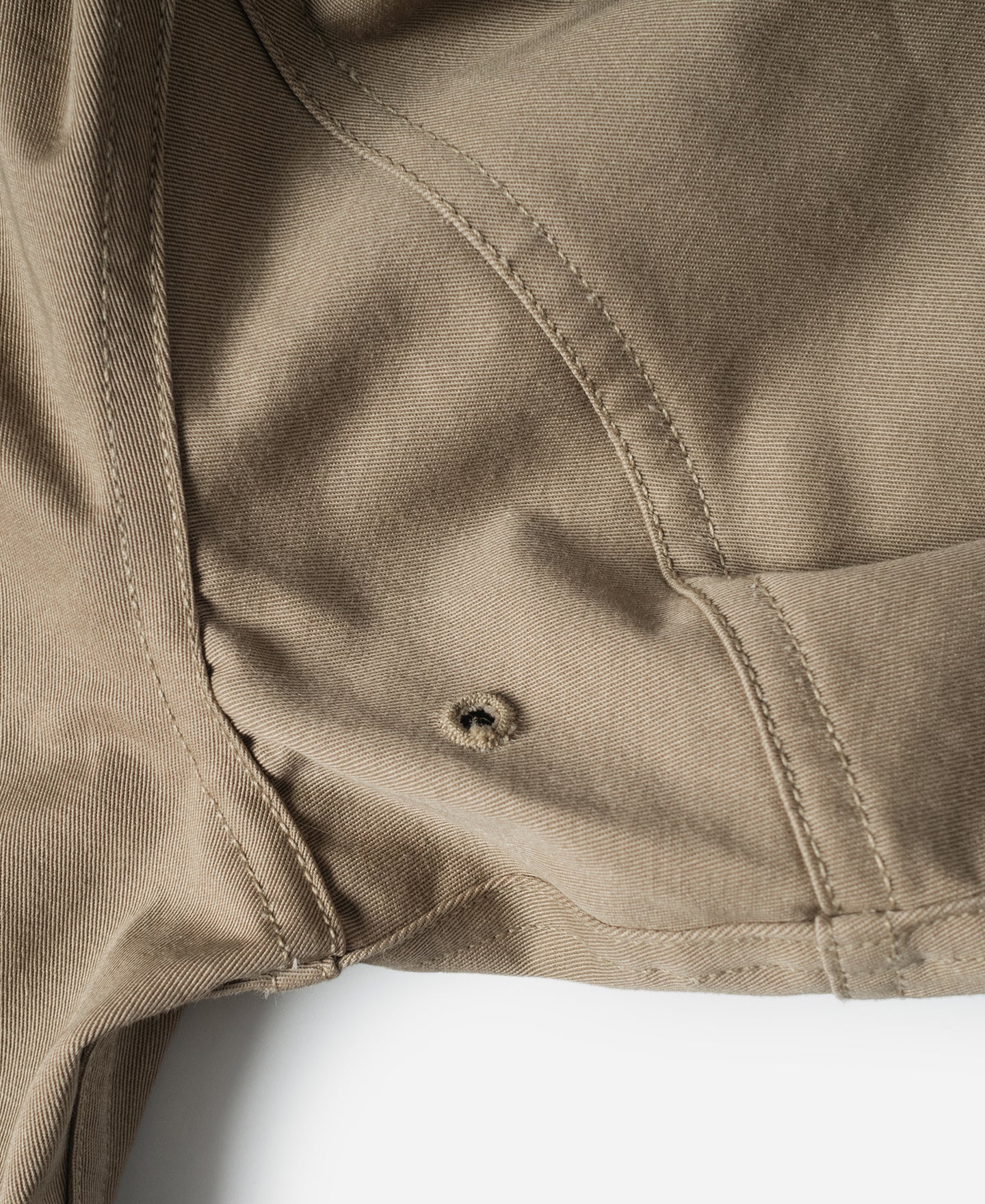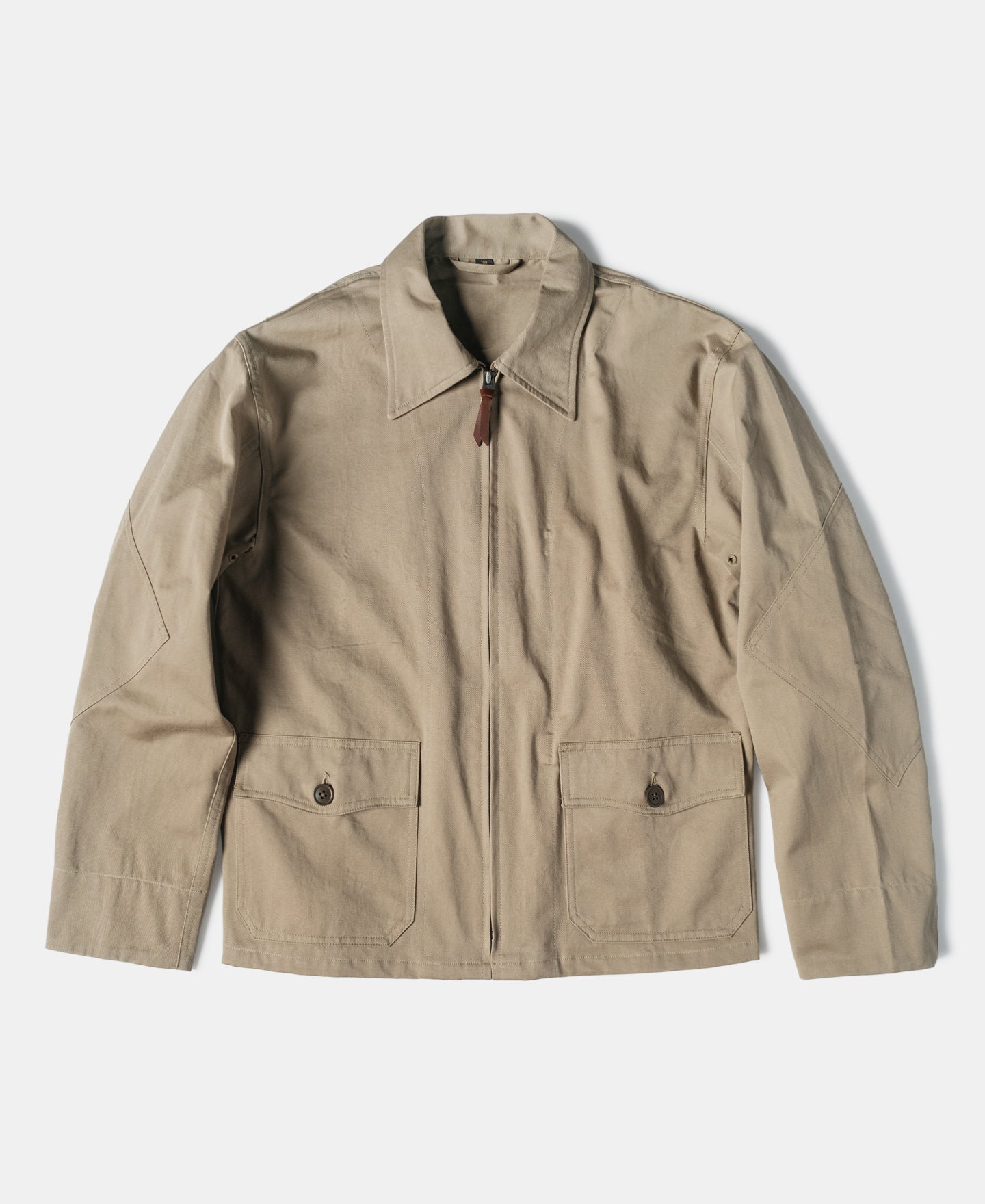 The jacket is made of combed twill with a natural gloss finish and features a nickel-plated Talon #5 zipper, cowhide side, and vintage bottom stop. The slightly curved sleeve body is cut, and the triangular cut under the arm and the pleats on the back make it easier to move. The slightly closed waist and hem make for a crisp bomber jacket.