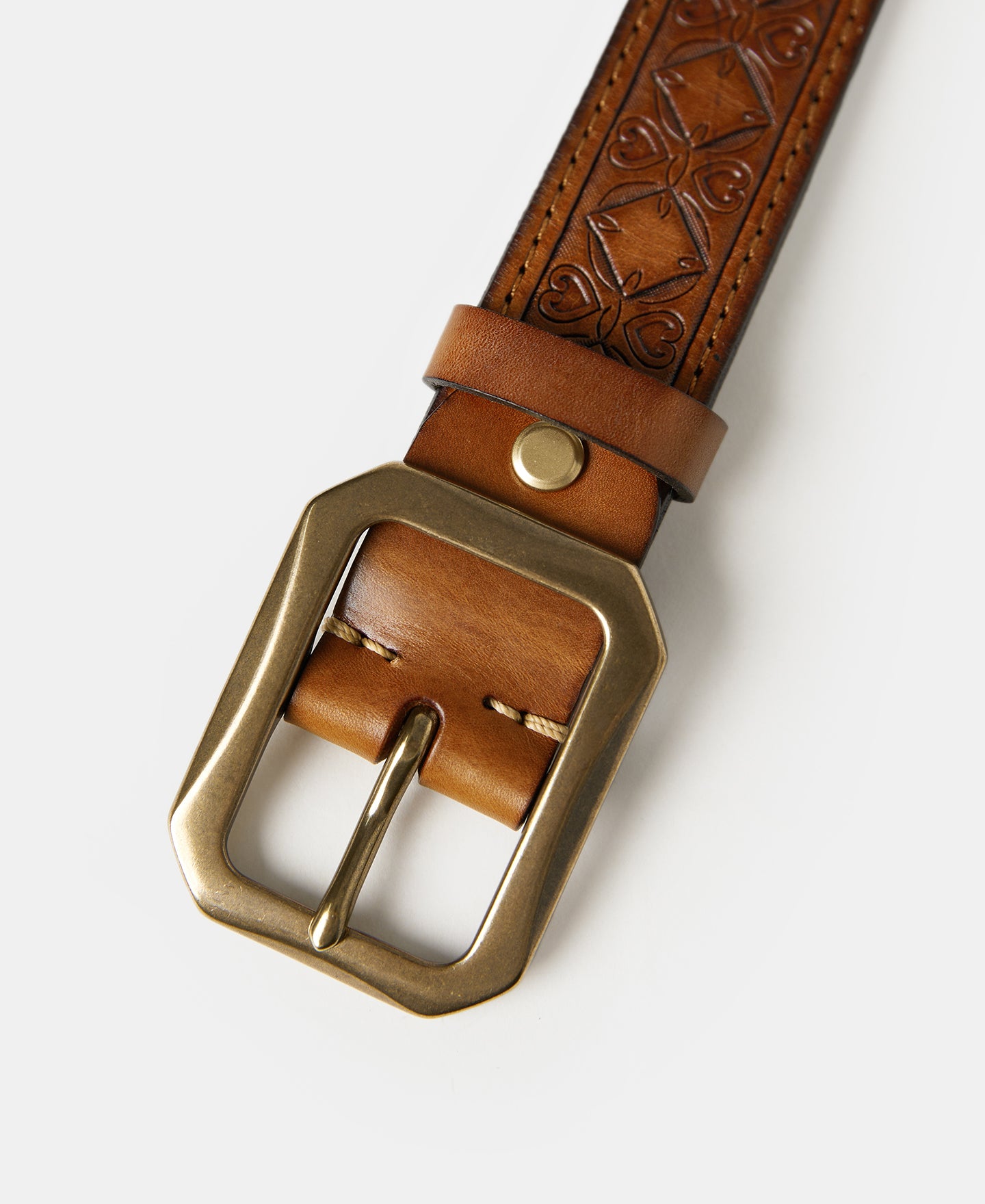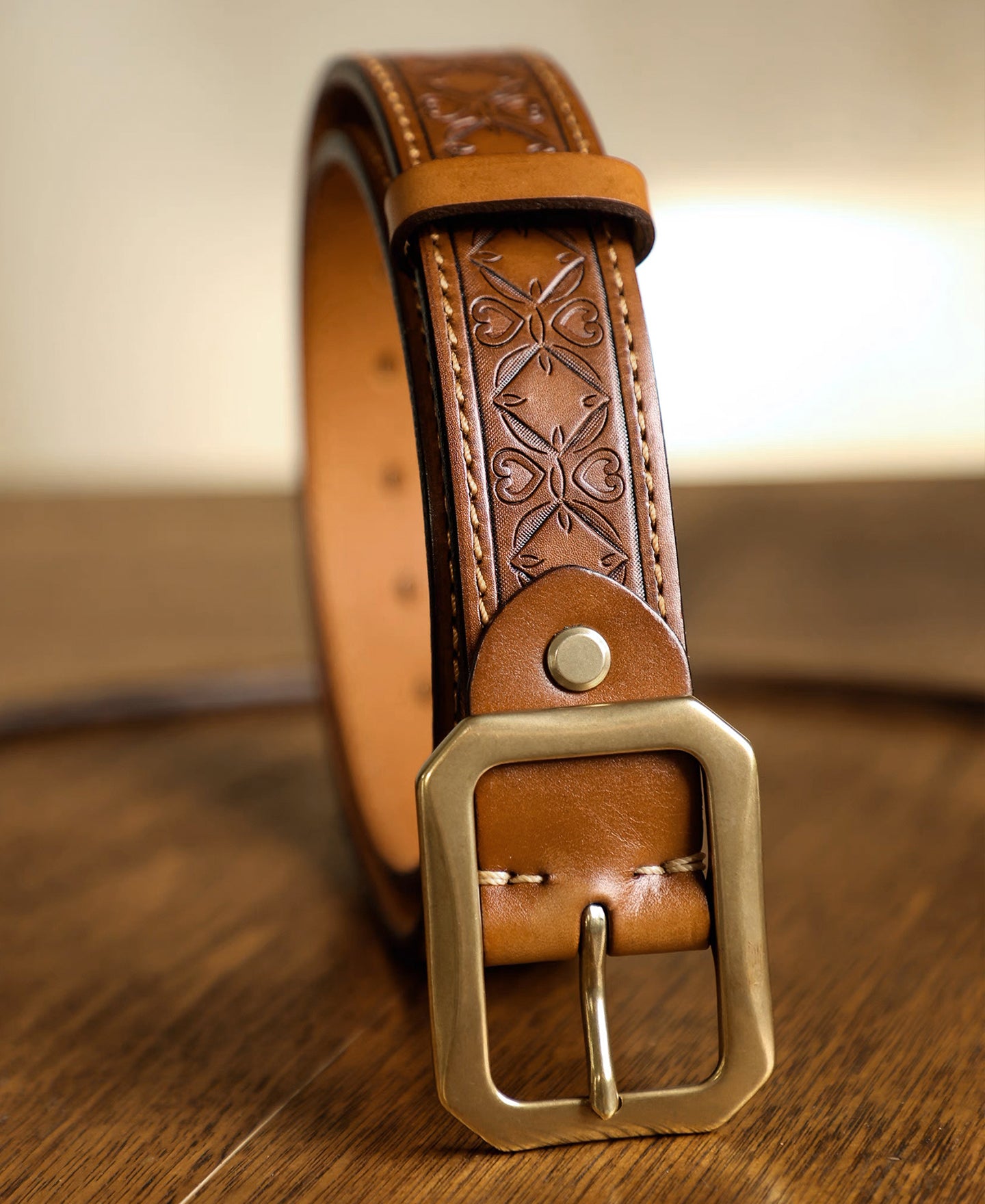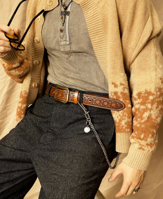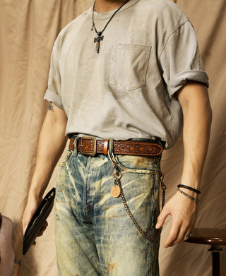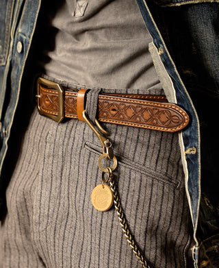 This belt is crafted from full-grain leather sourced from Tuscany, Italy. With intricate Western-inspired tooled details, it combines rugged durability with classic style. It features a double-stitched construction, providing added strength and a timeless look. Its solid brass buckle ensures lasting quality, while the belt’s moderate stiffness offers a structured feel that gradually softens and conforms with wear. This versatile piece pairs effortlessly with workwear, denim, or casual attire, making it an essential addition to any wardrobe.
