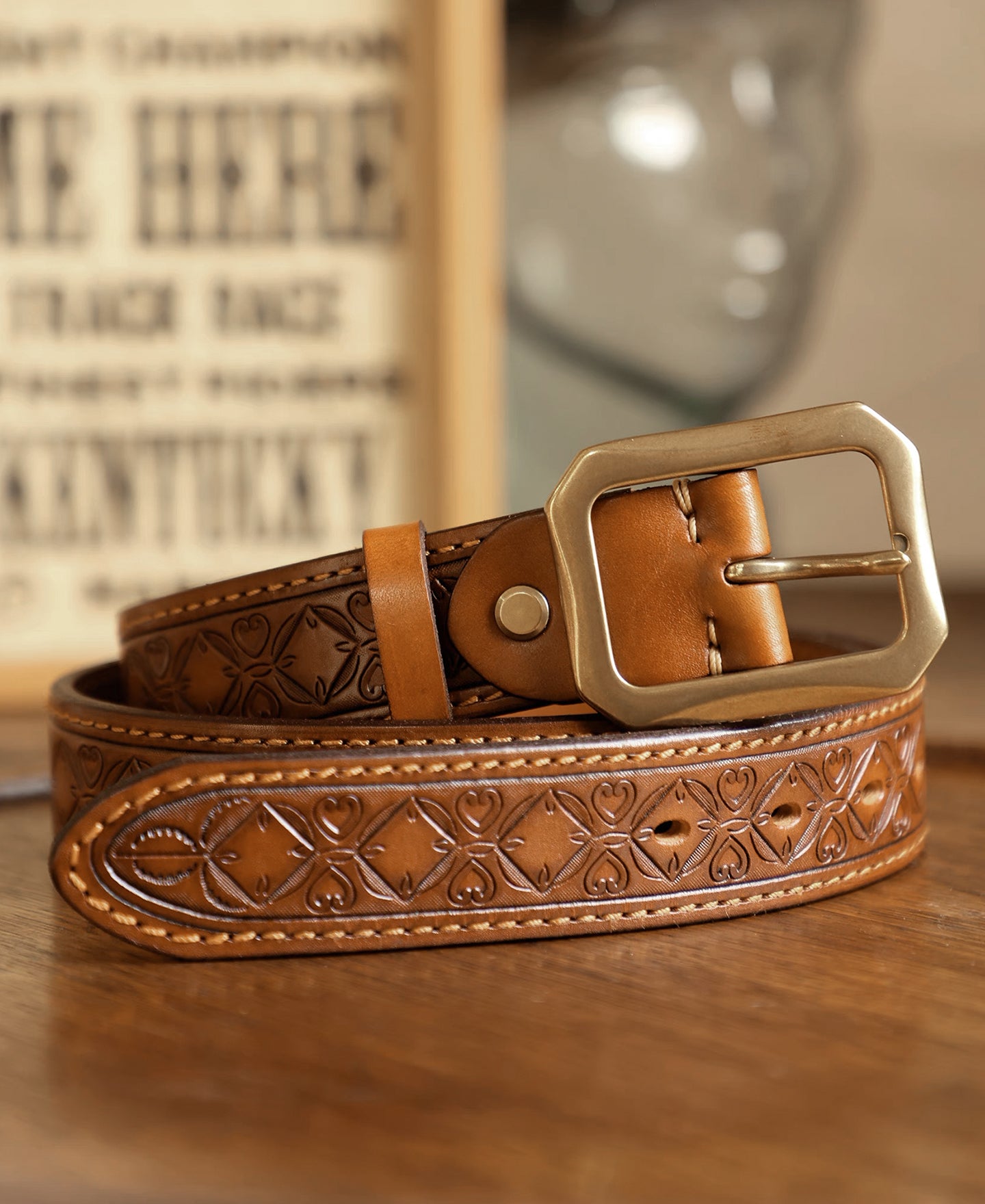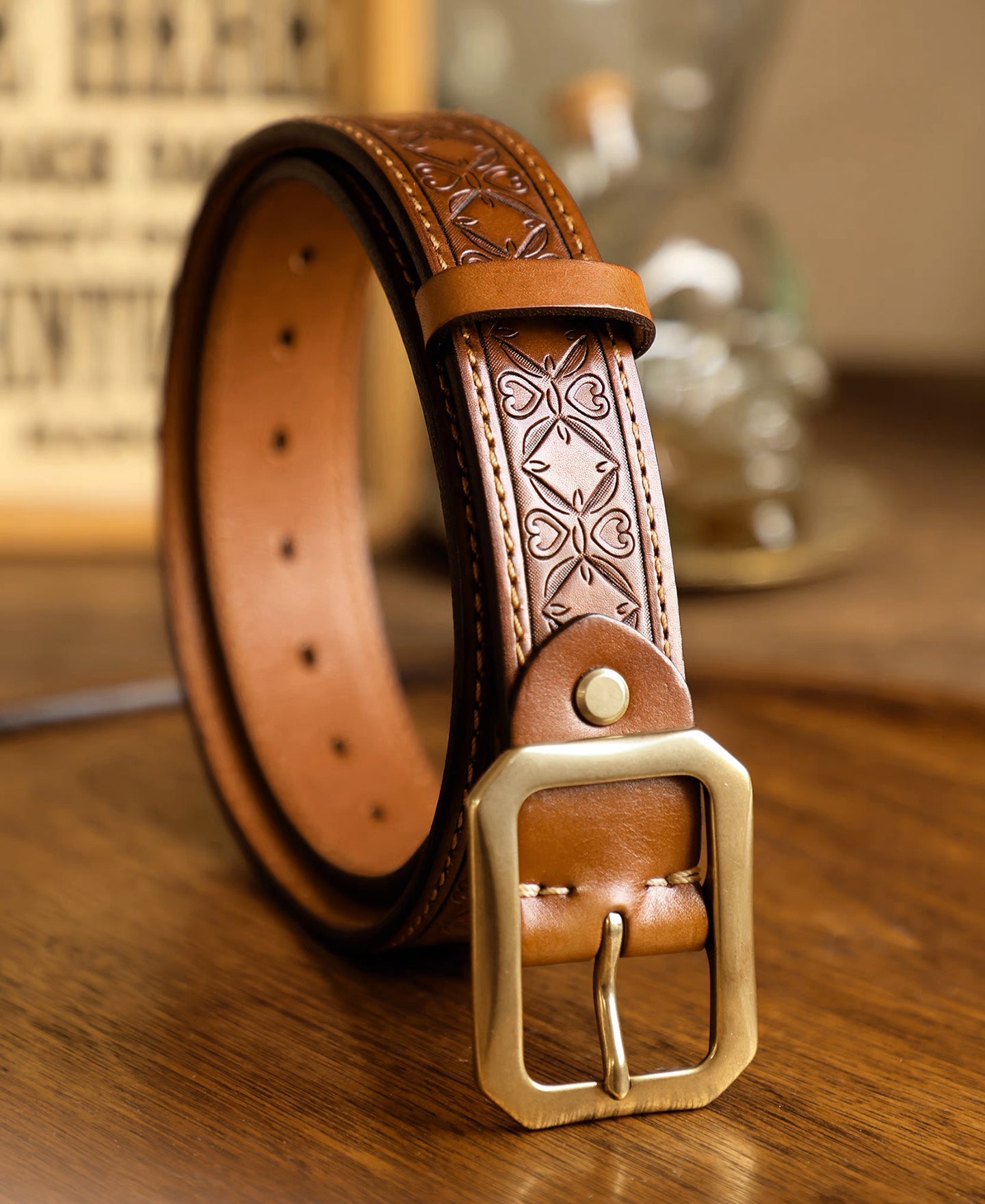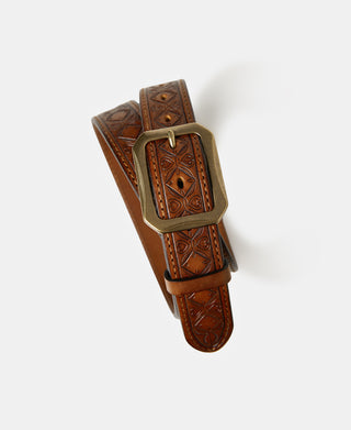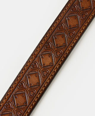 • This belt is crafted from full-grain leather sourced from Tuscany, Italy. With intricate Western-inspired tooled details, it combines rugged durability with classic style. It features a double-stitched construction, providing added strength and a timeless look. Its solid brass buckle ensures lasting quality, while the belt’s moderate stiffness offers a structured feel that gradually softens and conforms with wear. This versatile piece pairs effortlessly with workwear, denim, or casual attire, making it an essential addition to any wardrobe.